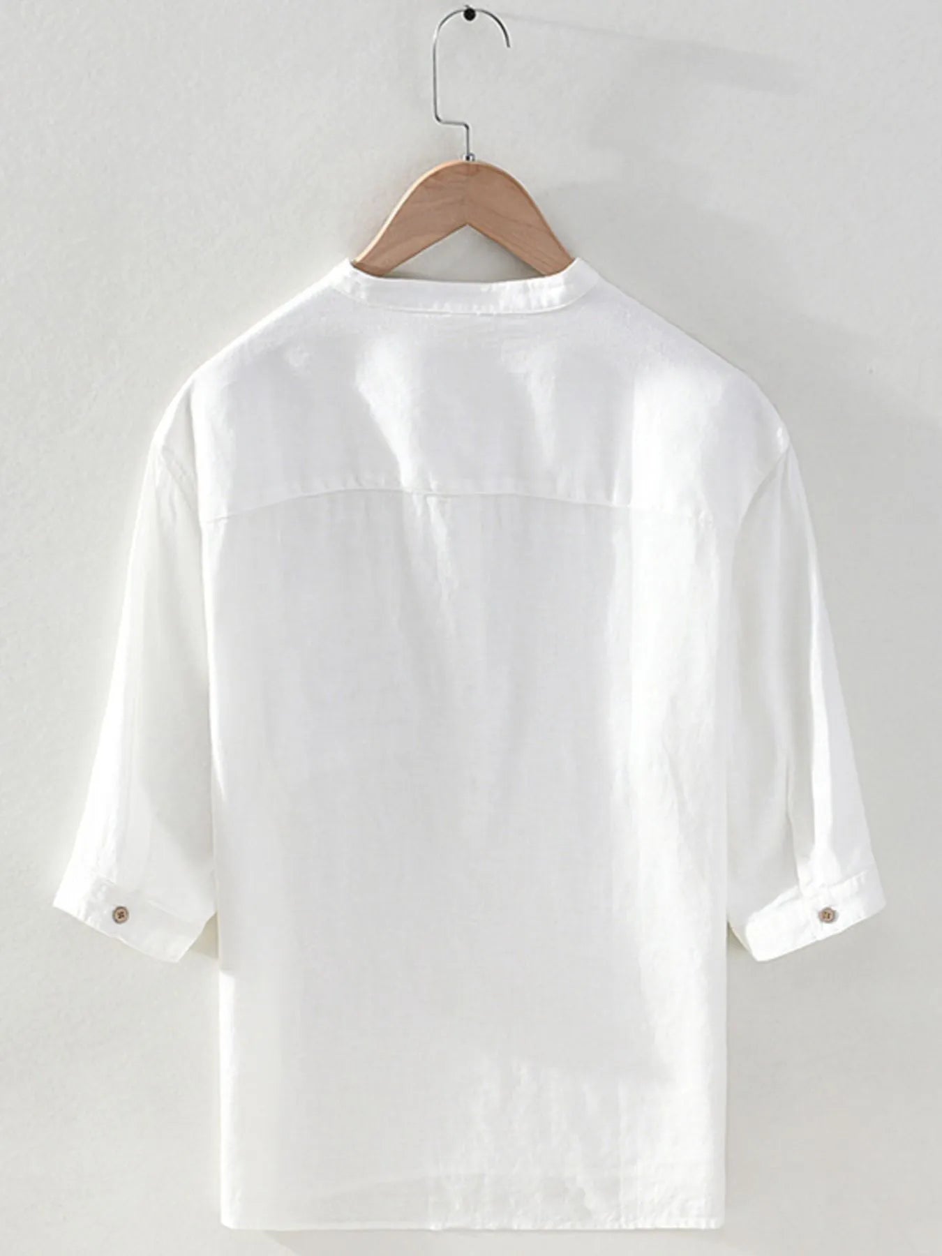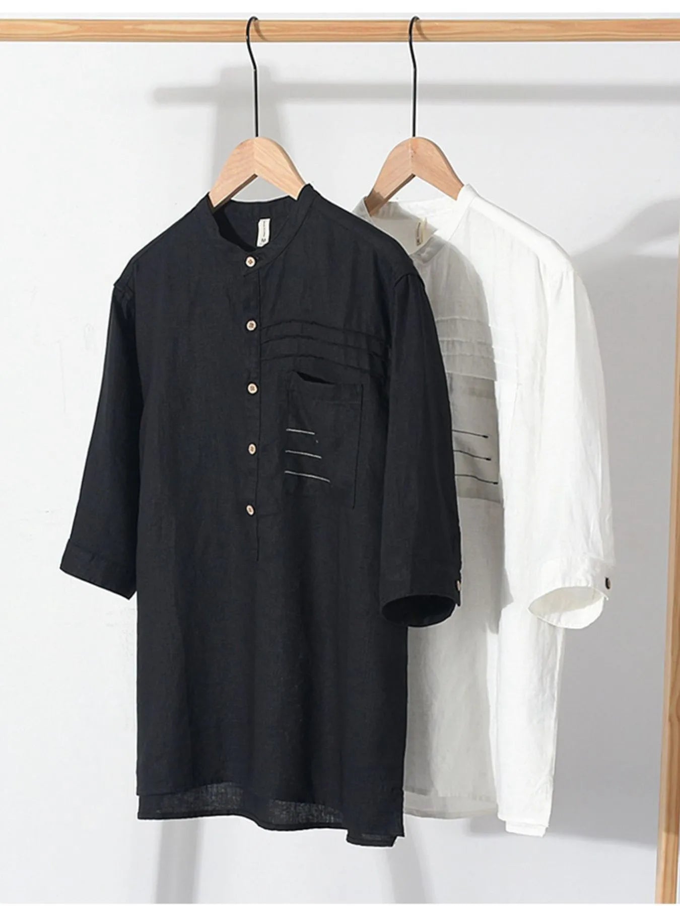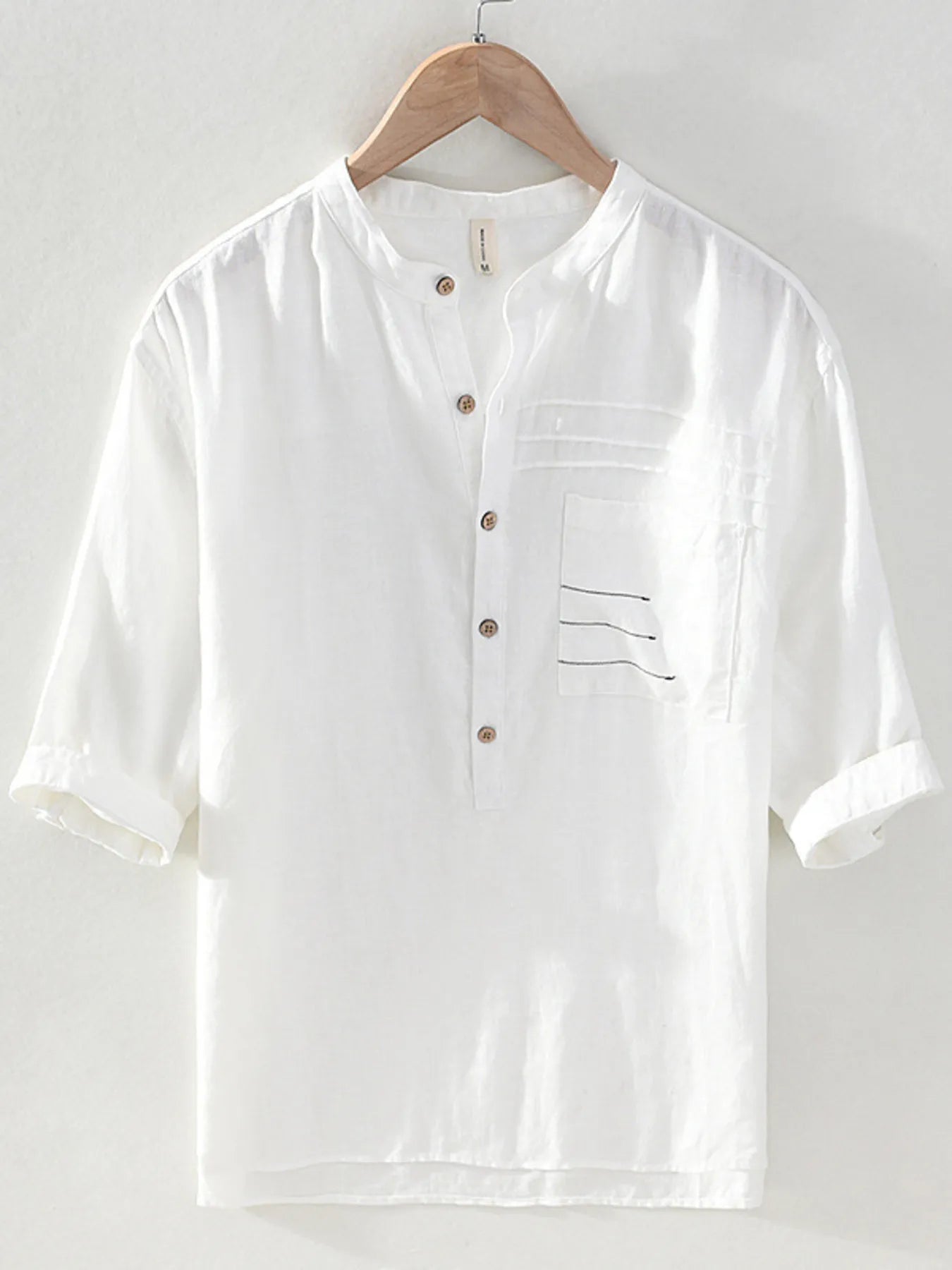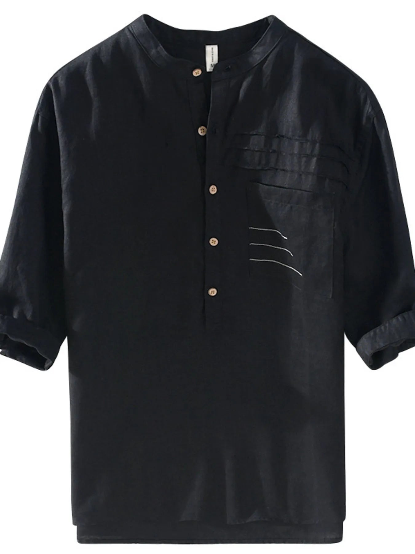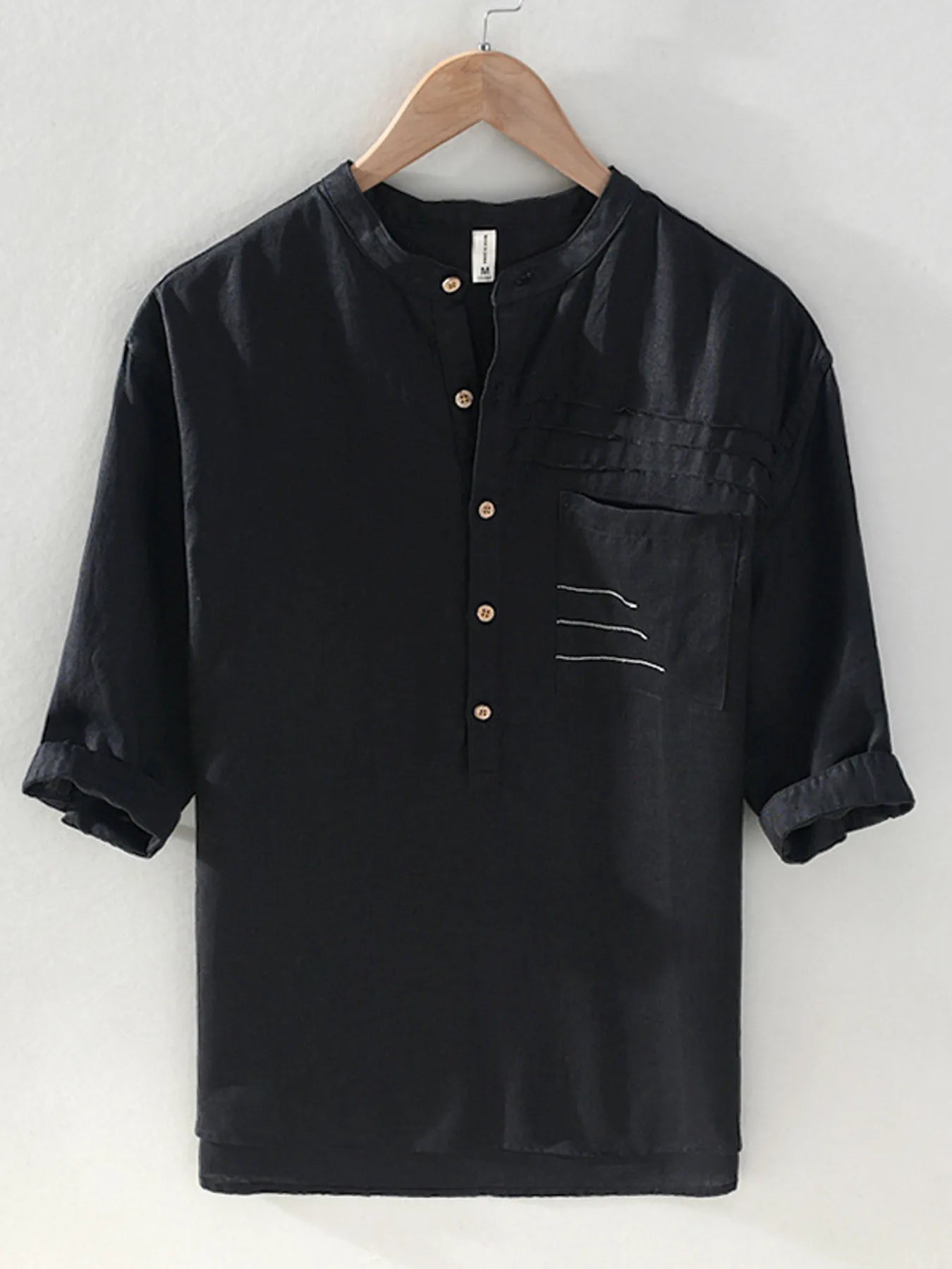 - Features:Buttoned Henley, 3/4 rolled sleeve, Pocket