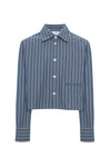 Ladies Cropped Striped Button Down Blouse with Center Back Box Pleat