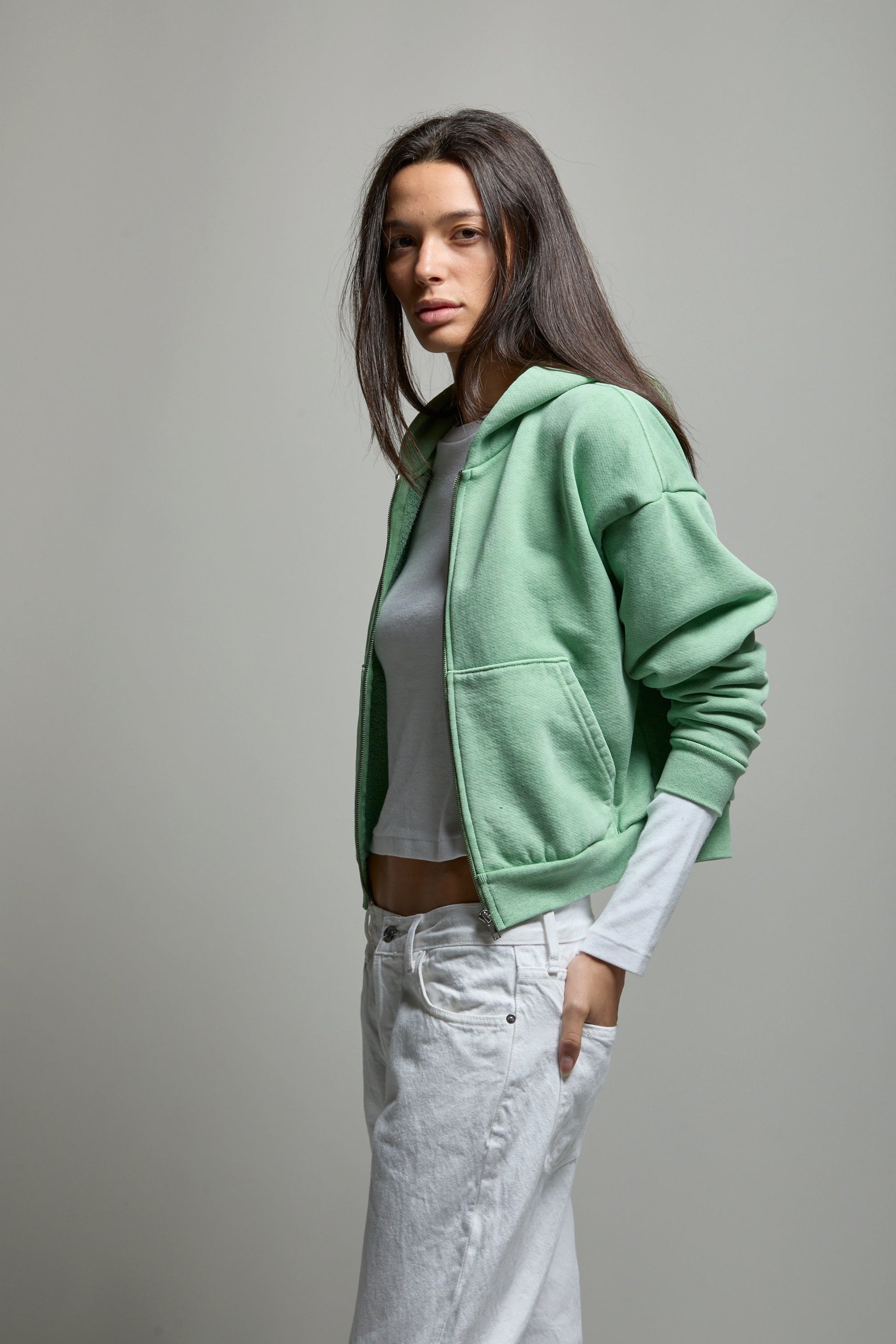 The Rosie is a boxy slightly cropped zip hoodie, featured in our signature heavy yet fluffy vintage cotton fleece. 100% Cotton. Front zip enclosure. Kangaroo Pocket.