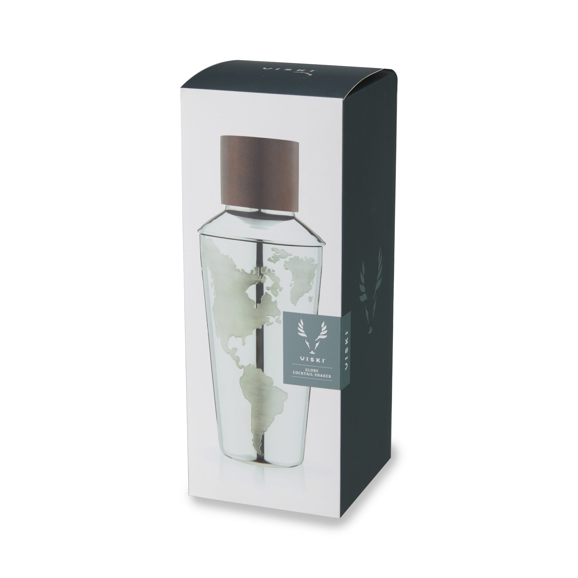 Adorned with the contours of the globe, this 3-piece cobbler cocktail shaker is a wanderer's dream. The detailed shapes of each continent have a slightly distressed look, recalling antique maps, while the compass etched into the wood cap completes this traveler’s barware.
