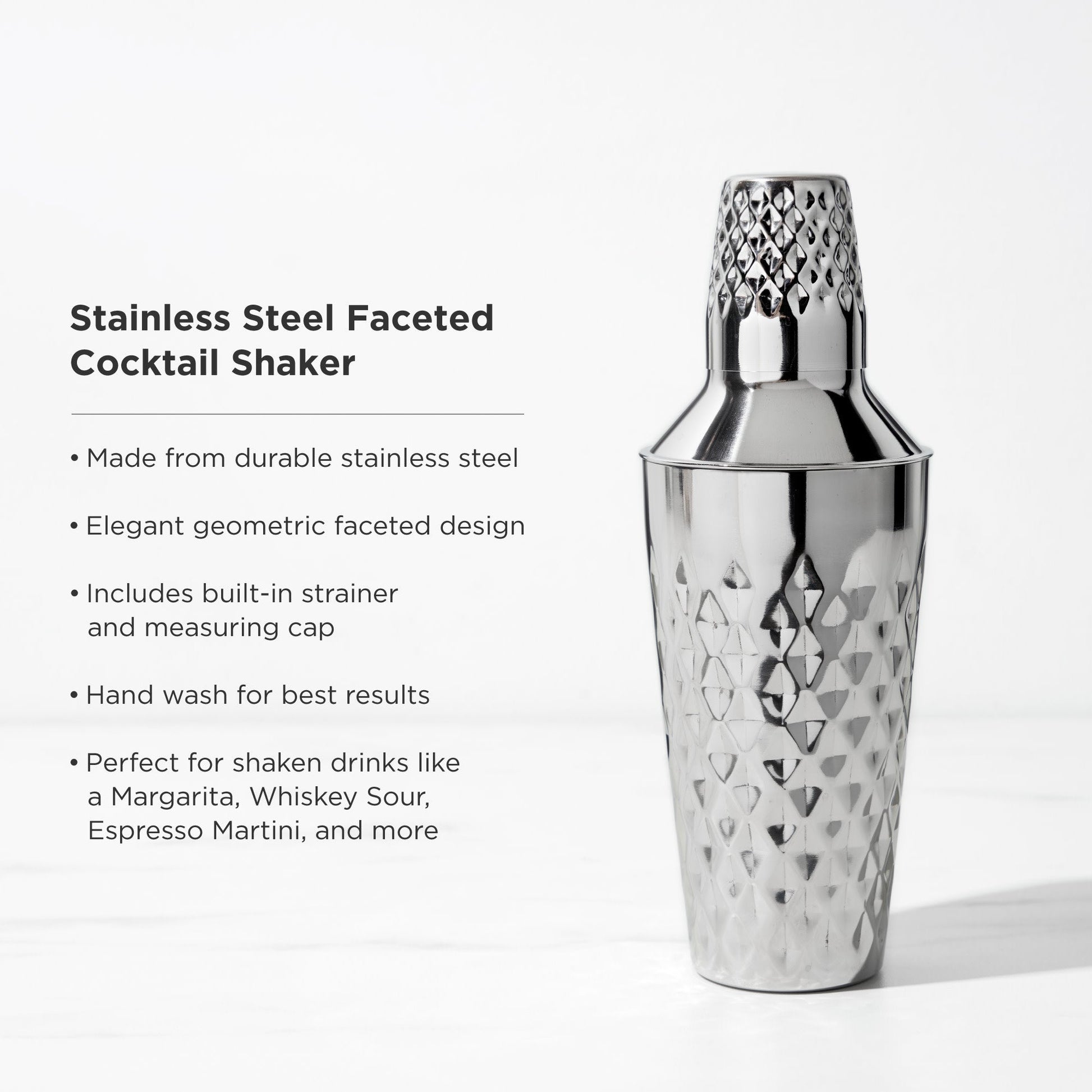 Divited with diamond shapes to catch light and eyes atop any bar, the shiny-bright diamond cocktail shaker grips comfortably with minimal coldness in your hand thanks to its textured design.