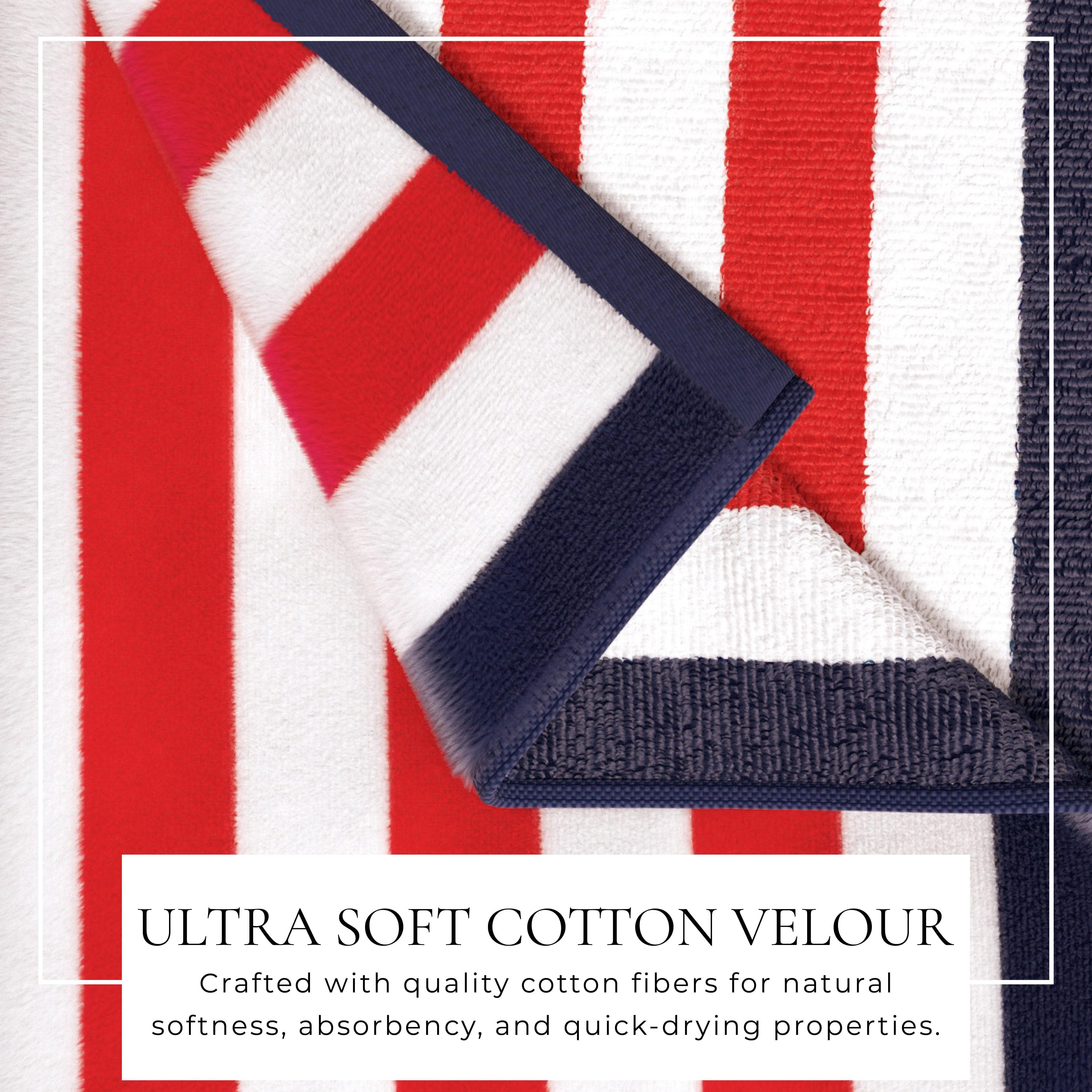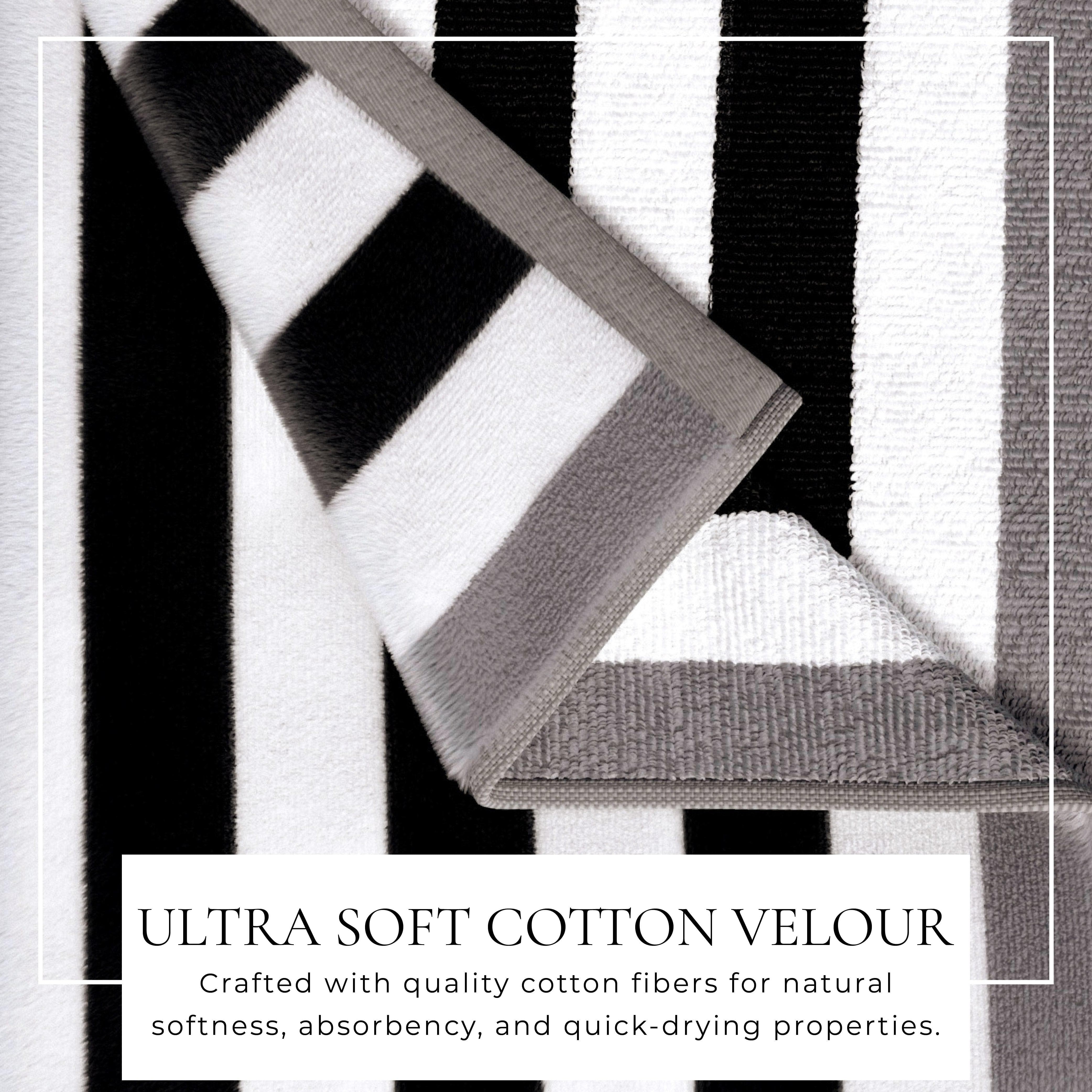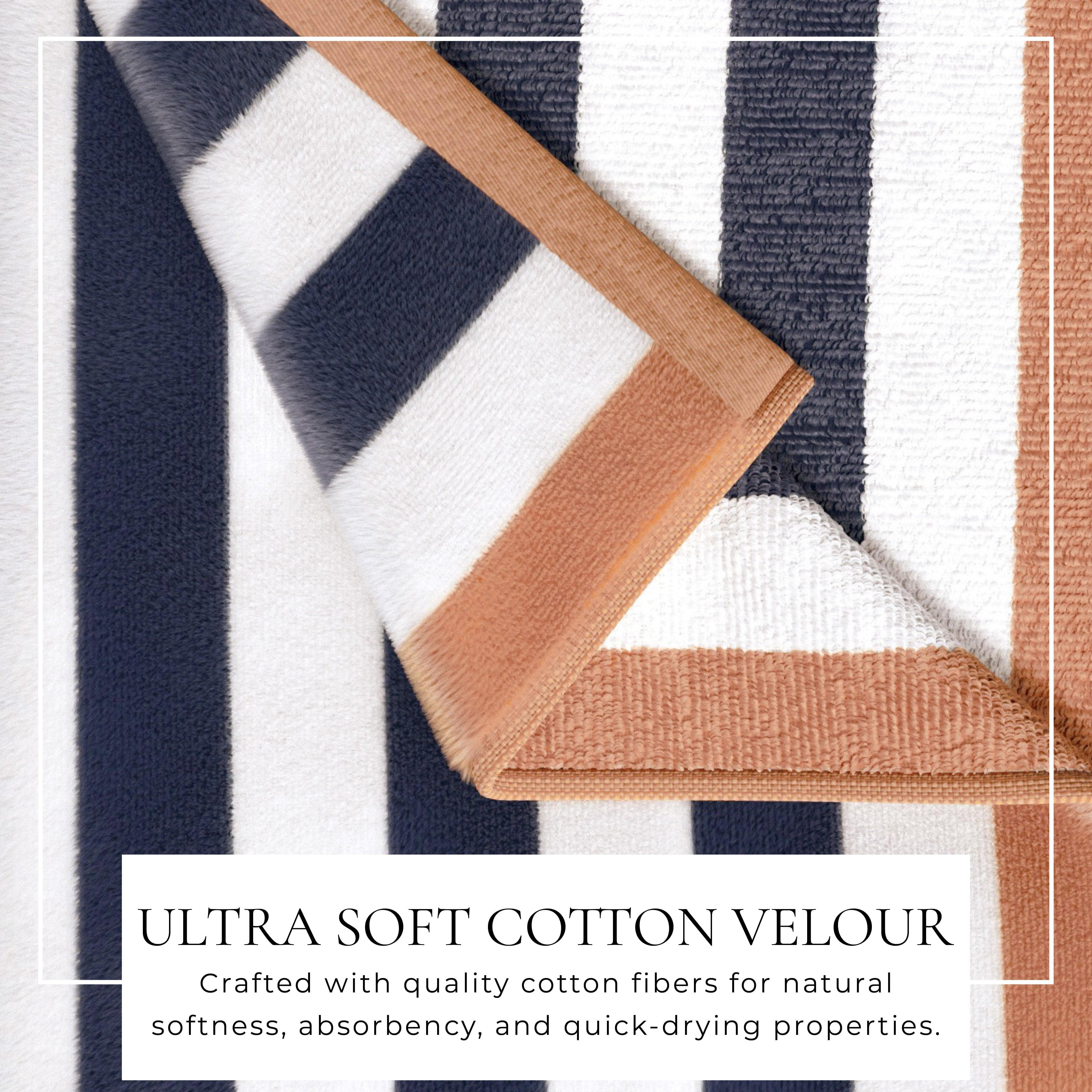 Elevate your beach experience with our oversized, ultra-soft cotton striped beach towels. Made from 100% cotton velour, this towel features an elevated, thin-striped design for a sophisticated twist on a classic. Perfect for relaxing on the sand, lounging by the pool, or accompanying you on summer adventures, this towel combines timeless style with exceptional durability. Crafted to withstand many seasons of fun, its plush and absorbent texture will keep you comfortable wherever your journey takes you. Easy to care for, simply machine wash with like colors and tumble dry low for a softer, more luxurious feel after every use.