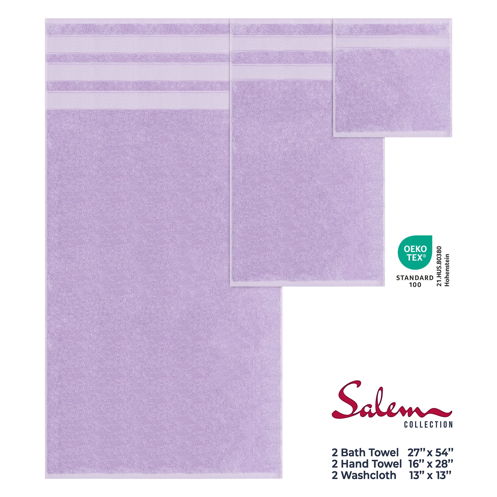 Whether you're upgrading your master bath, outfitting your Airbnb, or looking for the perfect housewarming gift, Salem towels offer the ultimate blend of comfort and style. With superior absorbency and a soft touch that gets even better with each wash, these towels are your go-to for elevated living. OEKO-TEX® STANDARD 100 keeps you and your family safe by testing [each component of] a certified product against a list of over 1,000 harmful substances. Certificate #21.HUS.80380 by Hohenstein.