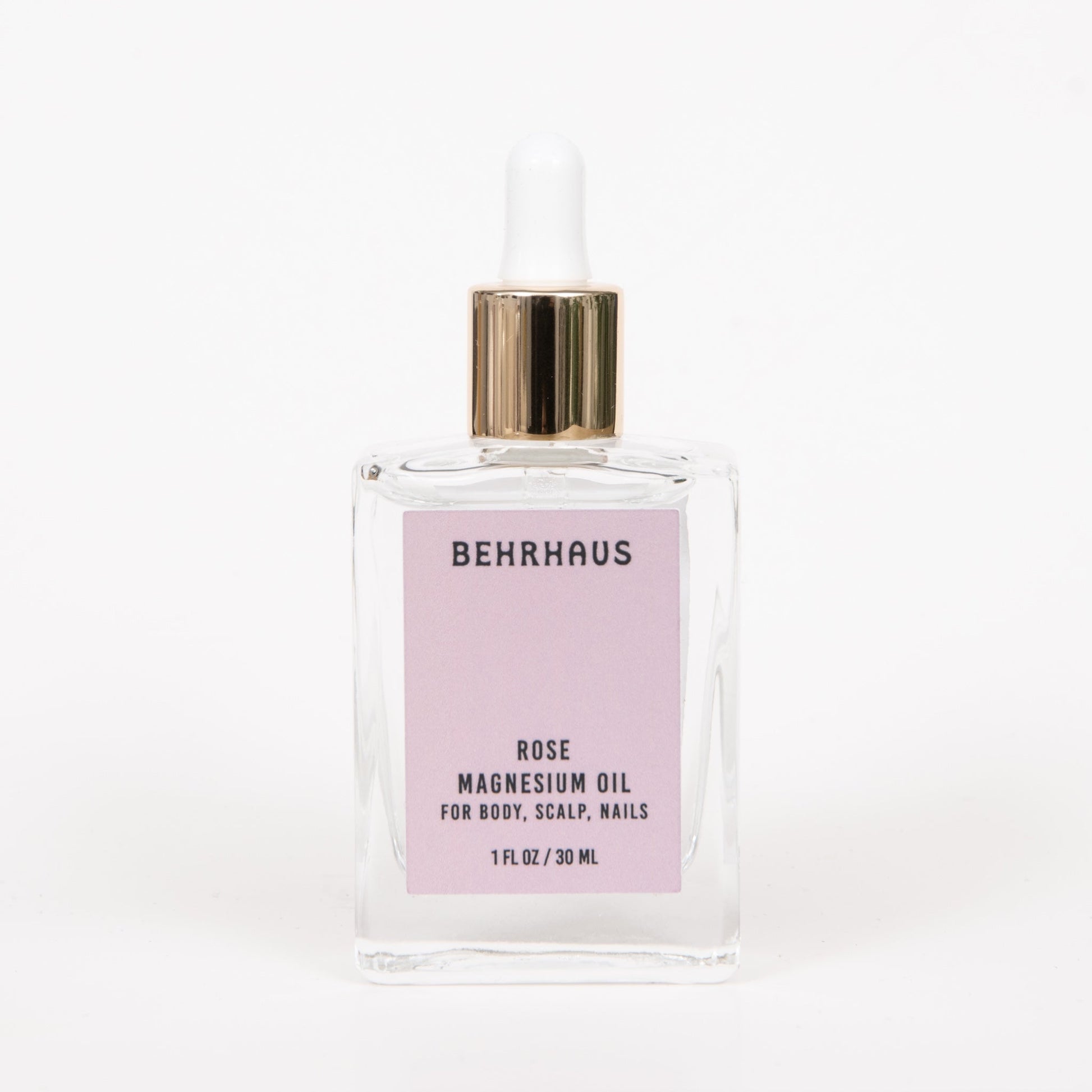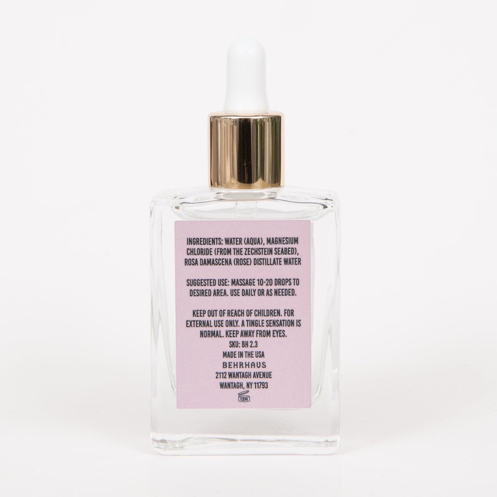 Behrhaus Rose Magnesium Oil combines highly absorbable topical Magnesium Chloride with Organic Rose Hydrosol, steam-distilled from fresh rose petals to deliver hydration, relaxation, and gentle aromatherapeutic support in every drop. This clean, hormone-safe formula transforms daily magnesium replenishment into a grounding self-care ritual that supports both body and mind.