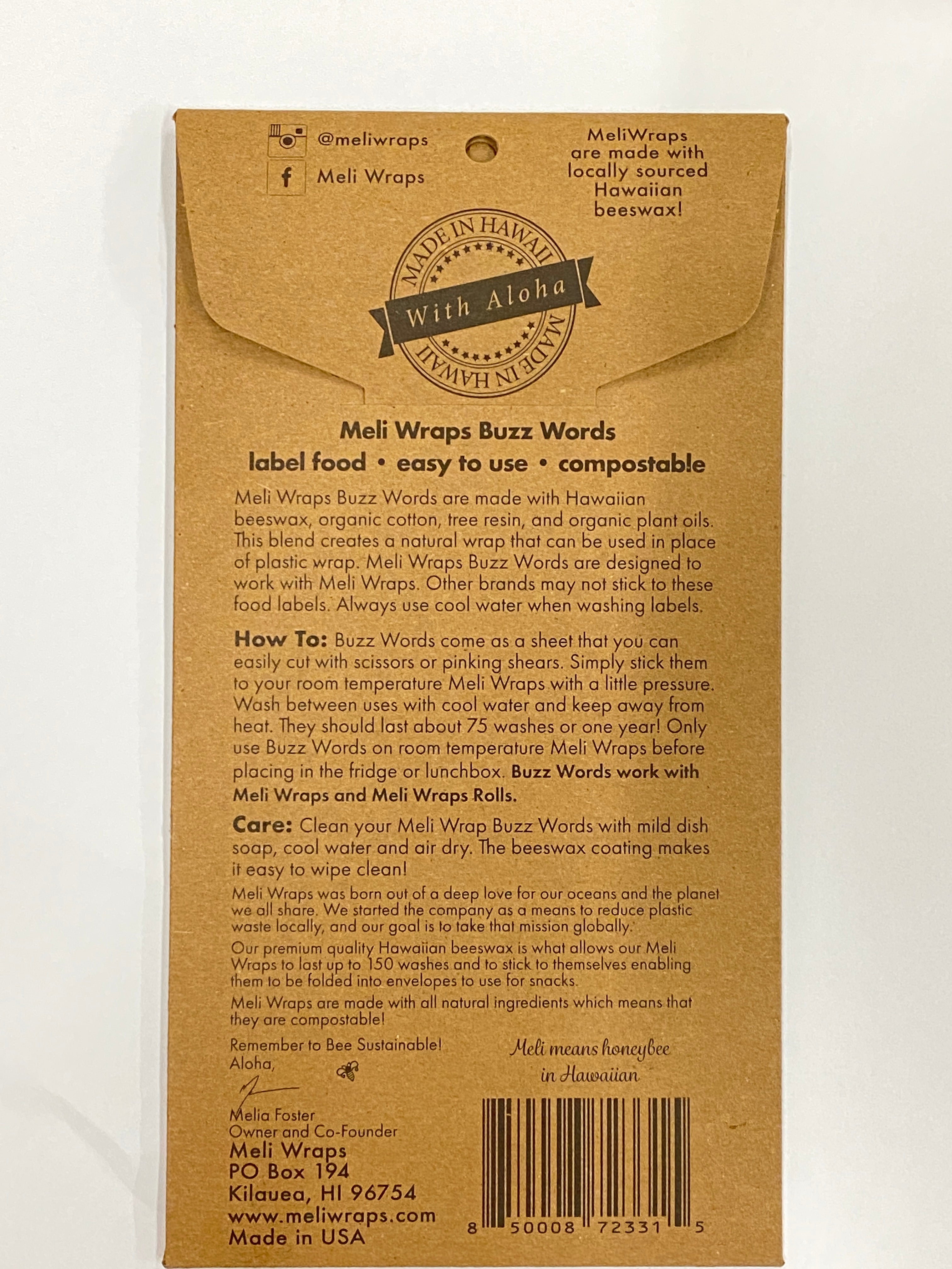 Can’t remember what you put under that Meli Wrap? We’ve got you covered! Our Buzz Wraps are the perfect solution to help you label your food items. Stick them on to your Beeswax Wraps at room temperature and then in the refrigerator. Wash them with dish soap, a sponge and cool water. They last about 1 year. They will only stick to Meli Wraps Branded Beeswax Wraps and Rolls. Each Pack contains the following Buzz Words: 2 Fruit 3 Vegetable 2 Leftovers 1 Avocado 1 Don’t Eat! 1 Cheese 1 Sandwich