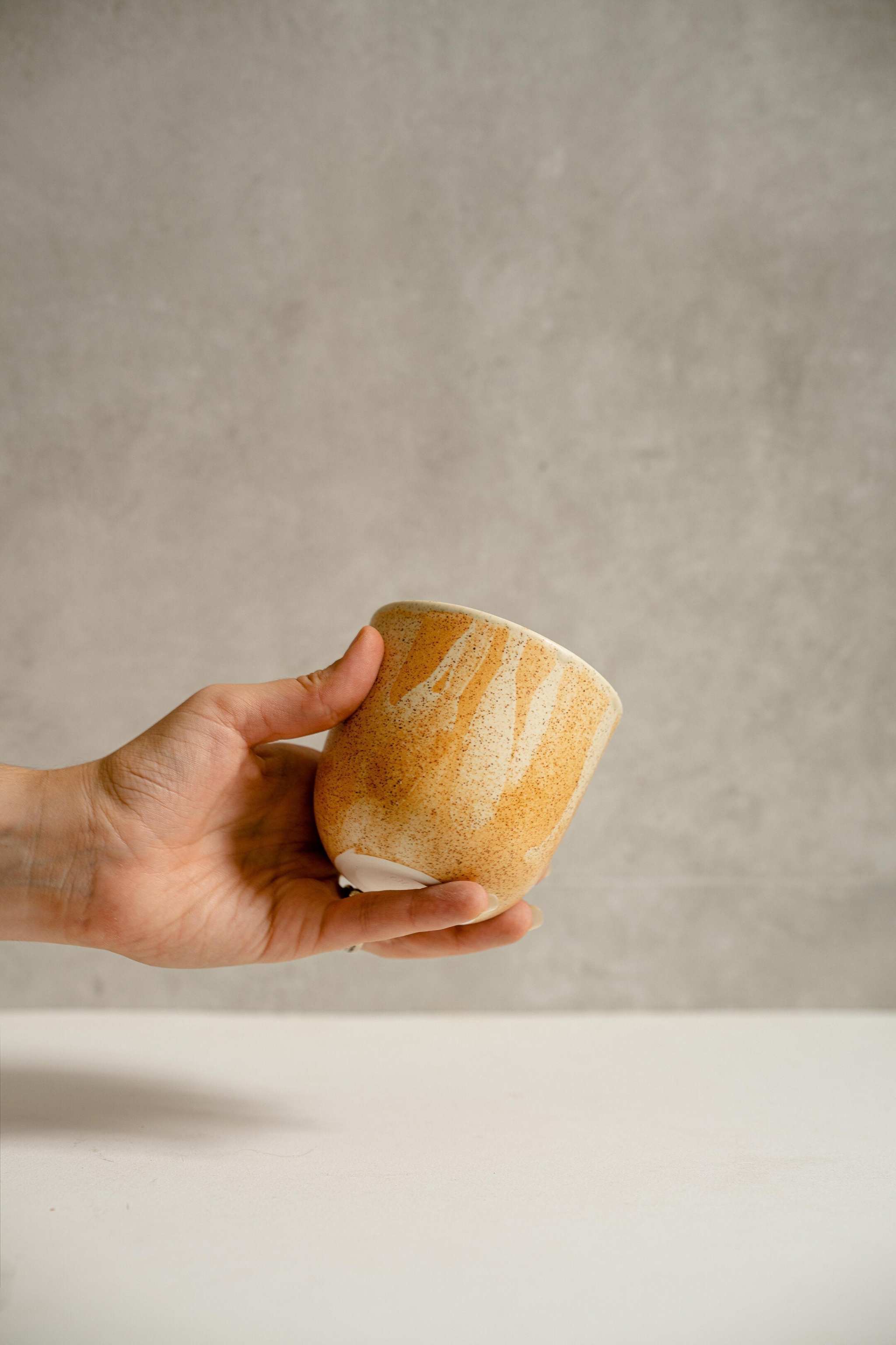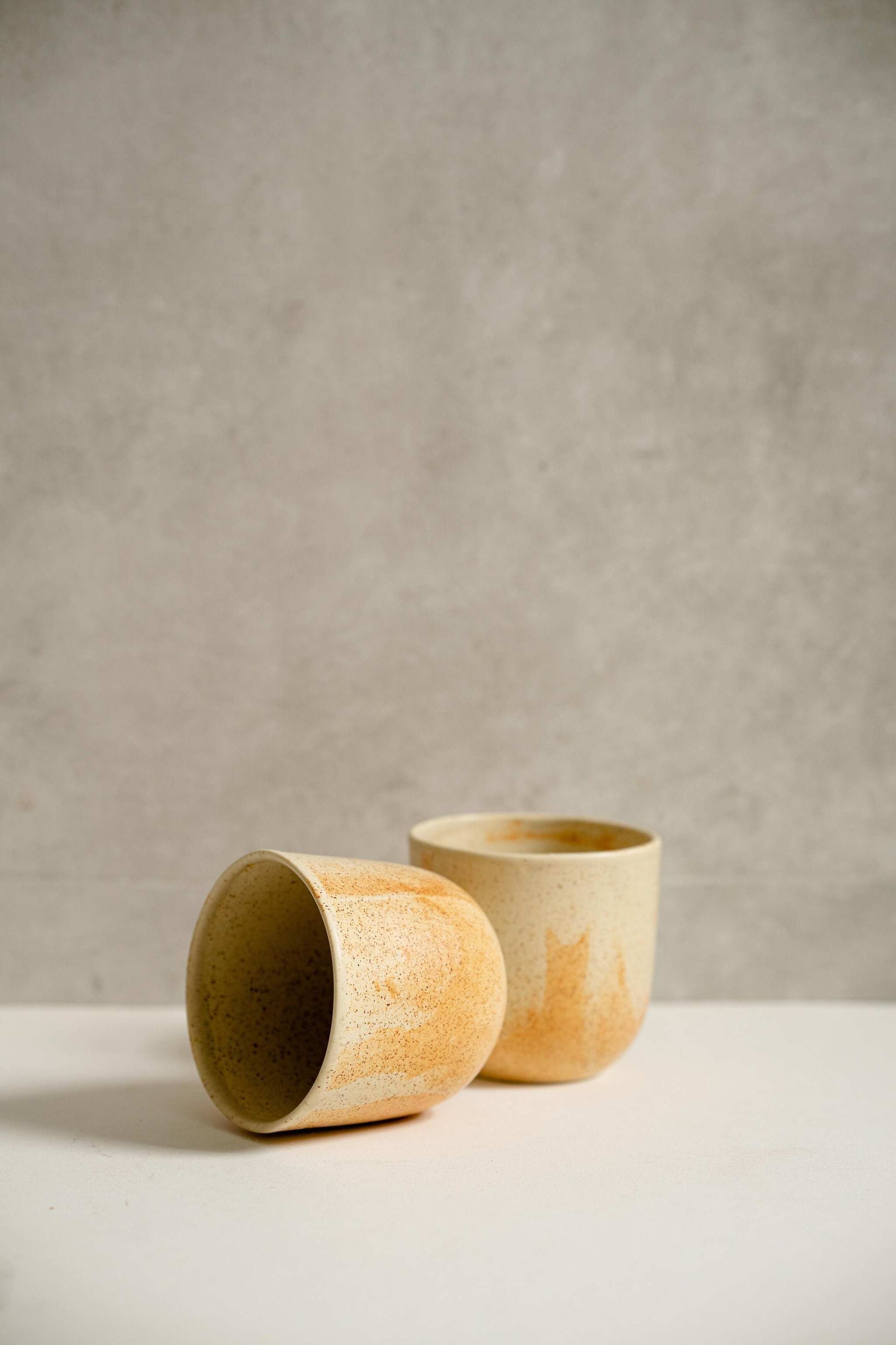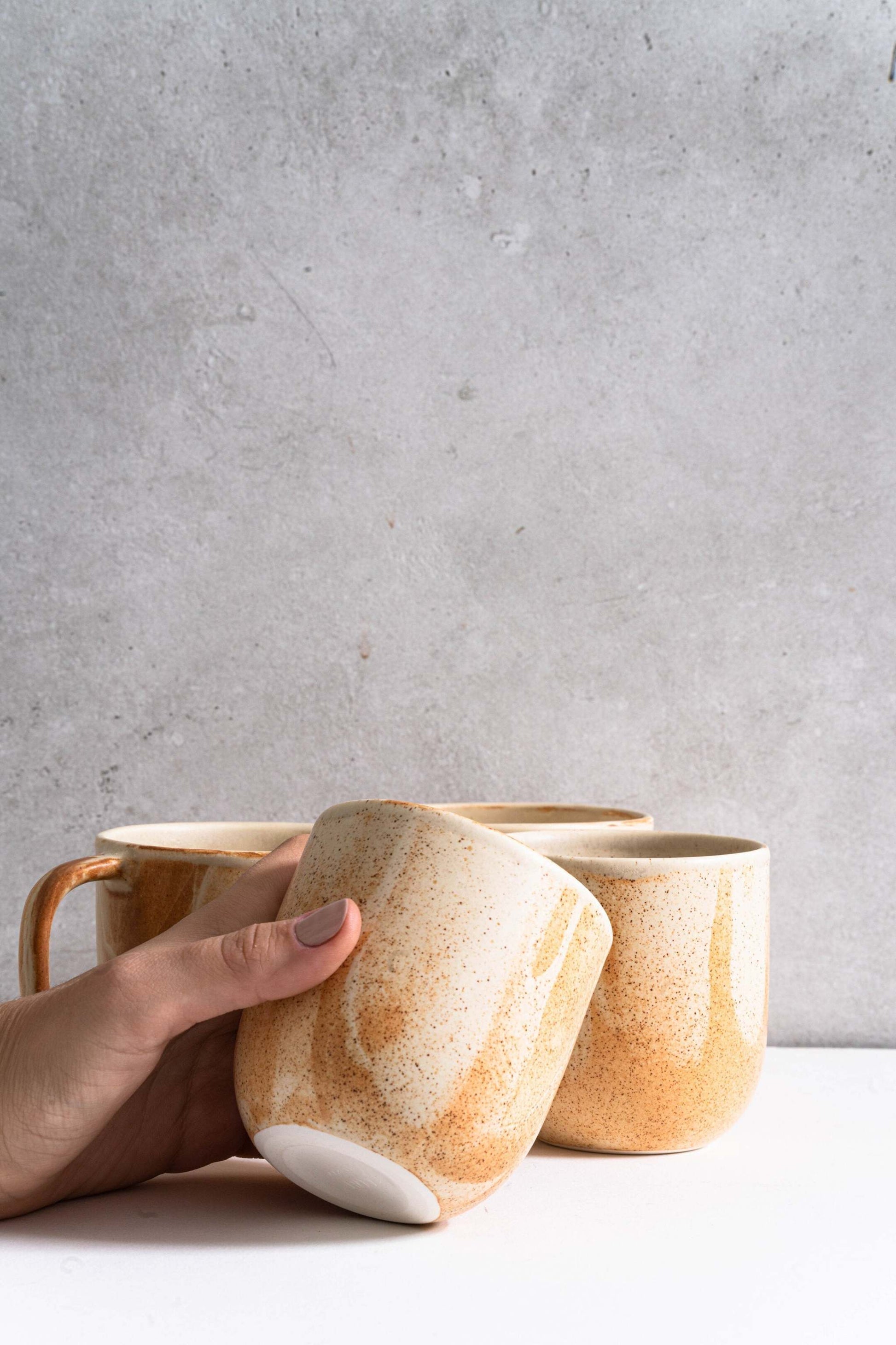 Beige handmade stoneware mug with organic edges is perfect for a latte, coffee, tea, etc. Hand-dipped in a reactive glaze that swirls uniquely across each piece and leaves beautiful rust drips. The clean, modern shape of this stoneware mug displays unique patterning and tonal effects. Fired at very high temperatures, the mug has exceptional strength and durability.