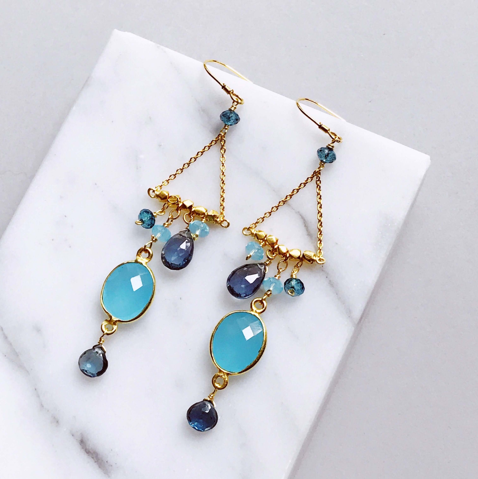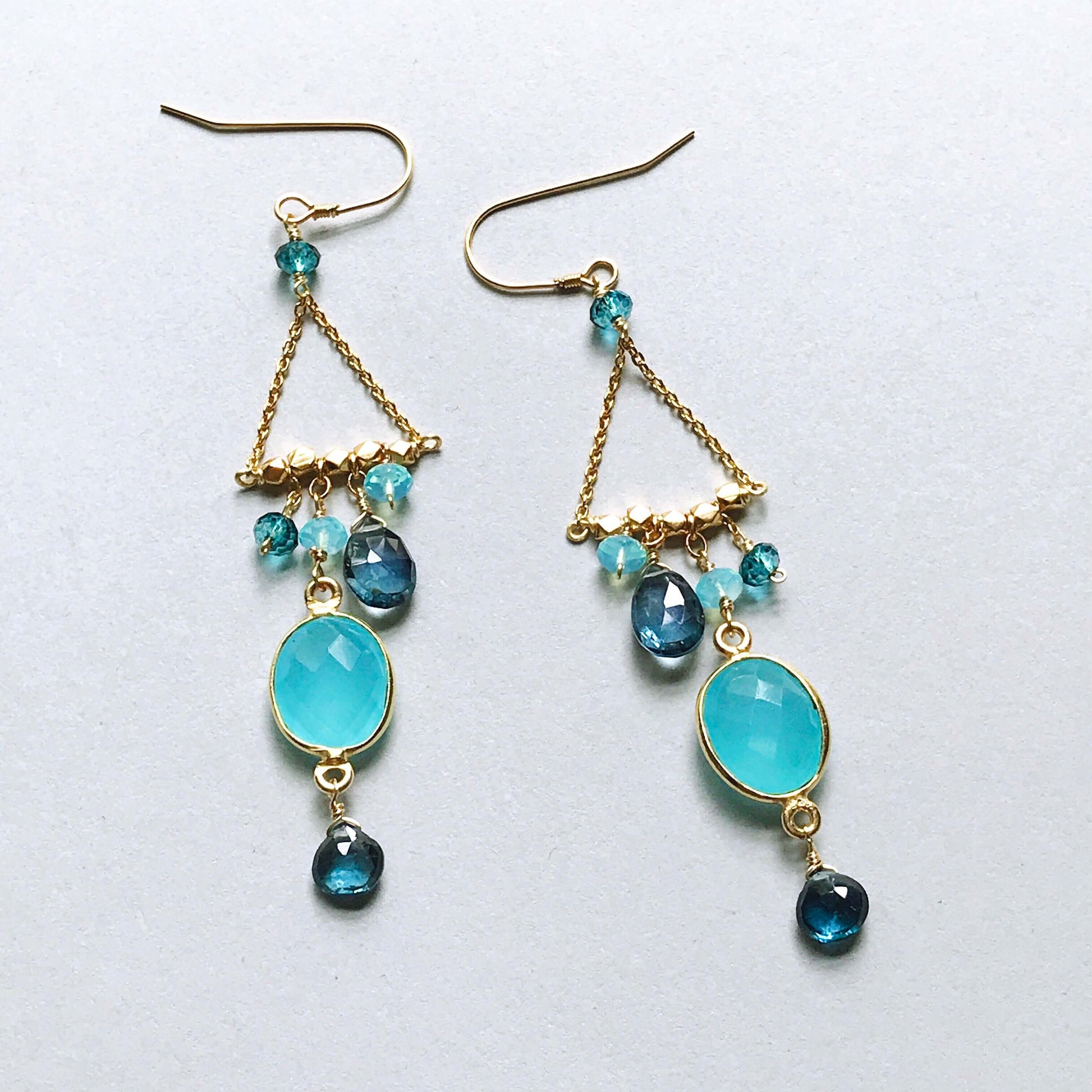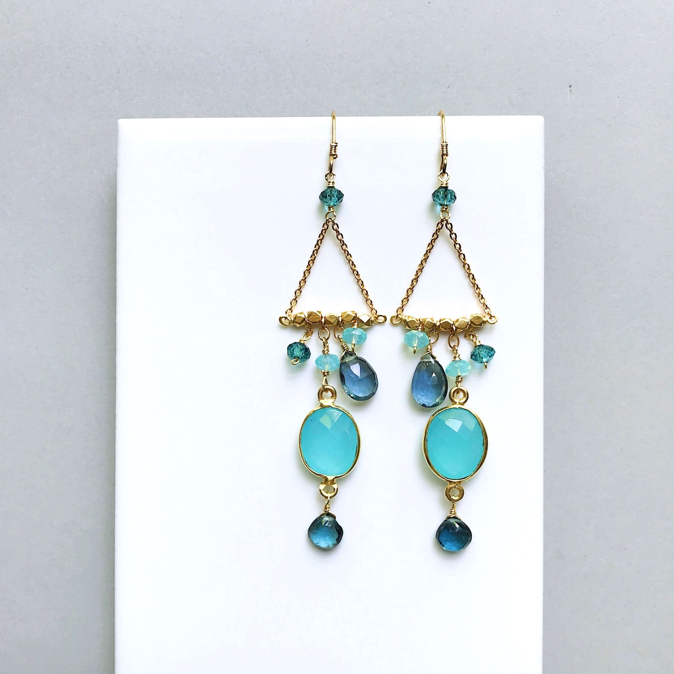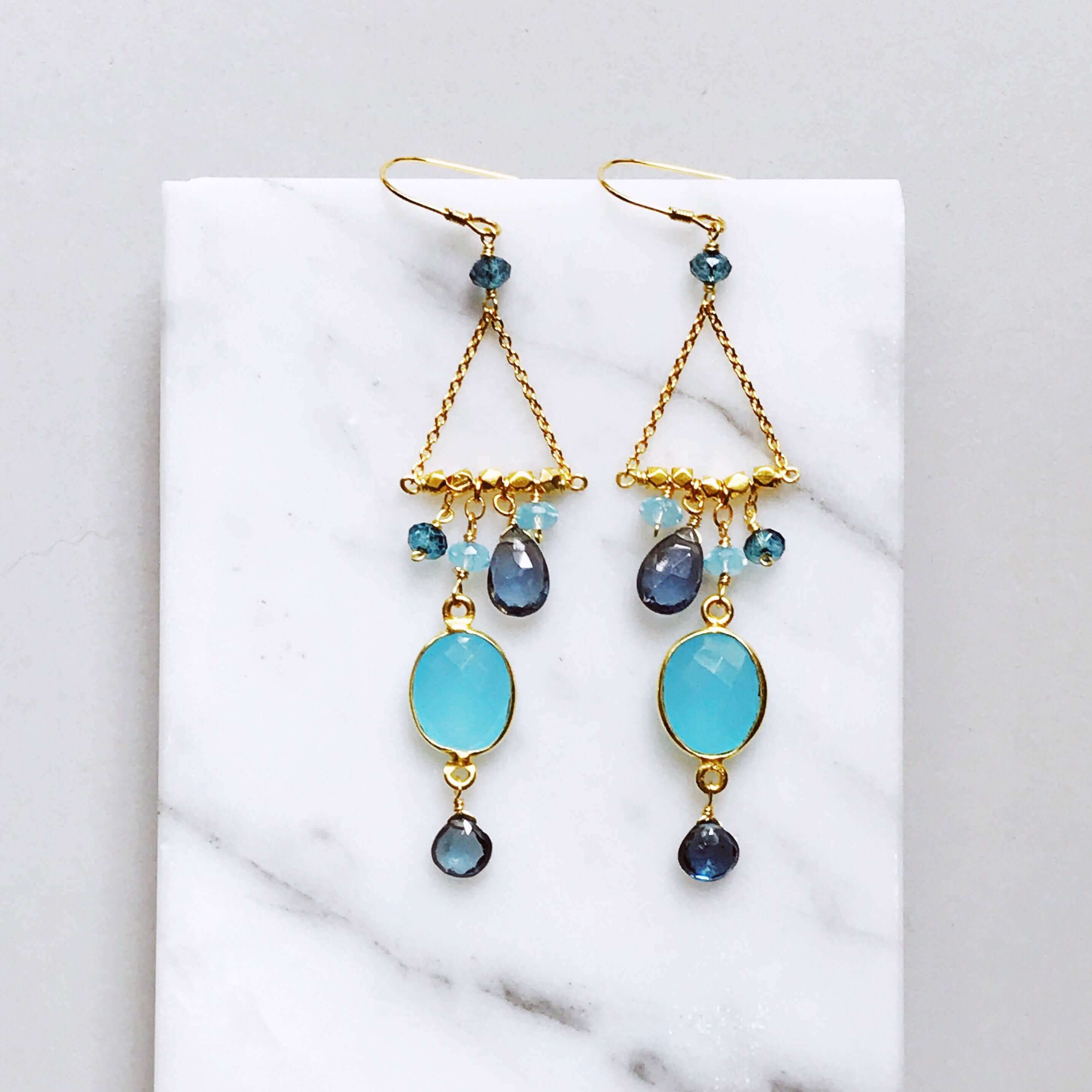 Our "chandies" are a modern take on classic chandelier earrings, using gemstone color combos and different stone shapes and sizes.
