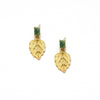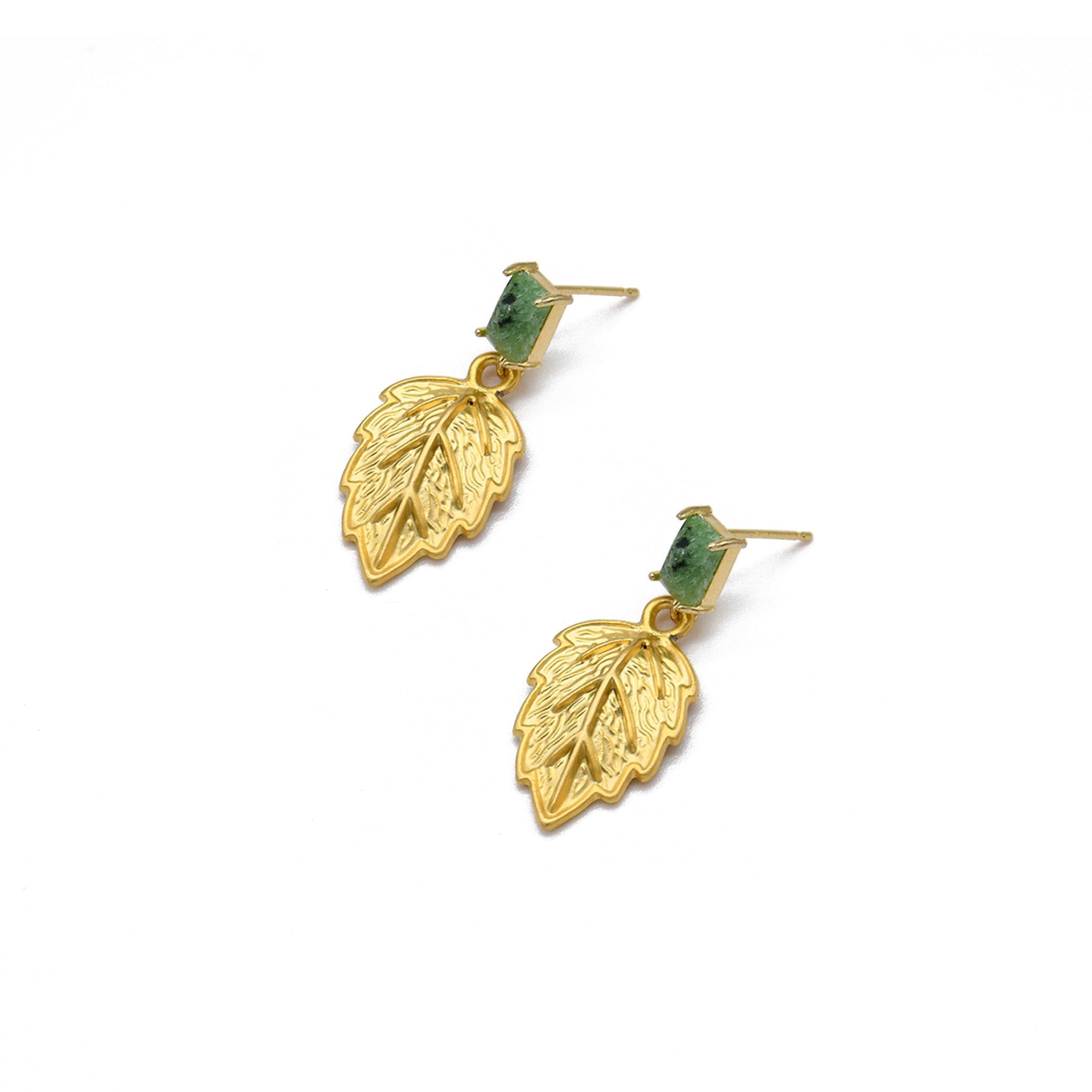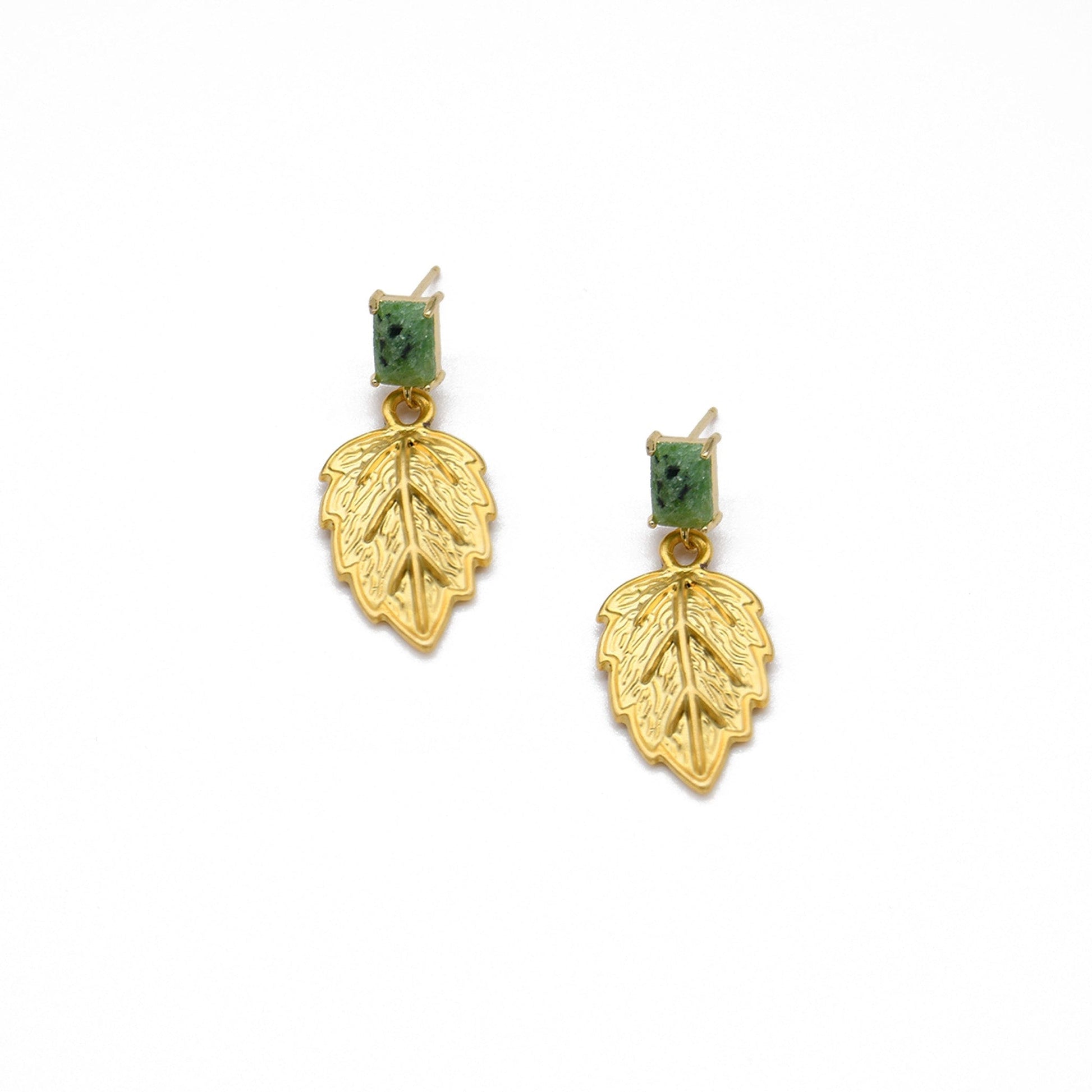 Jade Leaves Earrings featuring a precious jade stone post and handmade with 22k gold plated brass. The leaves have intricate and detailed designs, making this piece a luxurious and elegant statement piece that will complement any ensemble.