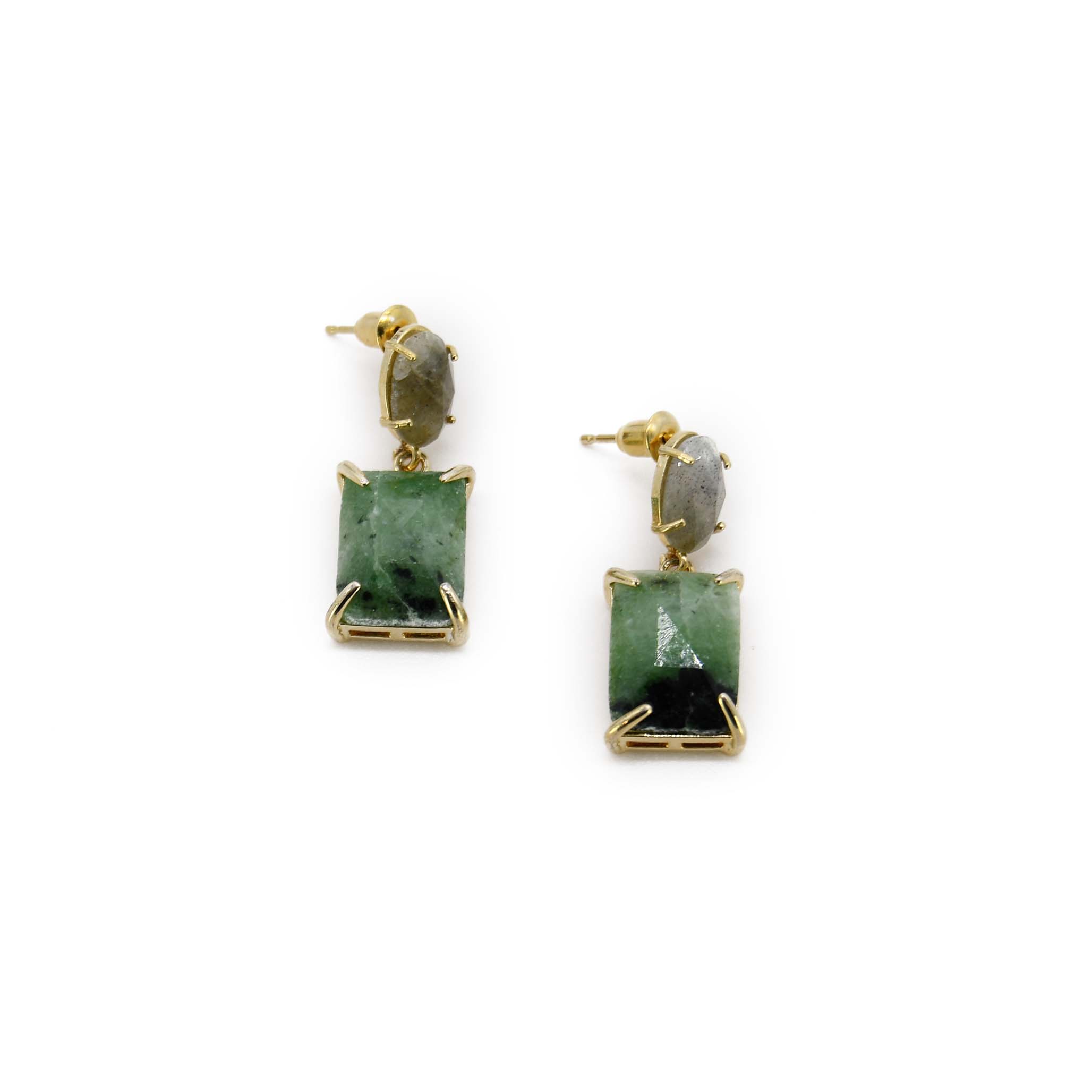 Labradorite & Jade Agate Earring is handmade with 14k gold plated brass featuring Labradorite gemstone S925 post and Jade Agate gemstone pendant.