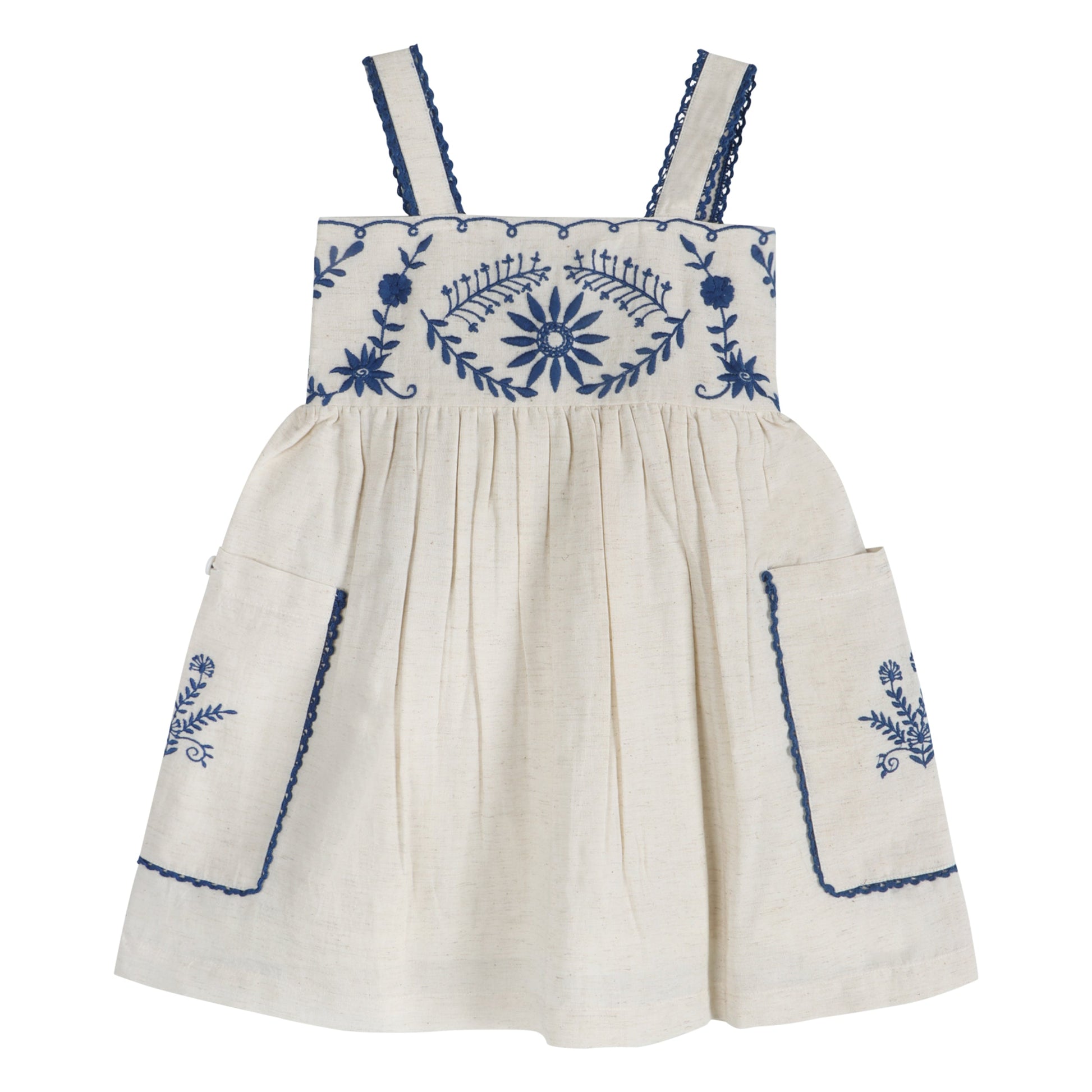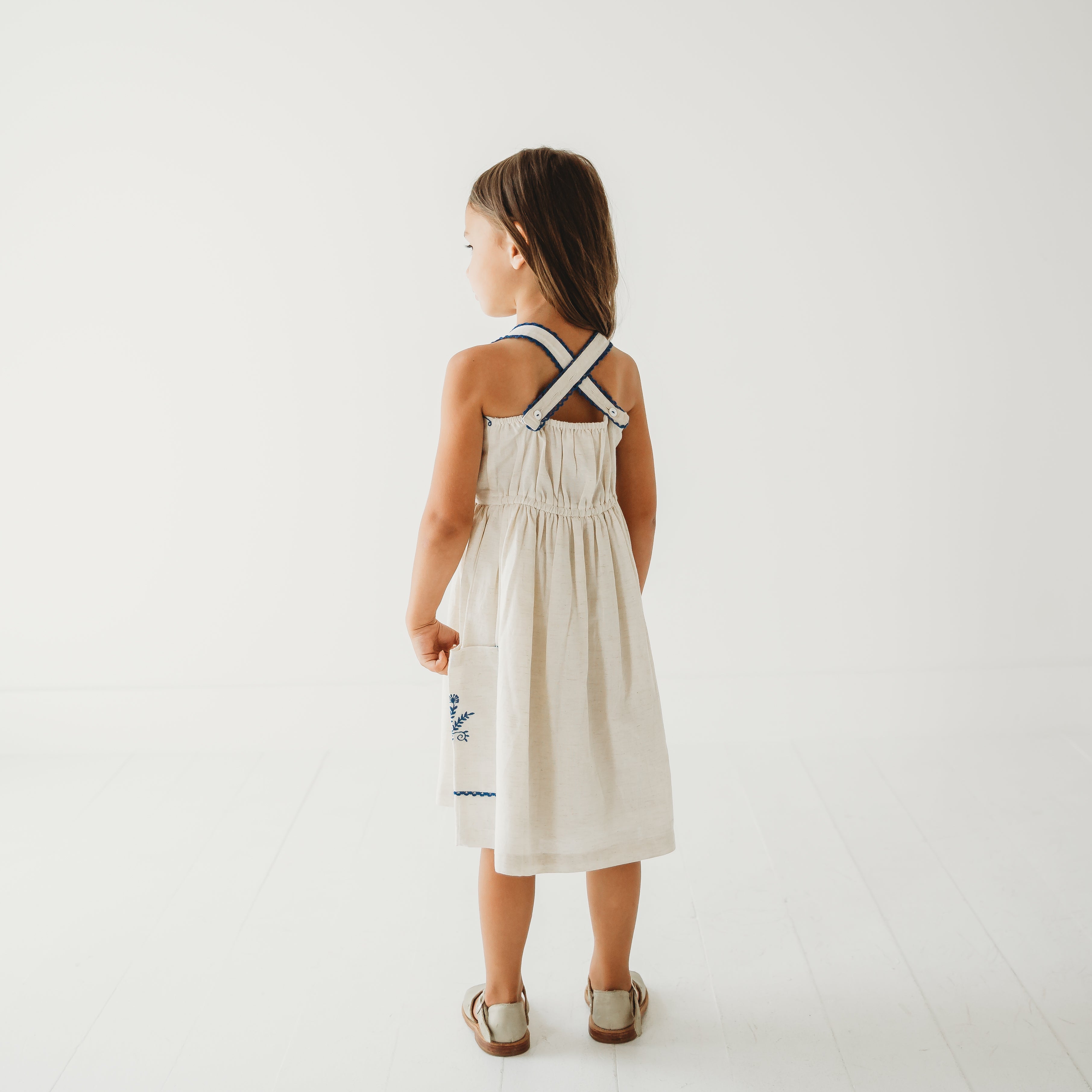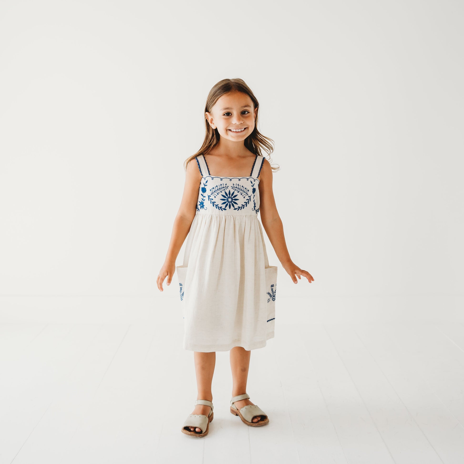 Elevate your little one's wardrobe with our Azurea Linen Embroidery Dress, a masterpiece of handmade craftsmanship. This exquisite dress features:
