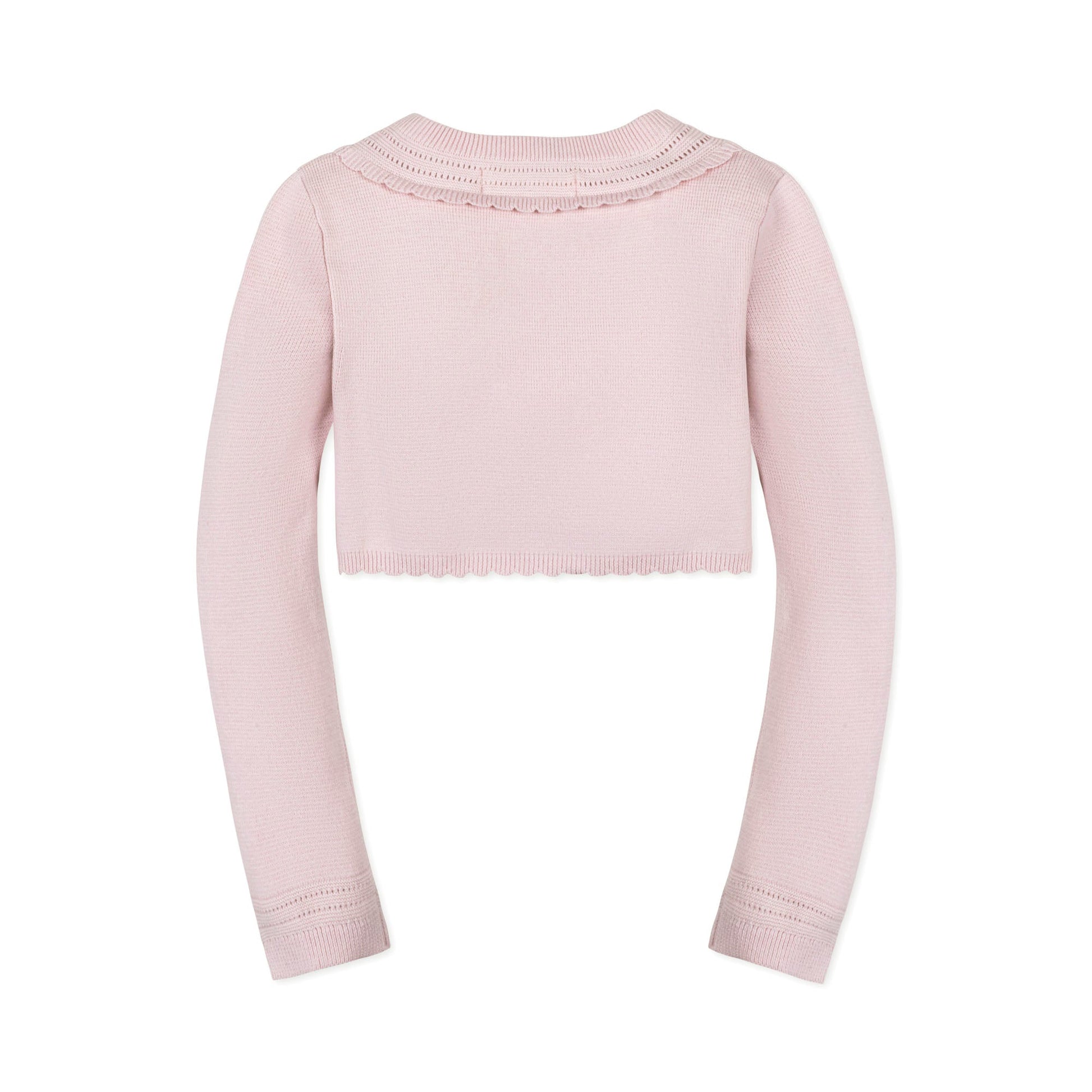 A beautiful layer to top off her dressy outfits. Our cropped cardigan sweater is knit in fine gauge organic cotton with full fashioning at armholes and a pointelle pattern throughout. Features delicate pearlized buttons.