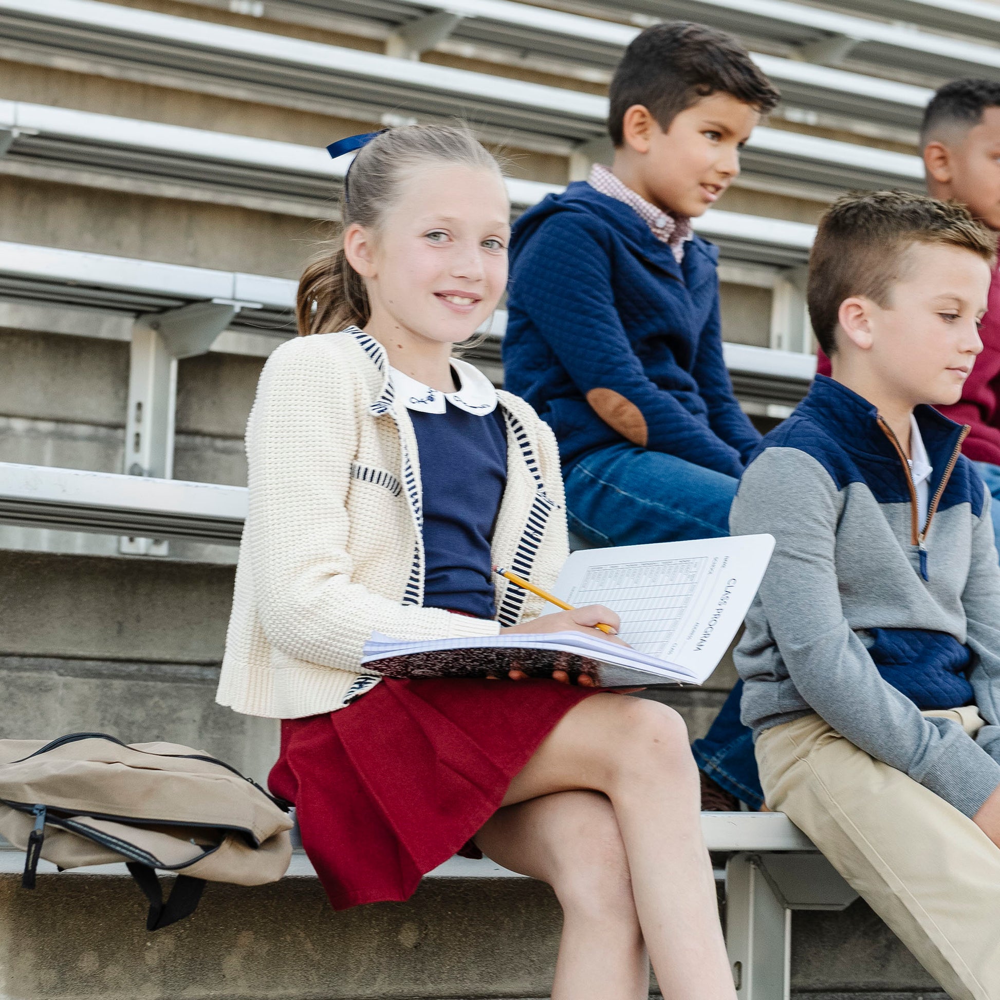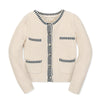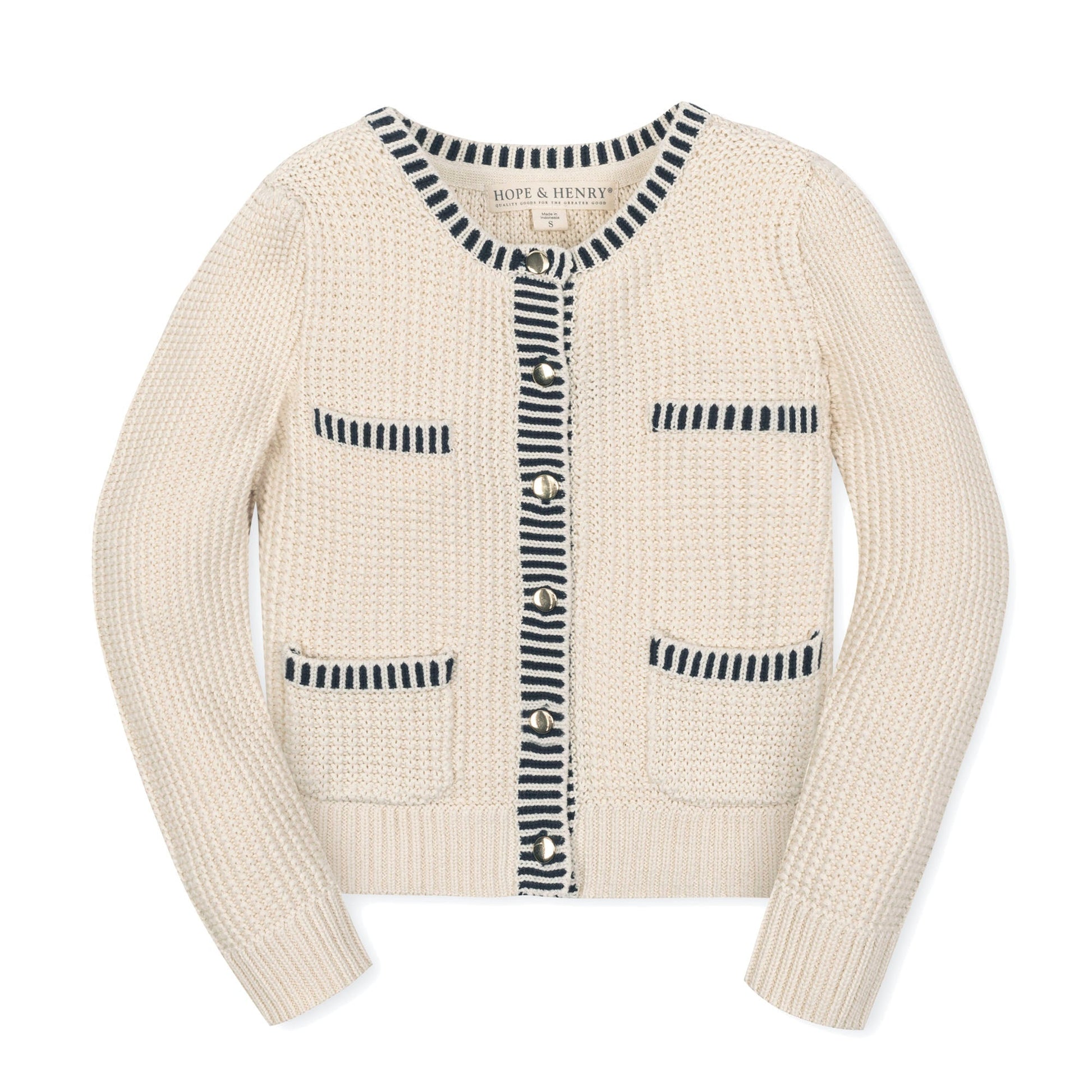 Our sophisticated sweater cardigan in soft organic cotton is elevated by a beautiful tweed-like stitch. Features delicate puff sleeves, gold button closure, front patch pockets and welt pocket detail, and contrast trim. This piece pairs perfectly with our collection of organic cotton tops, skirts, and dresses for a polished look she'll love.