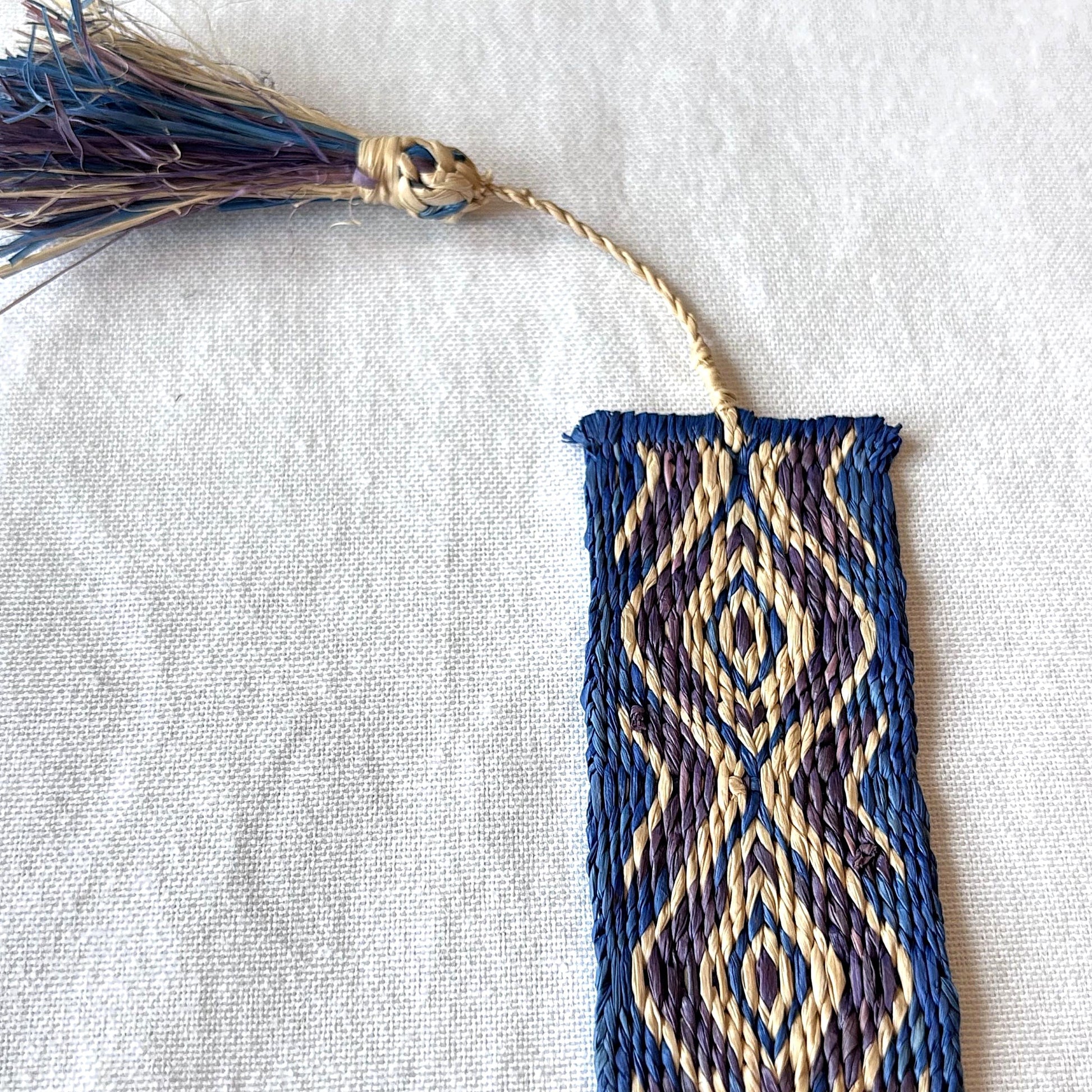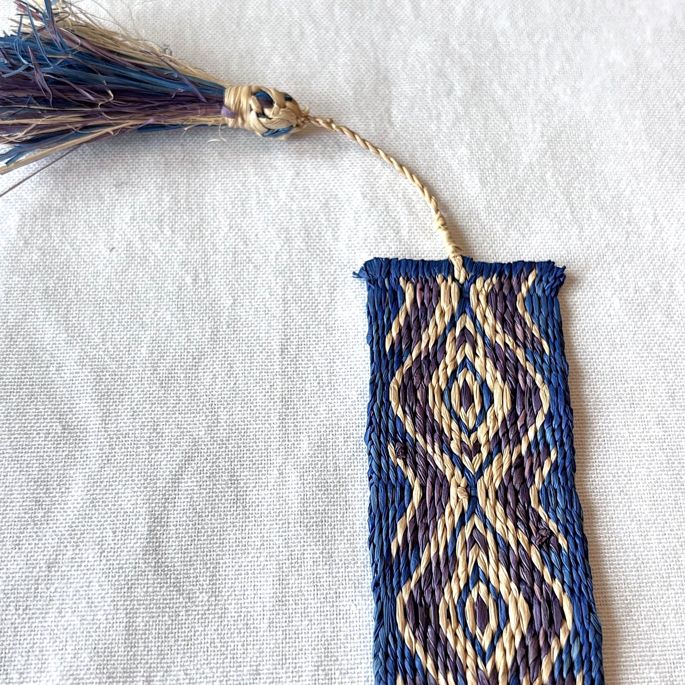 This handwoven, finely detailed raffia bookmark is the perfect accent for a favorite book.  It is crafted using the traditional artisan technique of card weaving, otherwise known as tablet weaving.  Its gorgeous texture, smooth sheen, interesting plant fiber material, and beautiful blue pattern are sure to delight.