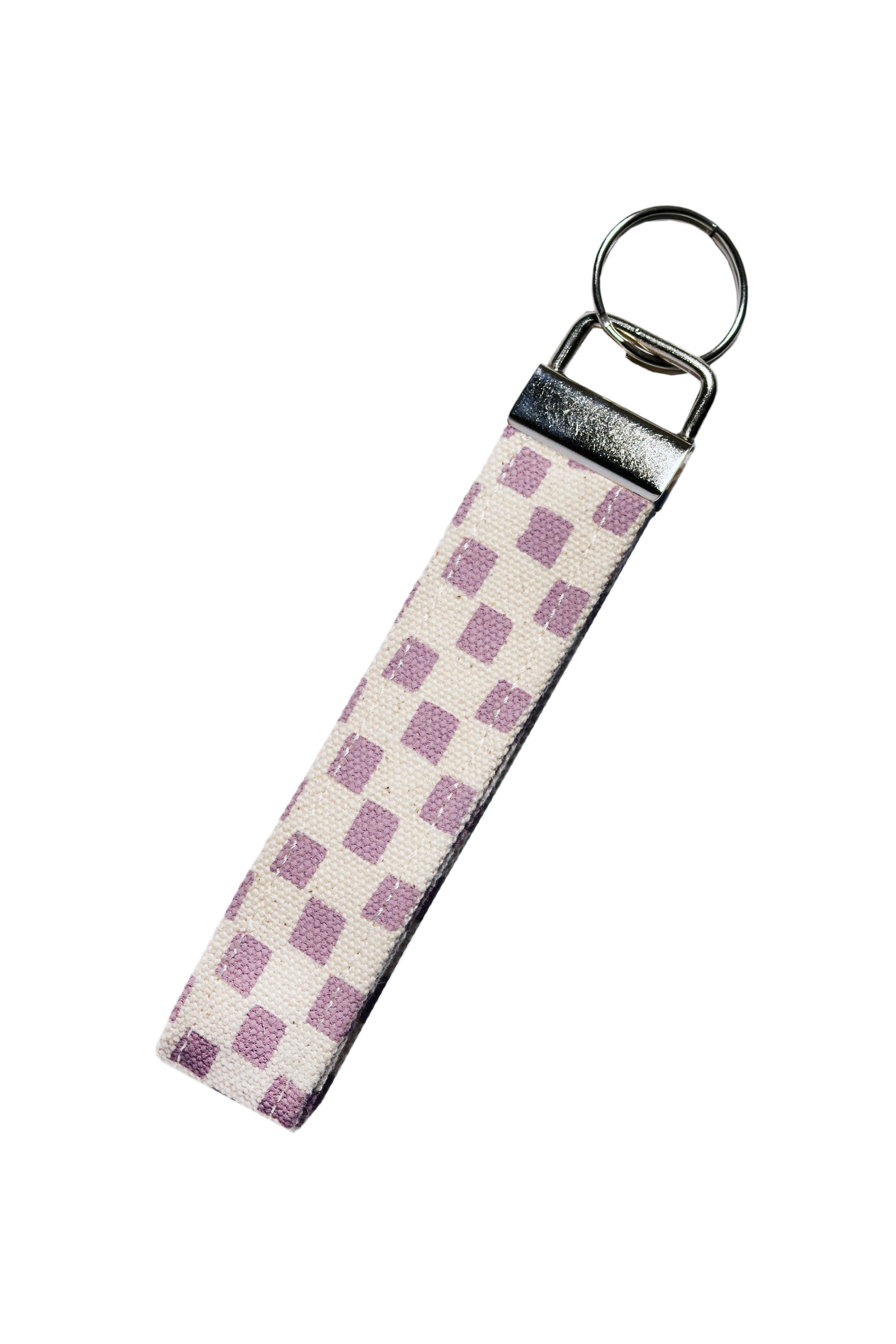 Use the nickel split ring to attach to your keys, bag, or backpack and always have your keys close at hand. Made from a double thick, durable 100% cotton canvas, these key fobs feature it a hand cut checkered pattern screenprinted in light mauve. Nickel hardware and sturdy for everyday use.