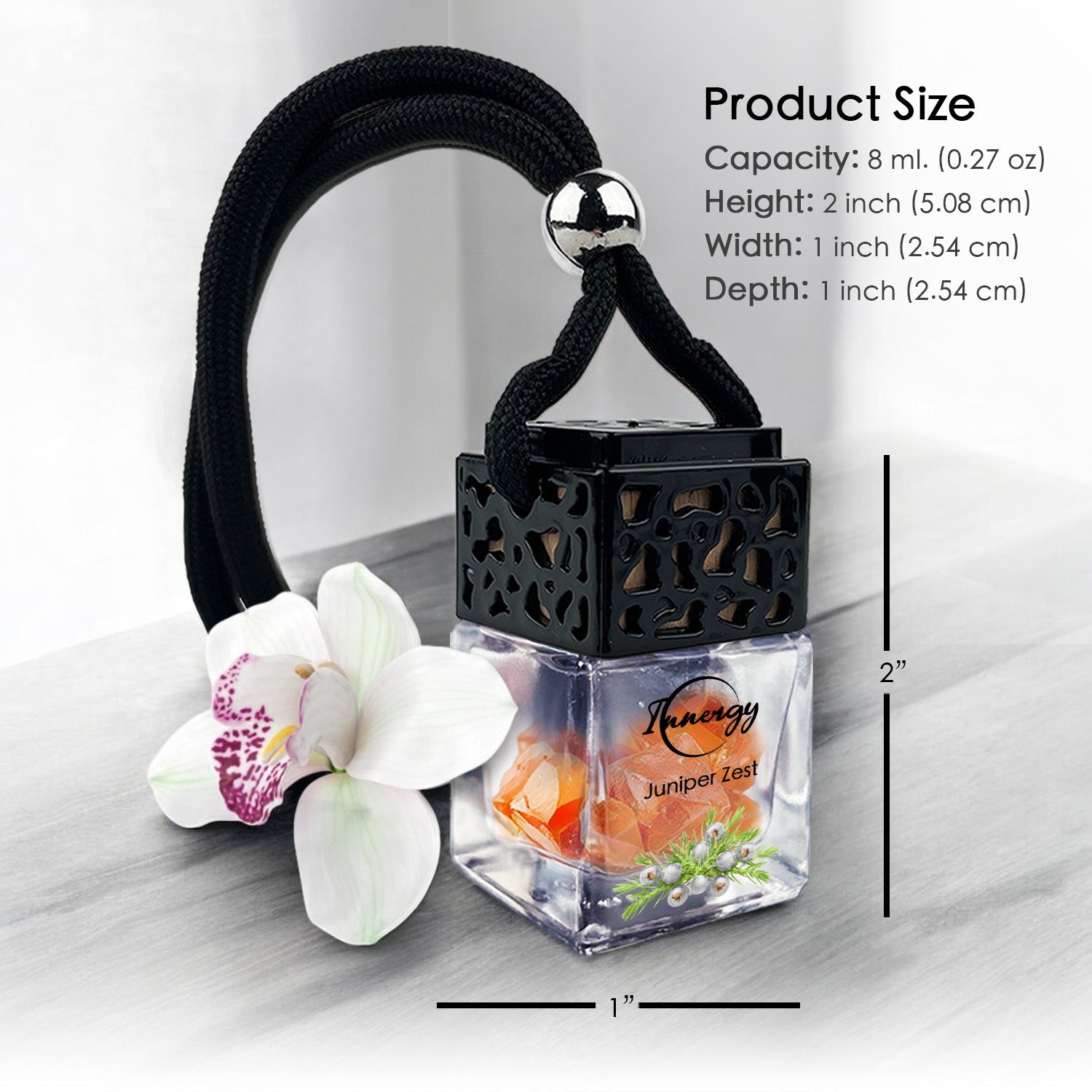 Immerse your senses in the enchanting allure of our Crystal-Enhanced Car Diffuser, featuring the captivating Juniper Zest scent—a harmonious blend of tart and sweet notes. Botanical juniper, geranium, and an elegant hint of black currant and peppermint create an aromatic symphony that reinforces the tart freshness.