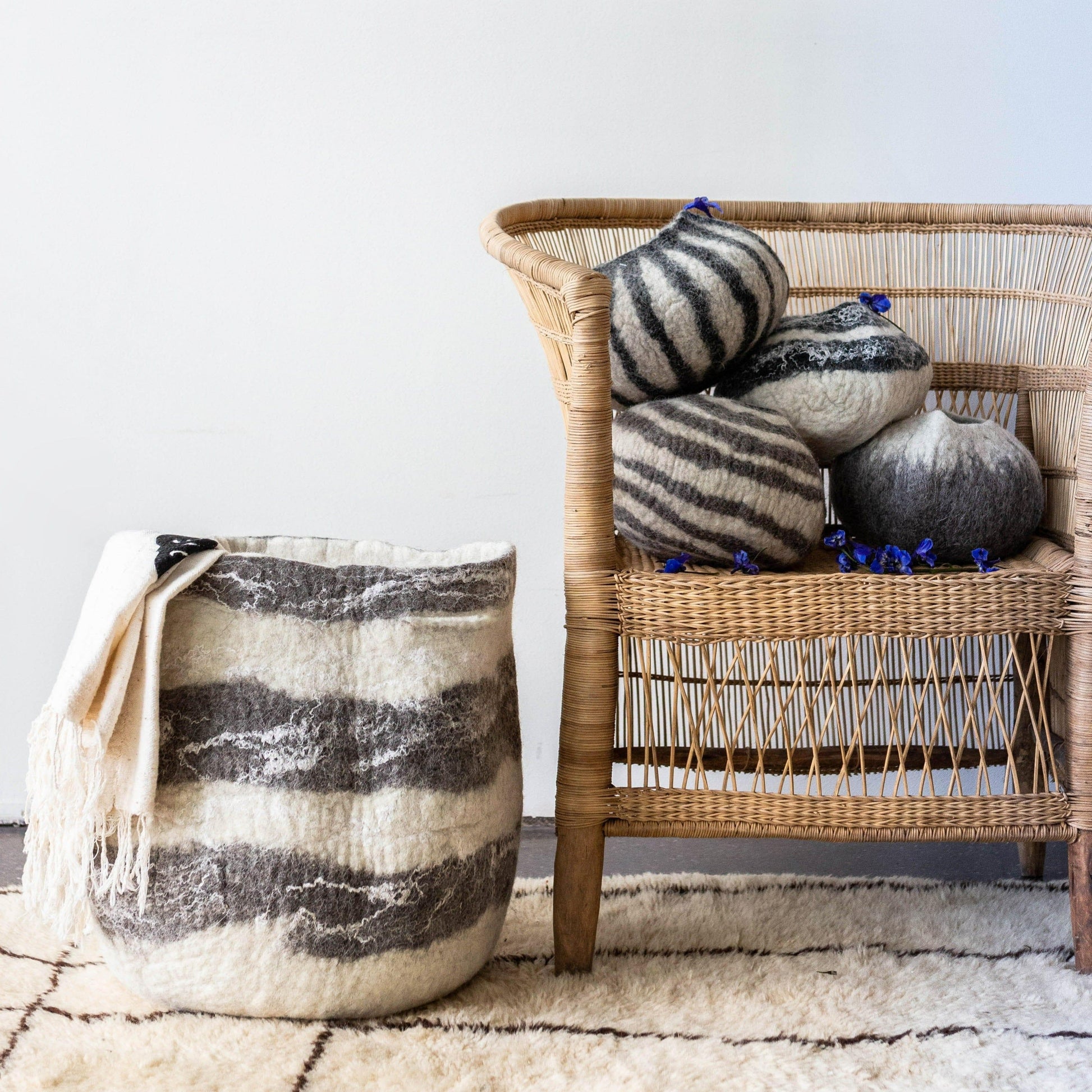 Hand felted using 100% Karakul wool, shaped like the Xhosa Ingobozi basket, our hand felted Ingobozi is practical enough to use for storage anywhere in the home. The entire process of making our vessels is done by hand, from dyeing through to felting thus enhancing its organic appearance and tactile sense.