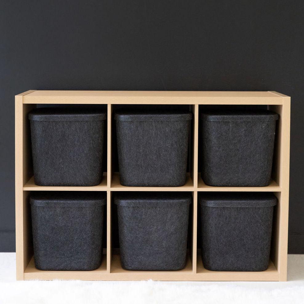 Available in Carbon and Stone, our Sculpted Bin with Lid is designed to maintain its modern shape and keep contents protected.