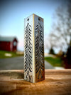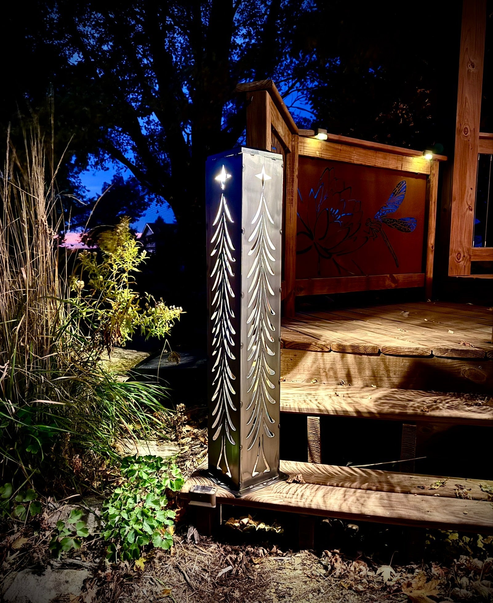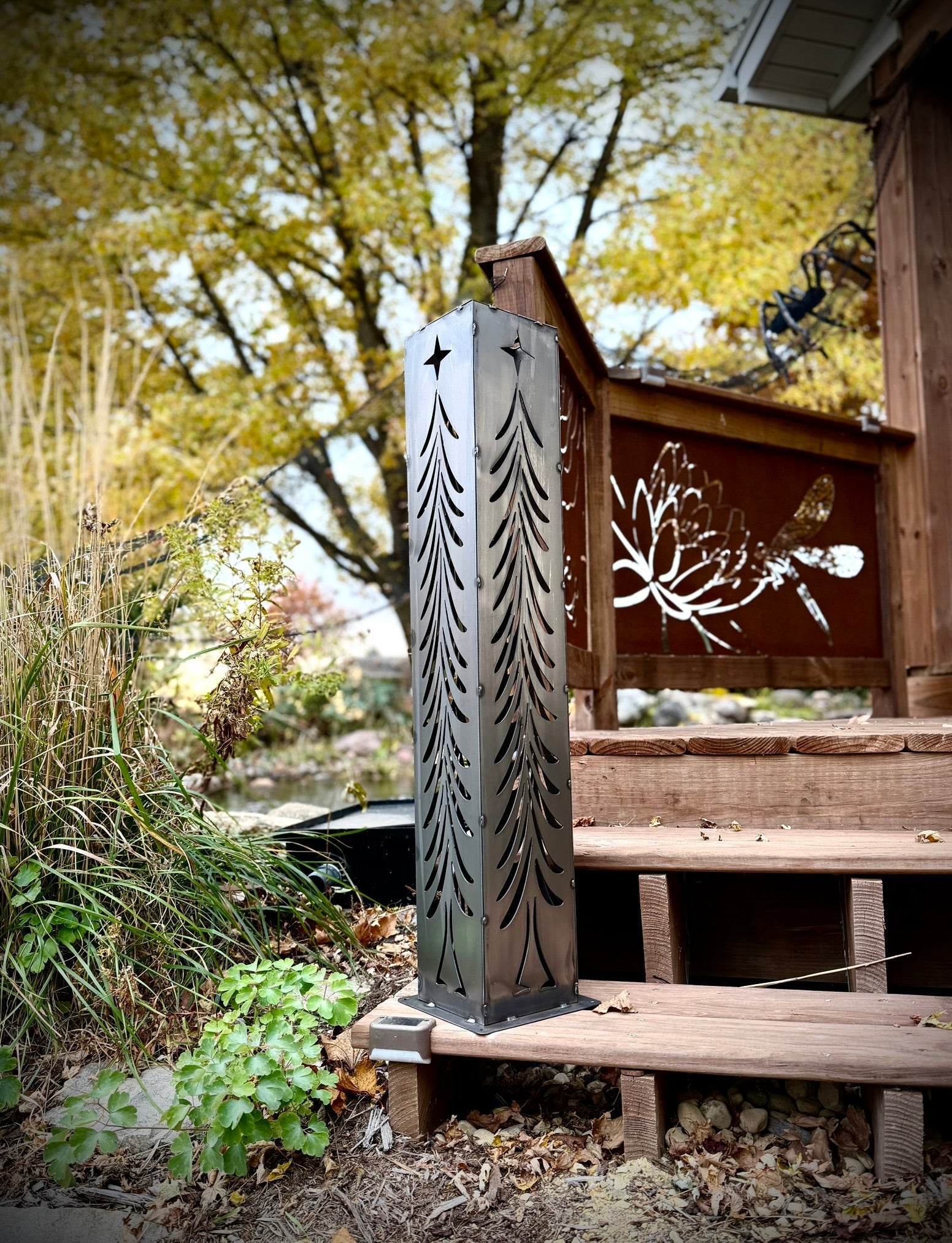 This rustic hollow steel tube features a wispy Christmas tree on all four sides. It is constructed from quality cold-rolled steel and comes with a solar cap installed on top of it. Can be used inside or outside.