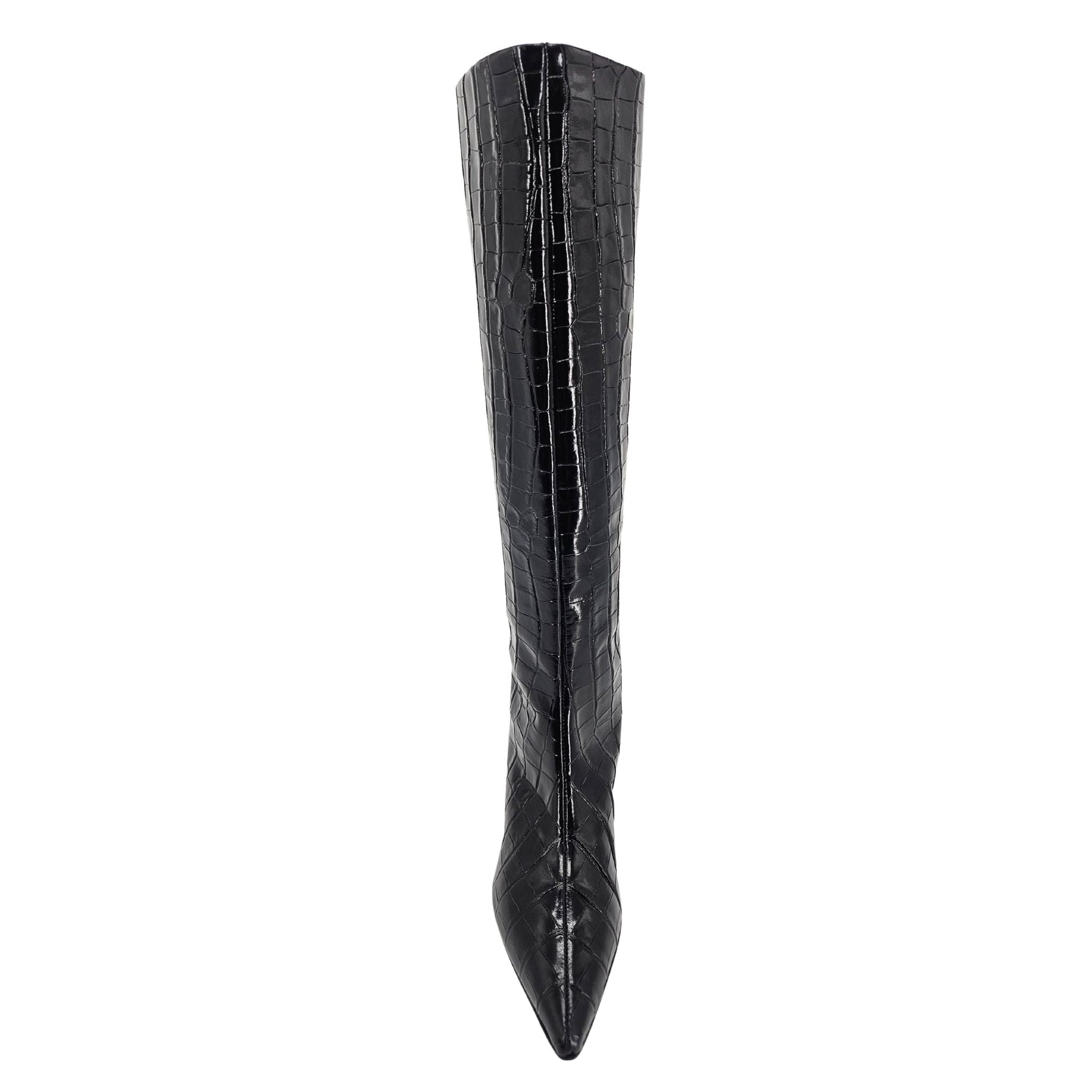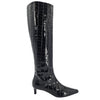 Black Tall Moc Croc Pointy Toe Kitten Heel Boot