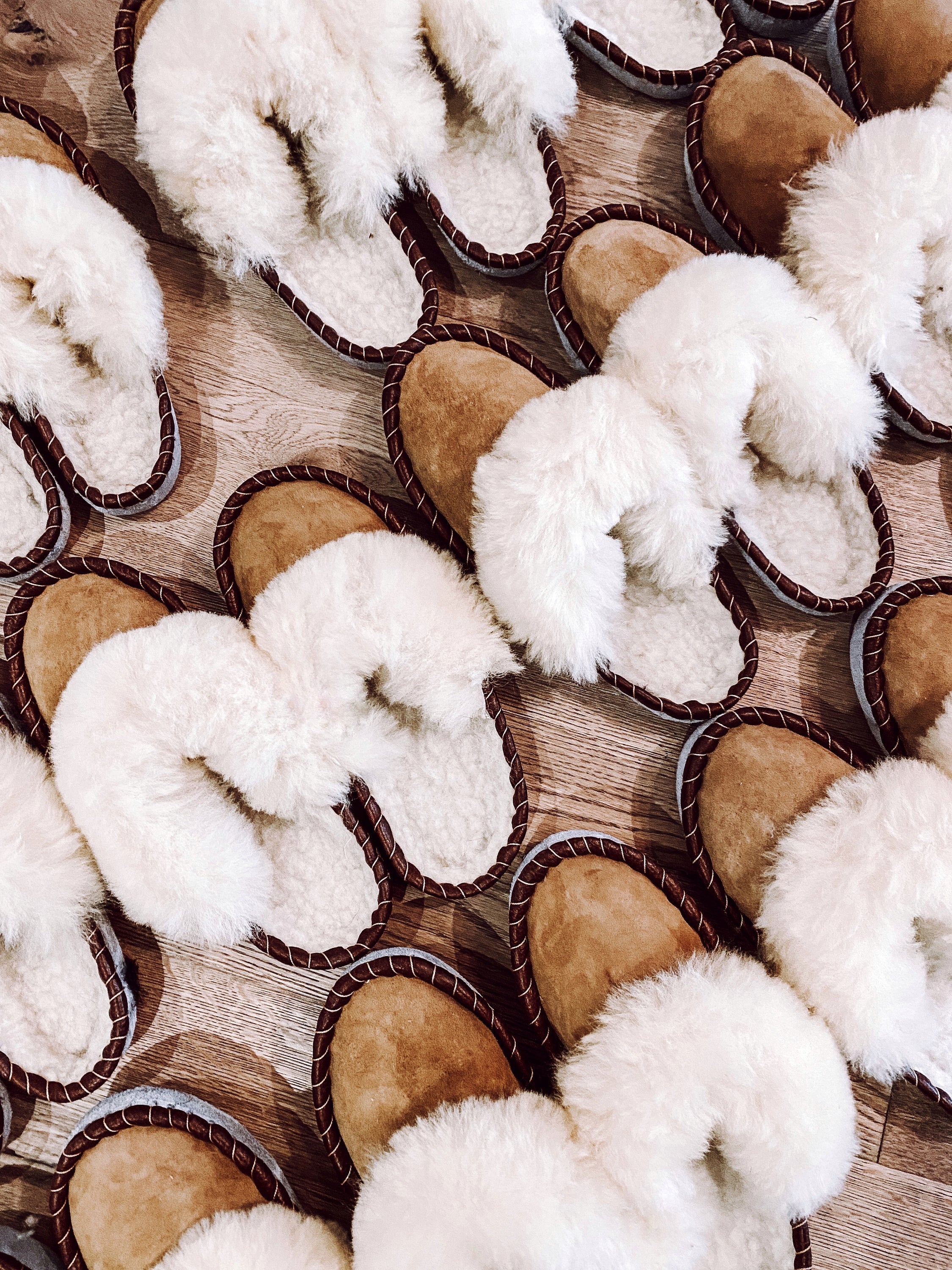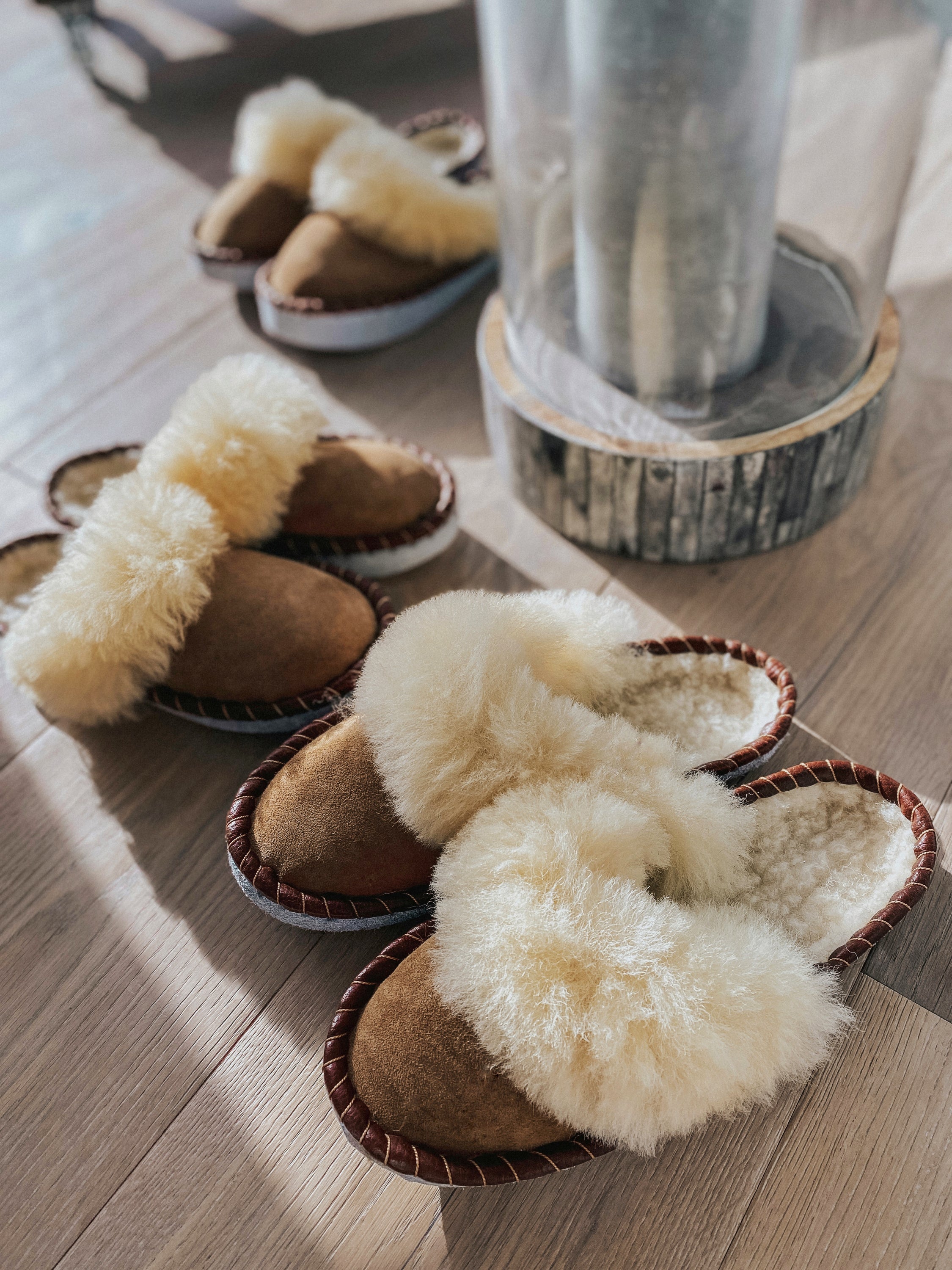 Our cosy limited edition Burnt Caramel slippers slip ons range available in brown leather and natural fur.