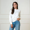 Our stylish long sleeve knit top in a soft and stretchy organic cotton blend has a flattering cut that will pair with anything. Features a rounded neckline, gently bellowed sleeves, and gold buttons at the elongated cuffs for an elevated touch. A staple you'll love that will last.