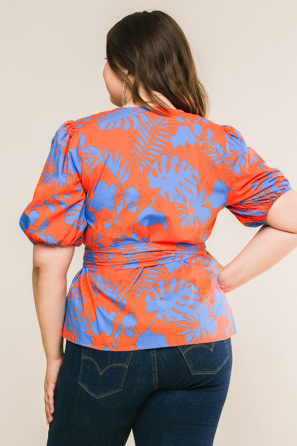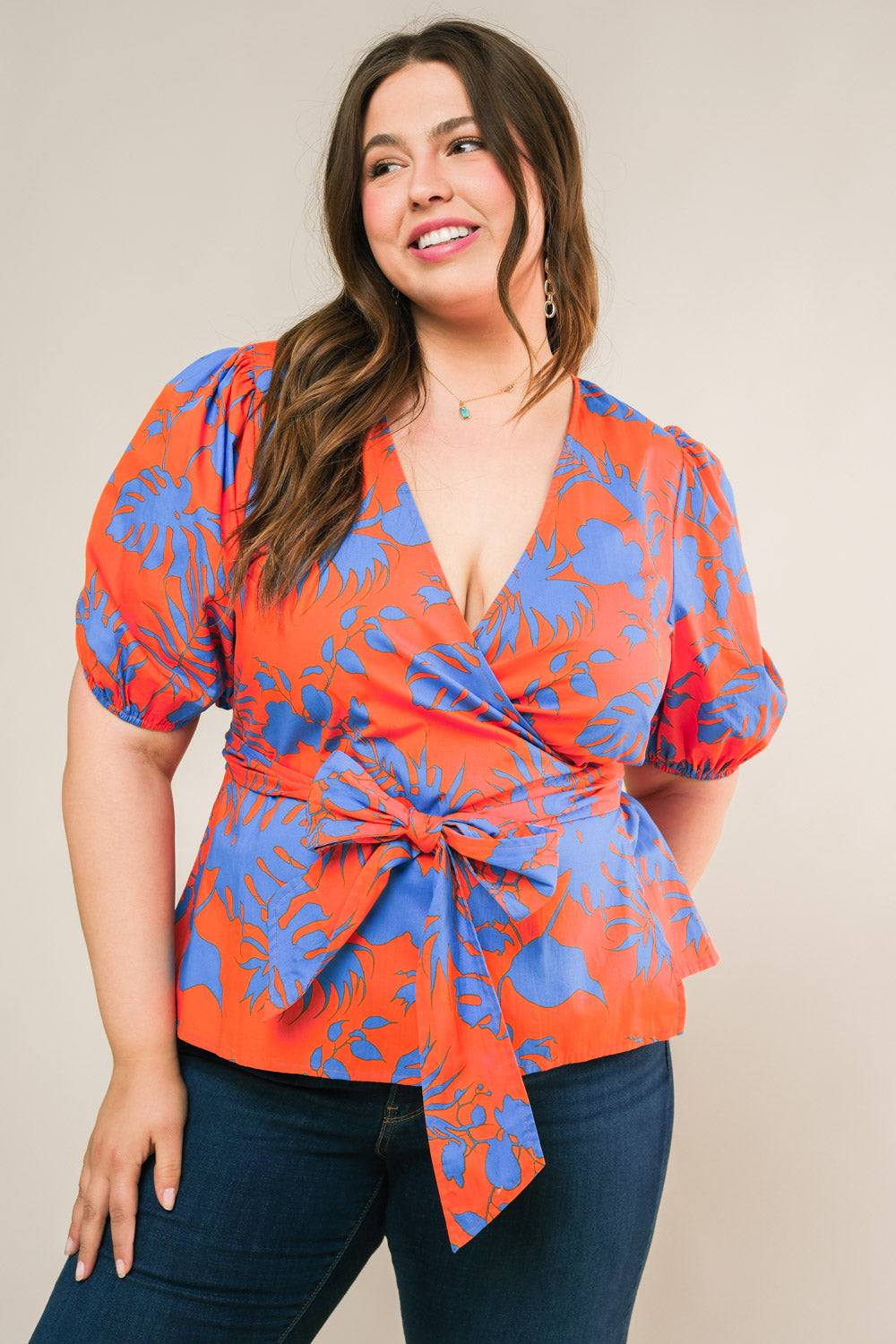 A printed woven top featuring short sleeve and true wrap with ties