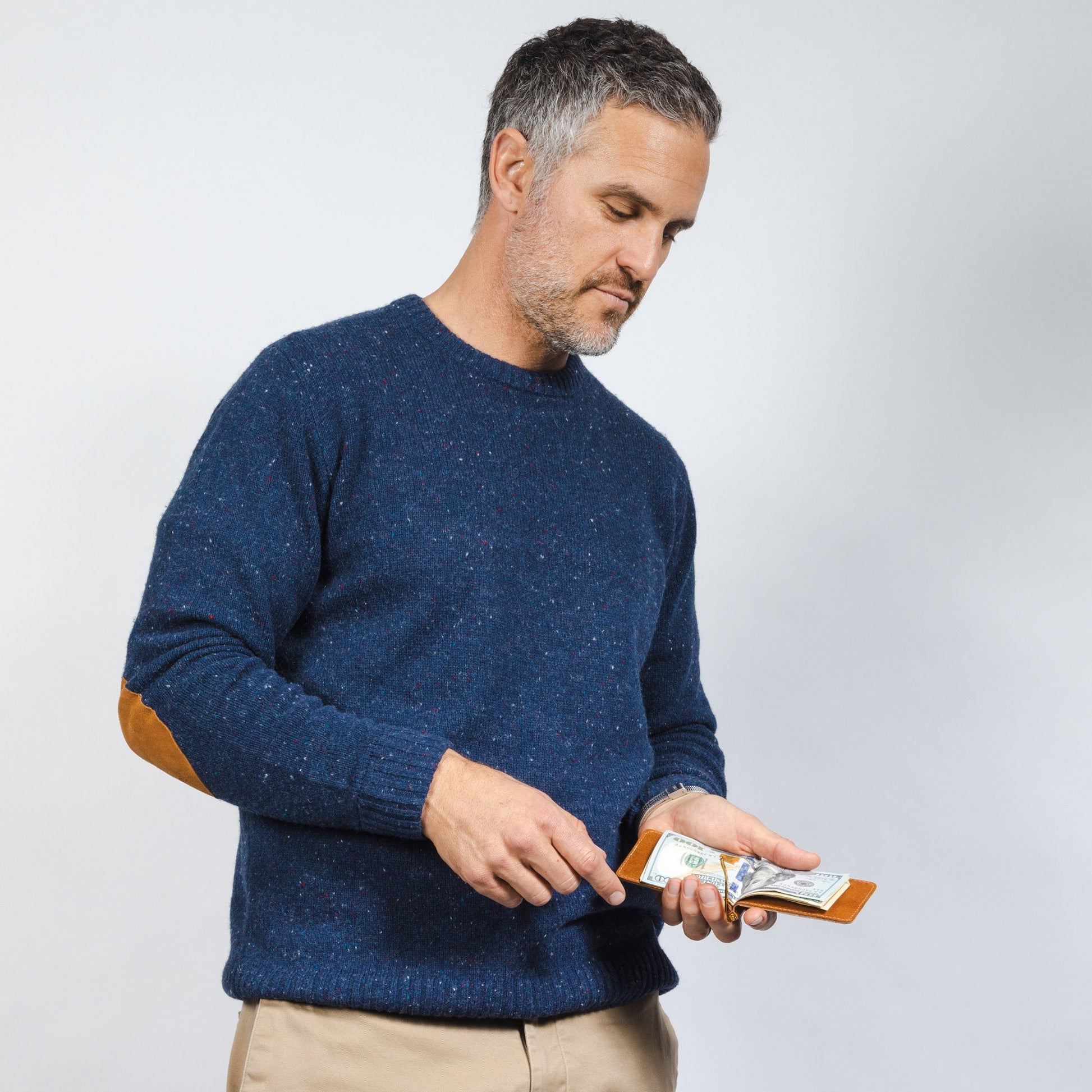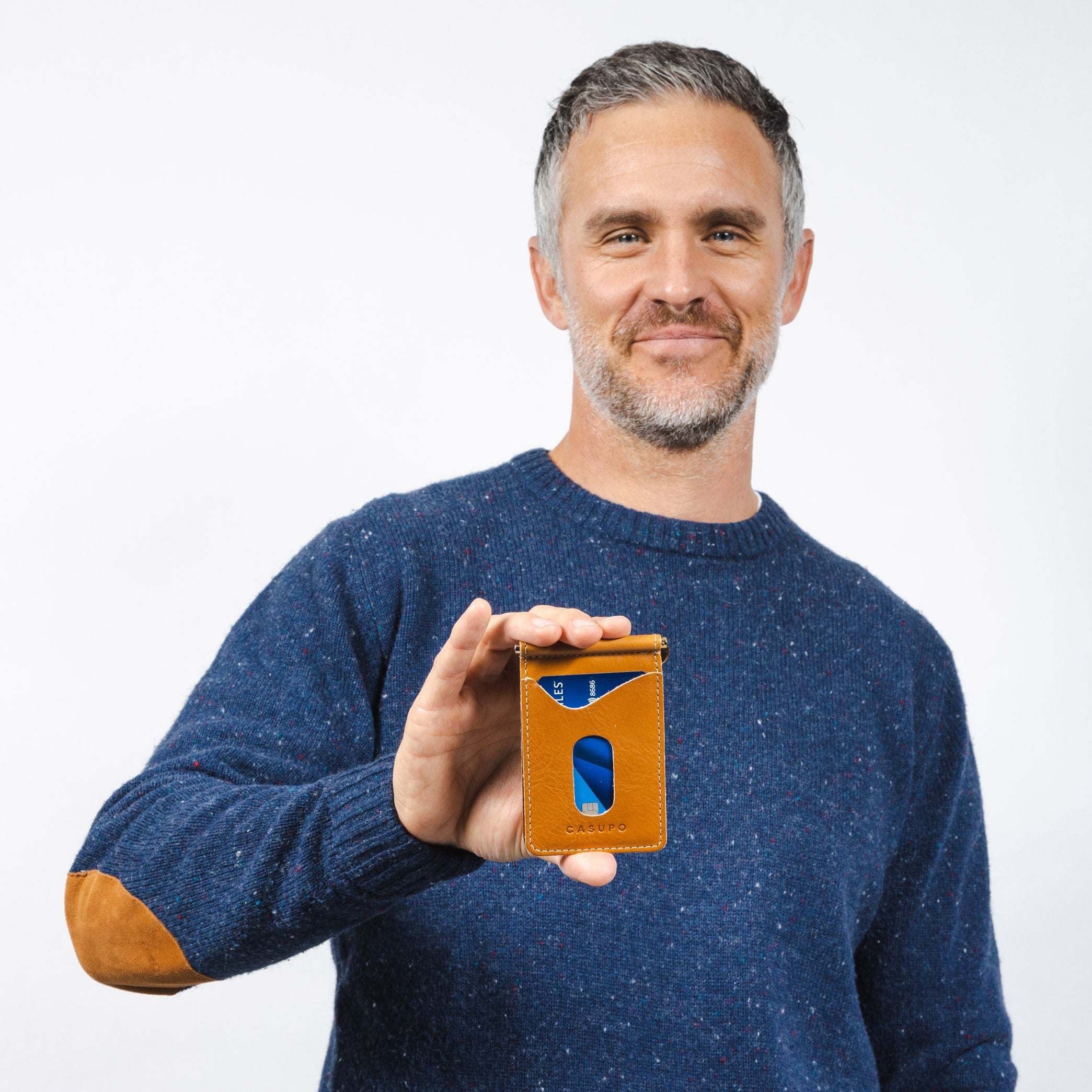 It comes equipped with two external pockets and a money clip for cash in the middle. It is simple, practical and stylish. It is handmade in Los Angeles with naturally dyed leather so it is non toxic and biodegradable.