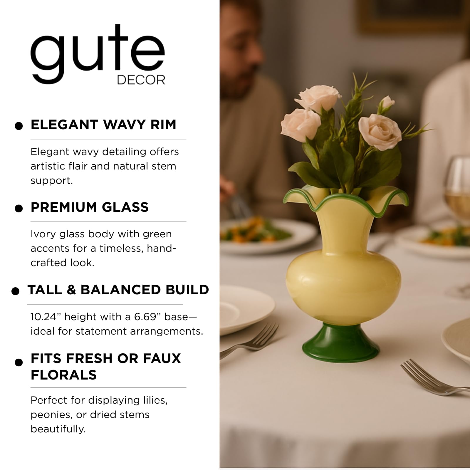Add timeless elegance to your home with this green glass vase, featuring a wavy rim and retro-inspired cream body. Standing 10.24 inches tall, it serves as a large centerpiece perfect for bold botanical arrangements or tall floral displays. The artisan design and reflective finish add a sophisticated glow to any dining room, kitchen, or shelf display. Whether used as a flower holder or decorative table ornament, this vintage inspired piece blends modern style with classic charm. Ideal for fresh or dried arrangements, it complements a range of home accent styles from minimal to ornate. A thoughtful gift for weddings, housewarmings, or anniversaries, this floral container is both functional and beautifully designed.