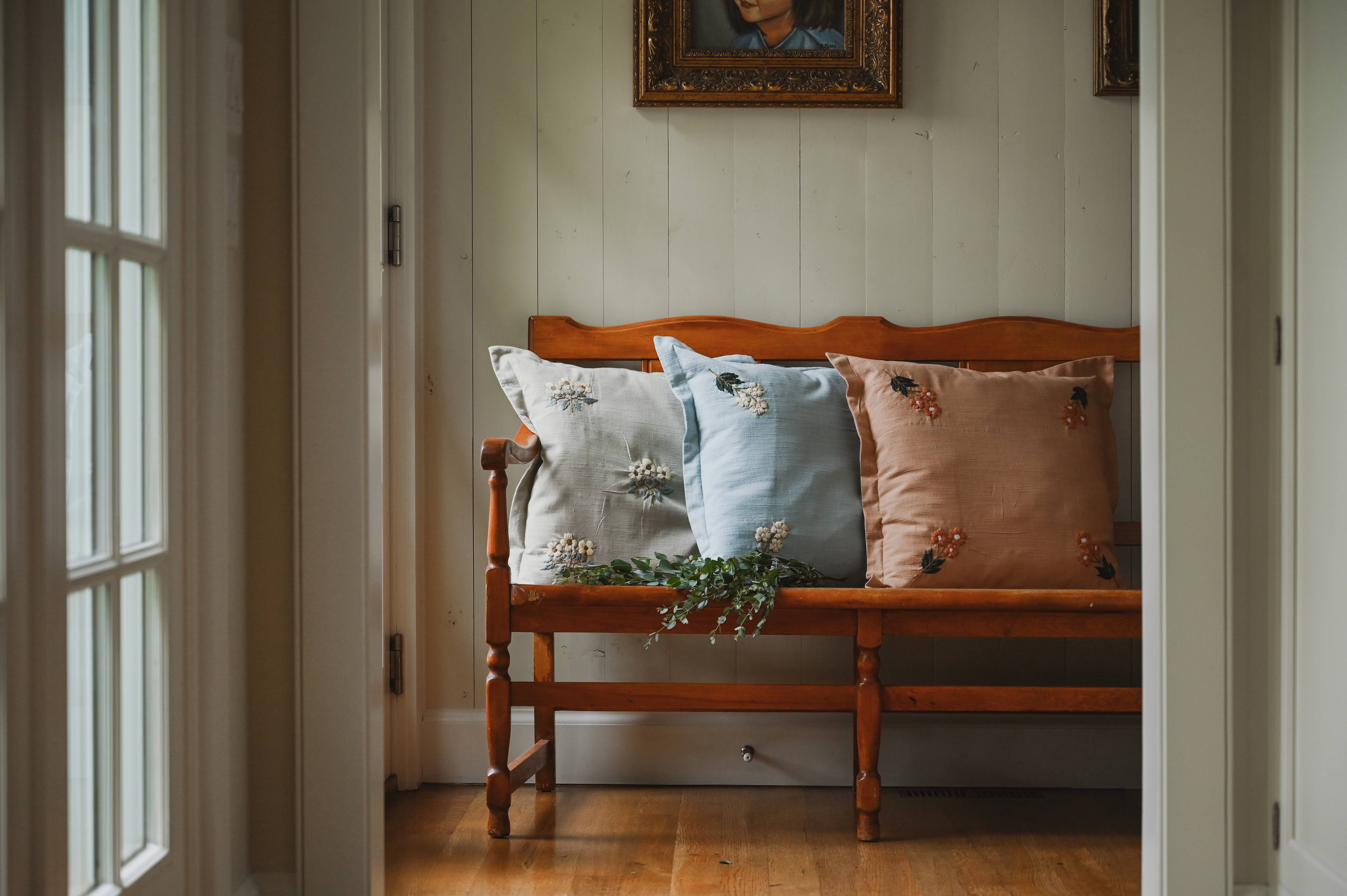 This beautiful, classic pattern features four embroidered flowers on our blue colored pillow. Our Estella pillow features wool thread embroidery and each flower has been hand sewn to make this pillow truly one-of-a-kind.