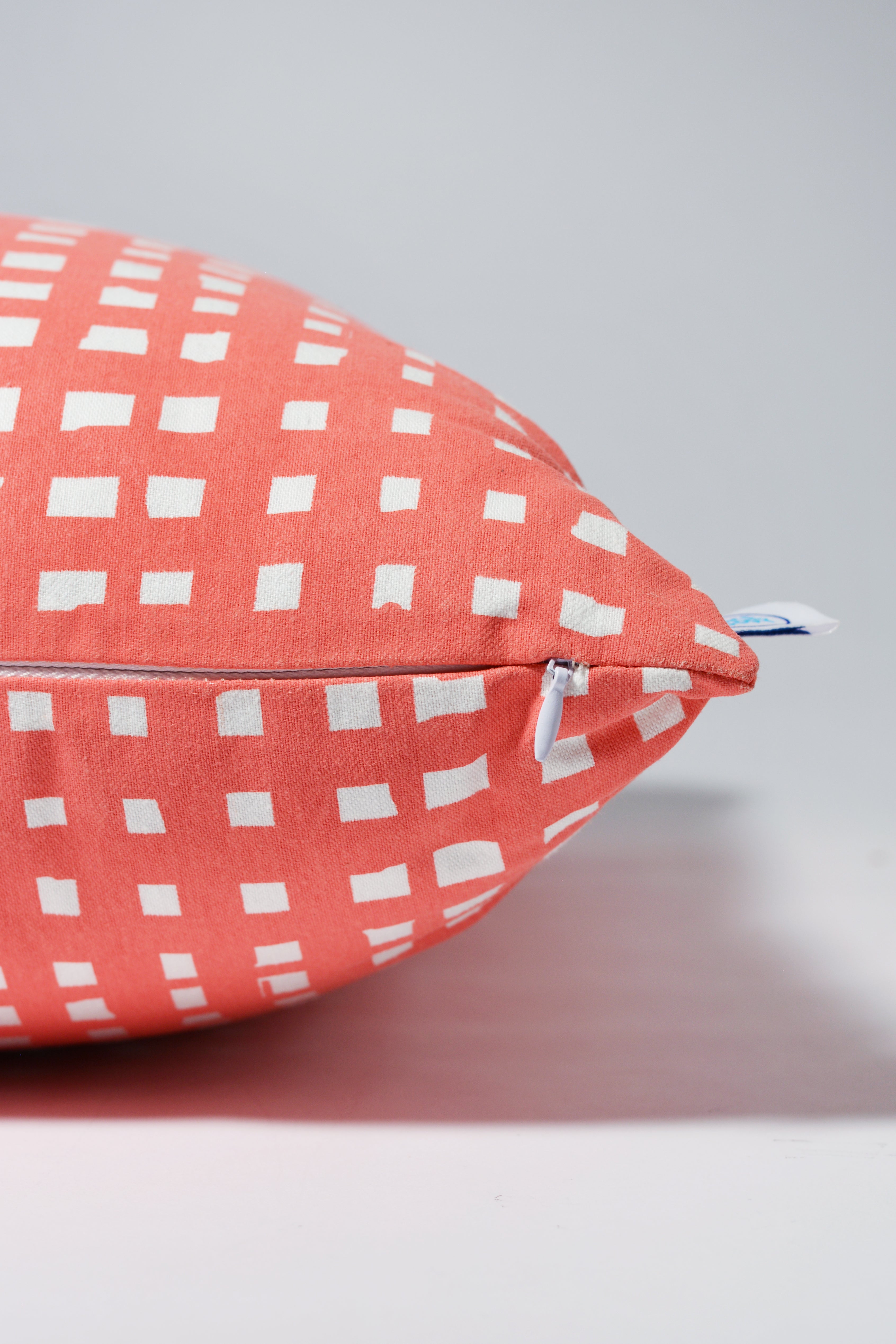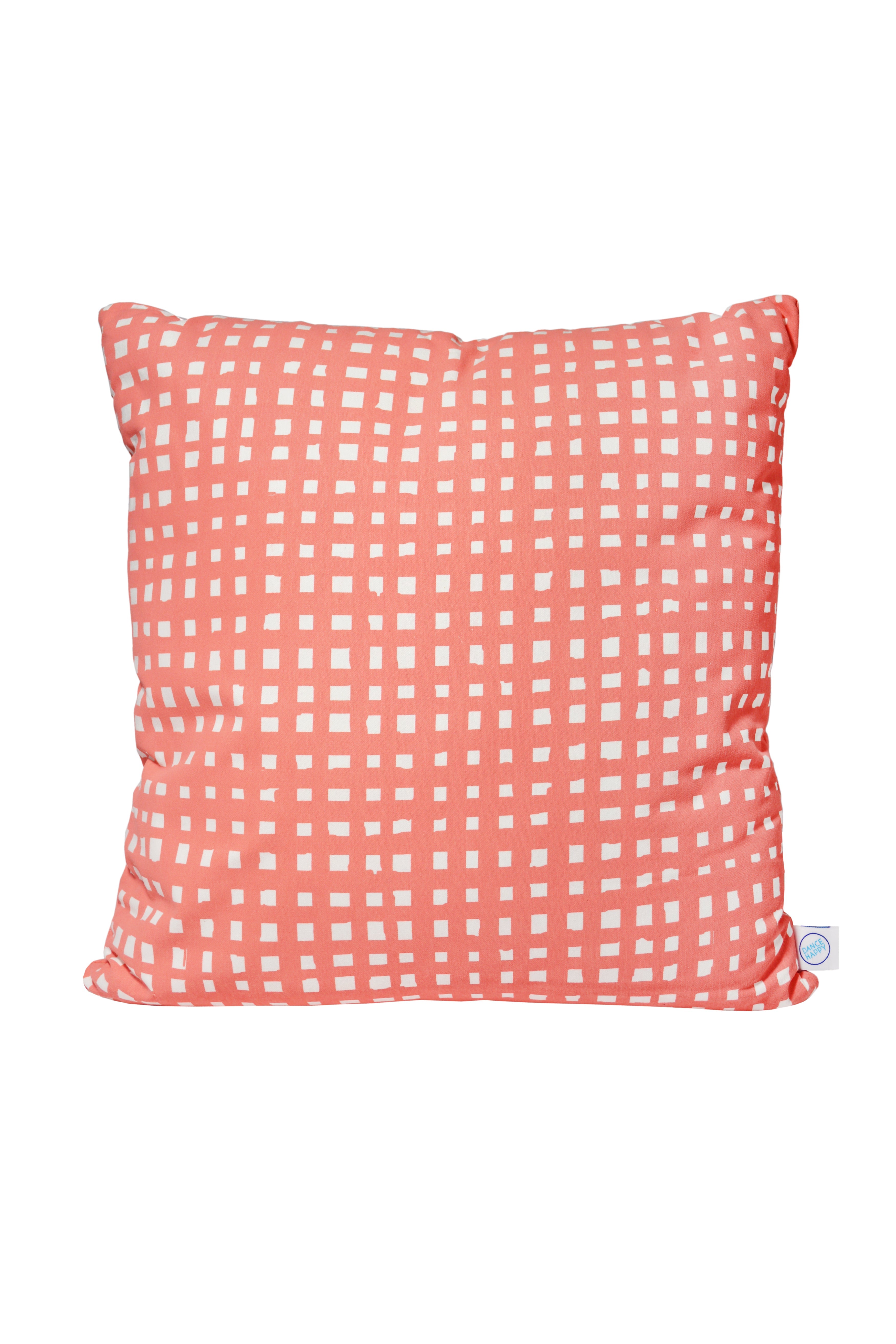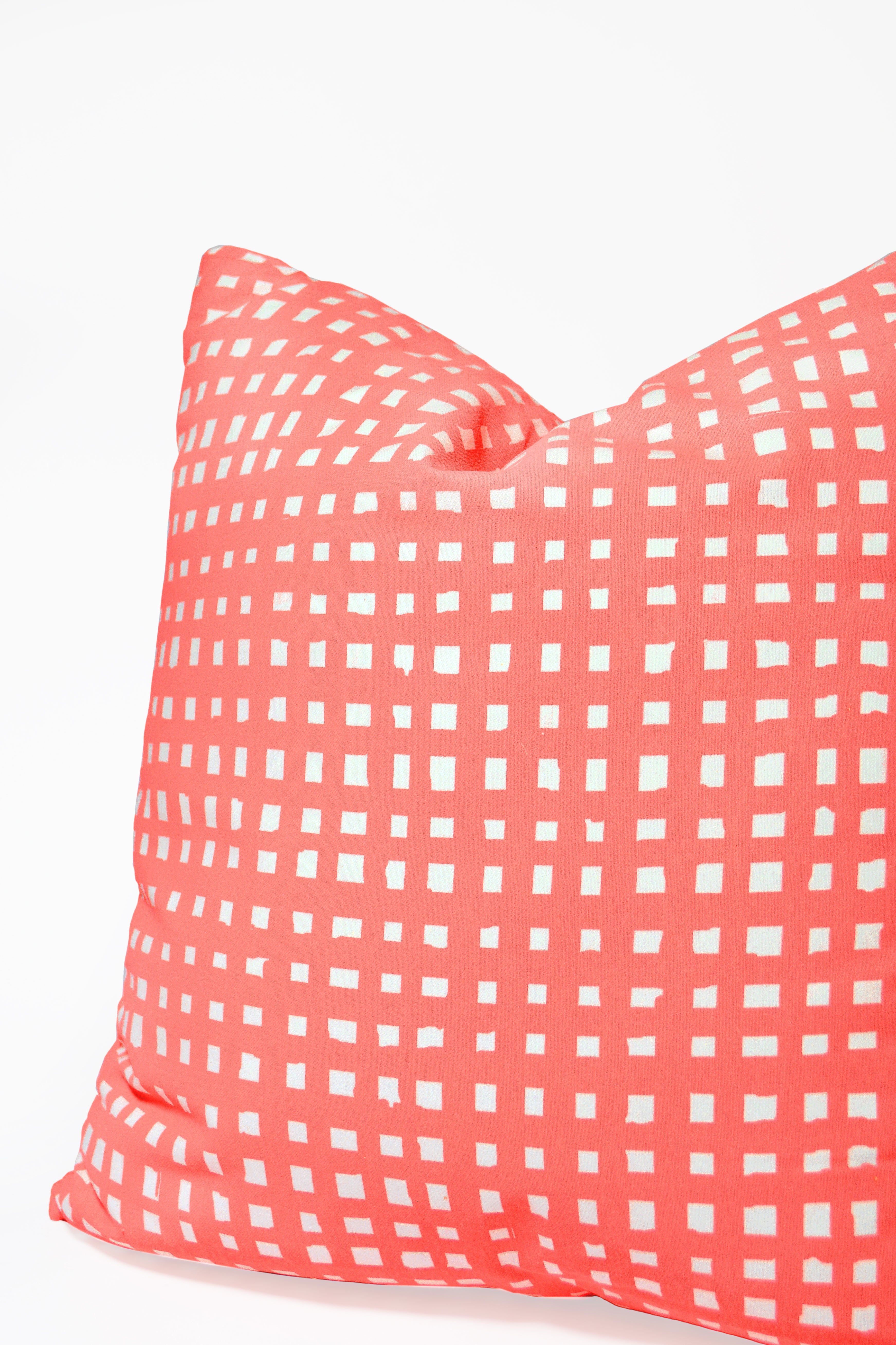 This cozy throw pillow is sure to bring joy to any room! A hand drawn micro grid pattern is screenprinted in coral on white 100% cotton. There's an invisible zipper along the bottom seam so you can take the cover off an wash as needed. This pillow comes with a polyester insert that was made in Georgia, so everything from handprinting the fabric to sewing, this pillow was entirely made in the USA. Intended for indoor use only.