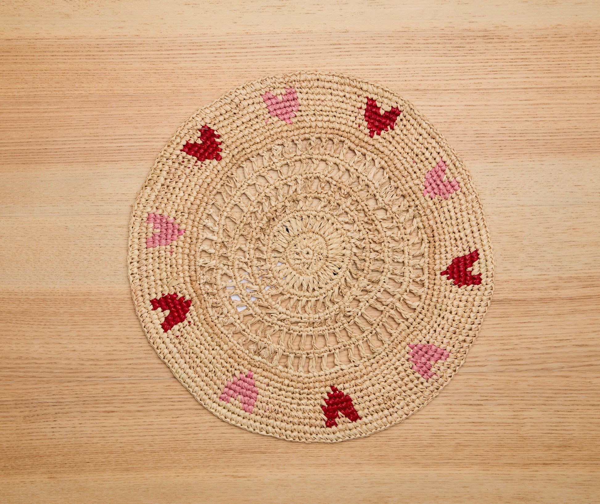 Handwoven Heart Raffia Placemat – Artisan Table Décor with Red & Pink Hearts
