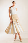 A solid woven midi skirt with side zipper and color blocked