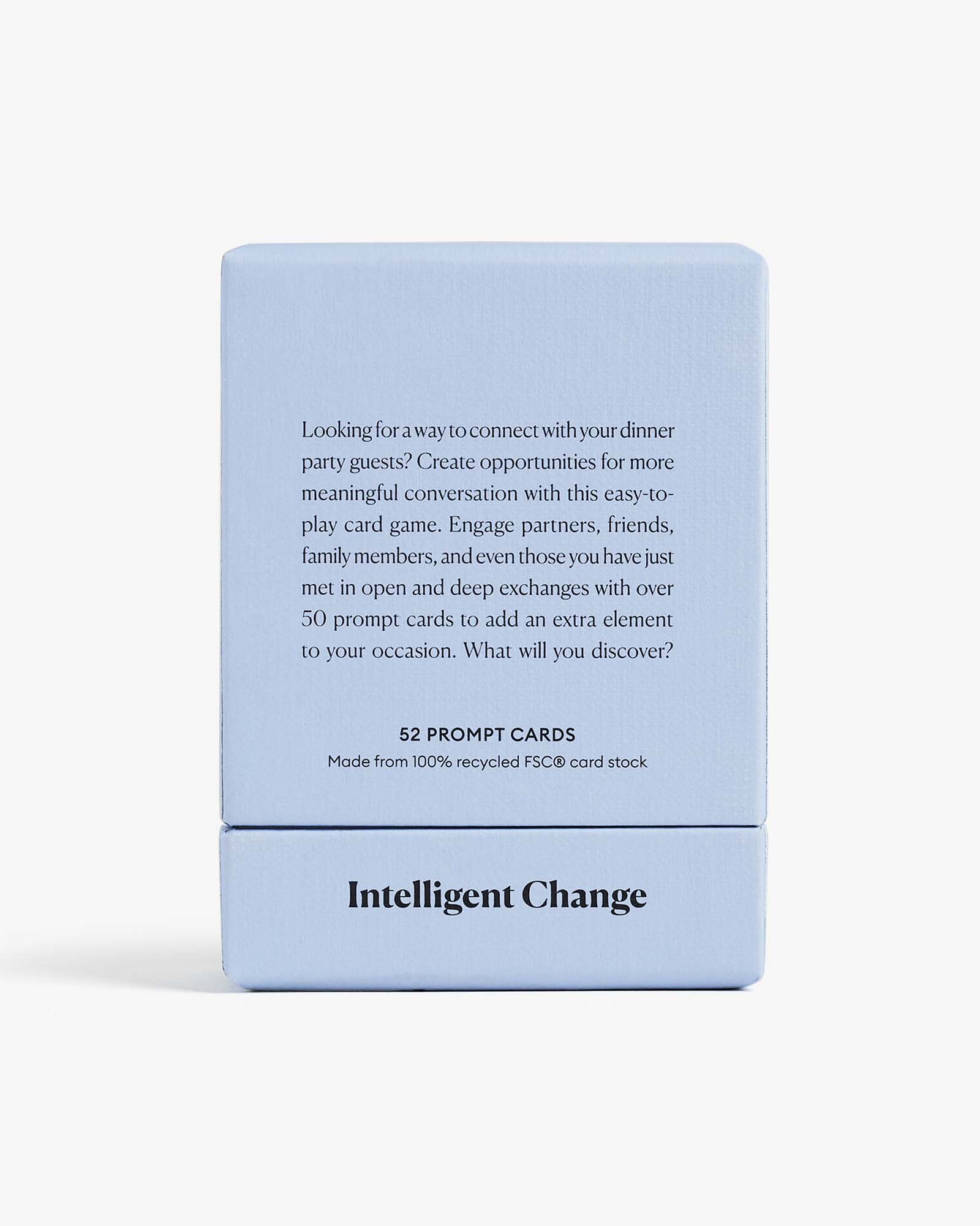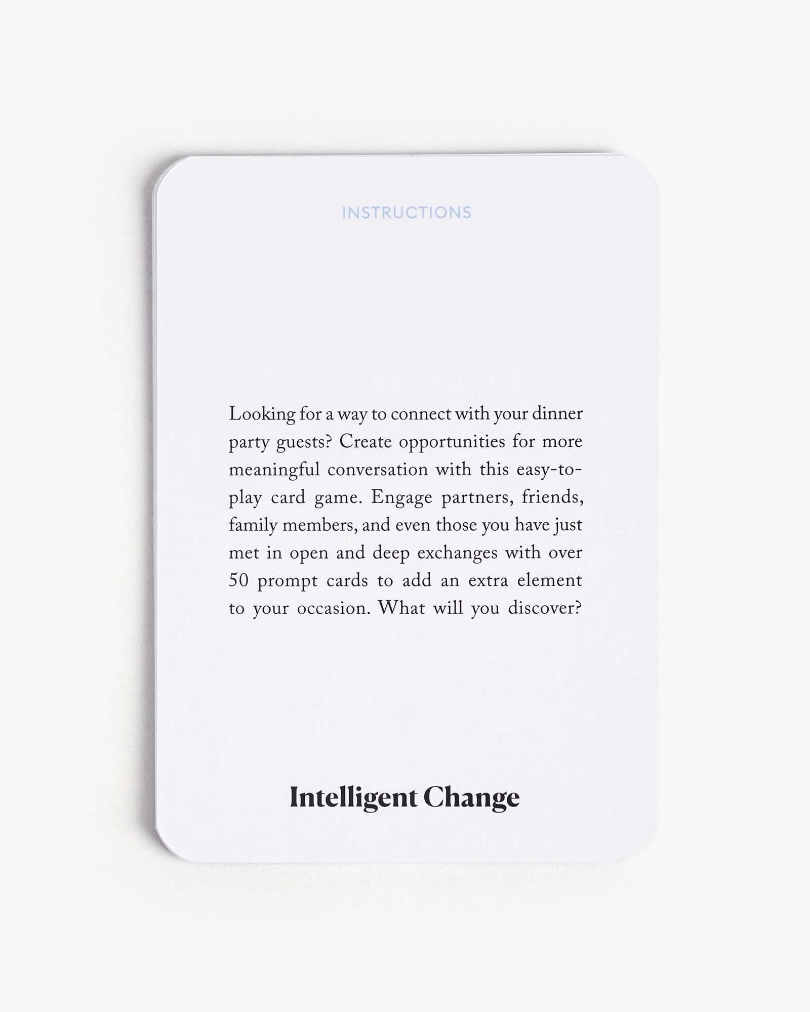 The compact and easy-to-play conversational card game to engage dinner guests, friends, and new acquaintances in open, entertaining, and deep conversations about the important questions in life.