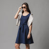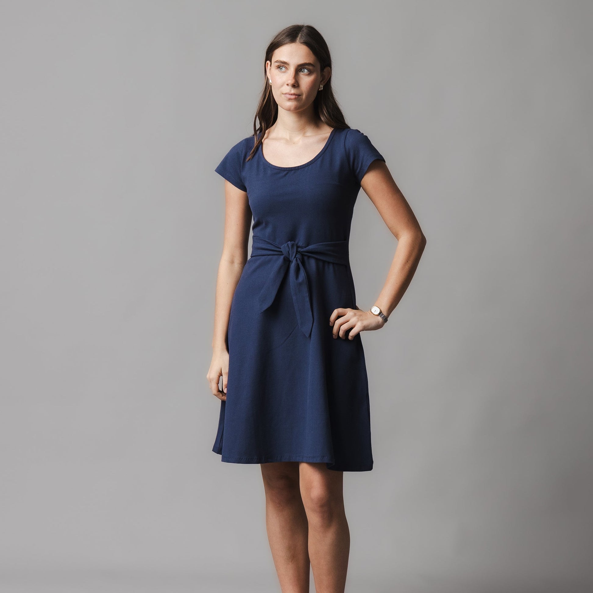 An easy fit and flare silhouette and comfy stretch-blend organic cotton make this universally flattering dress a spring and summer staple. Features short sleeves, a rounded neckline, and a faux waist tie for that feminine touch. Waist tie can be worn to the front or the back for versatility of looks!