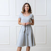 An easy fit and flare silhouette and comfy stretch-blend organic cotton make this universally flattering dress a spring and summer staple. Features short sleeves, a rounded neckline, and a faux waist tie for that feminine touch. Waist tie can be worn to the front or the back for versatility of looks!