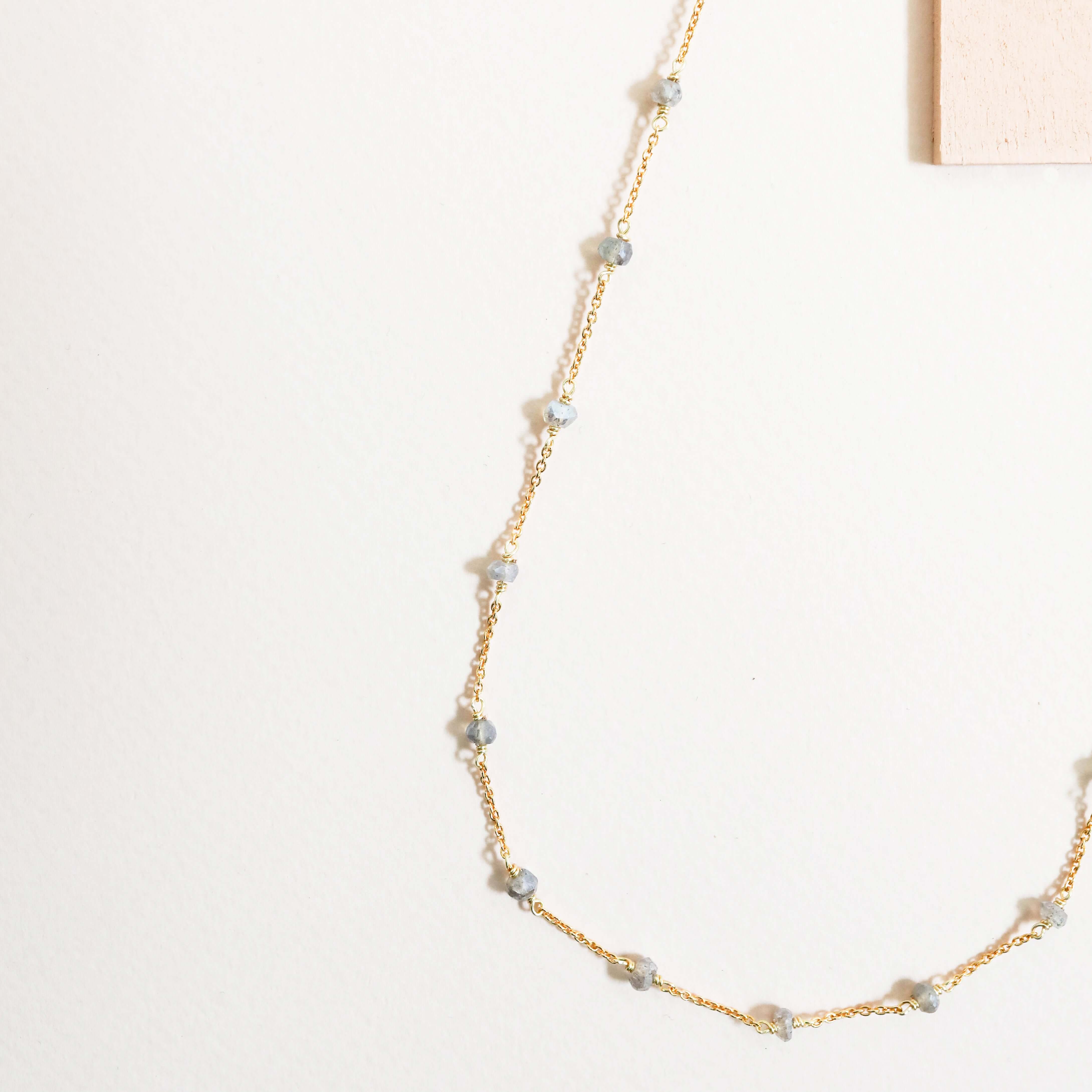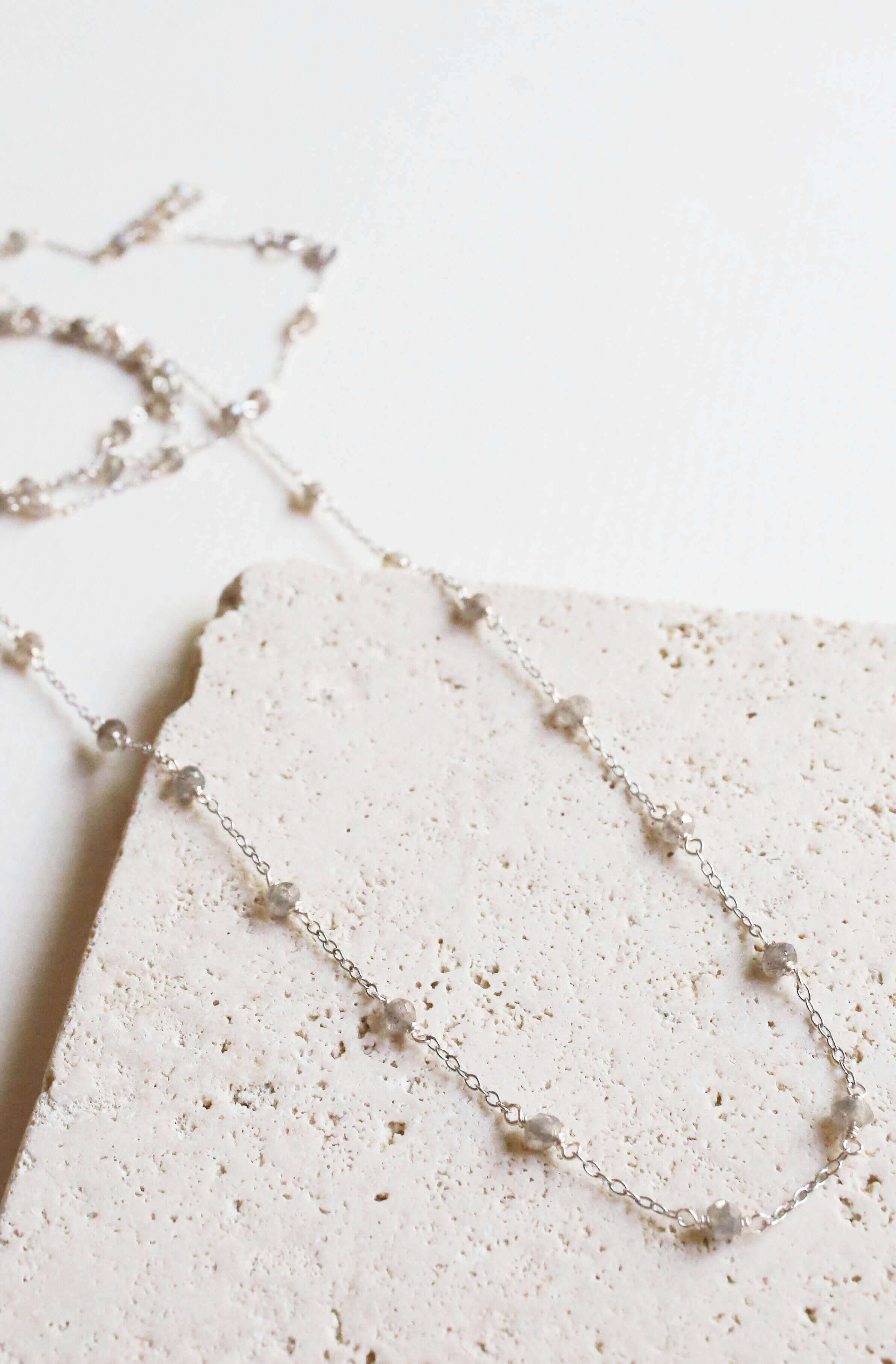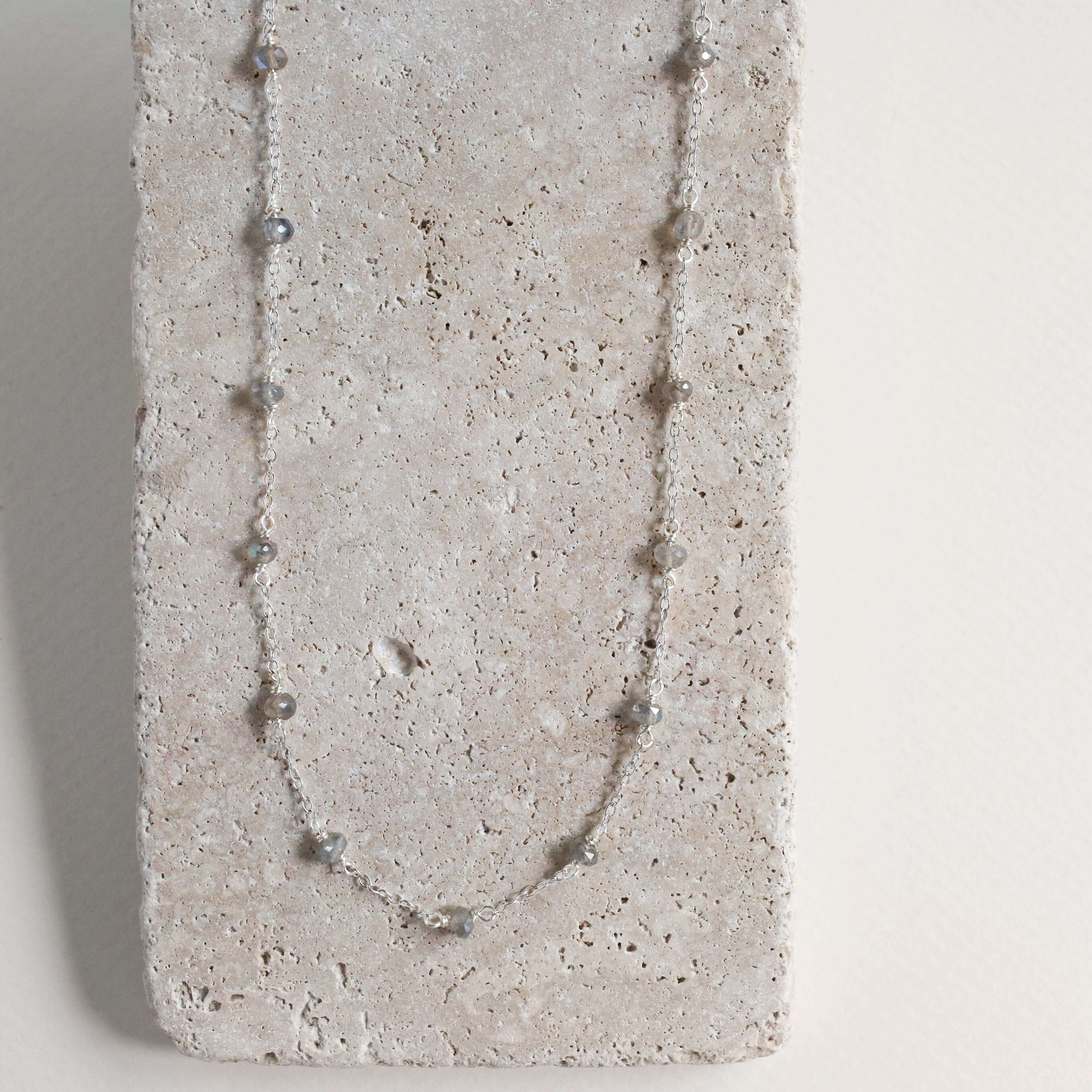 Our long labradorite necklace is a simple, delicate chain that's easy to wear with anything. We also intended it as a layering piece with some of our shorter gemstone necklaces.