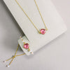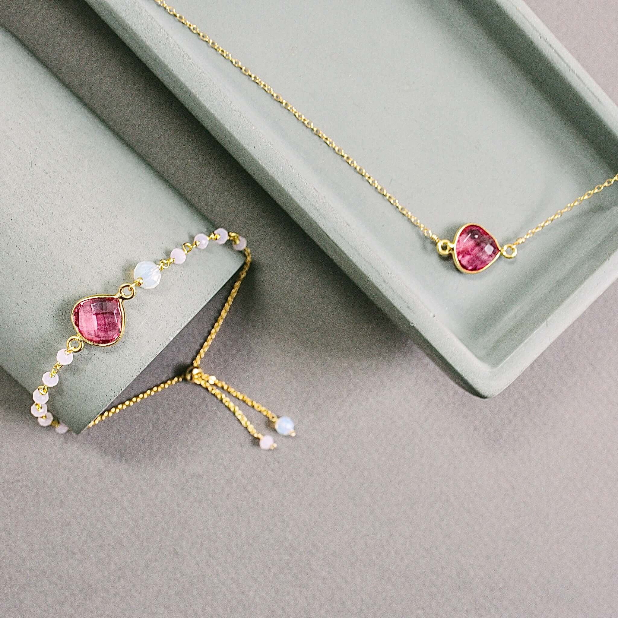This set is perfect for those who love a subtle jewelry set. It's handmade with Pink Tourmaline Quartz heart bezel stones and 14k gold plated sterling silver. Both necklace and bracelet are adjustable. Necklace is adustable up to 18".
