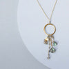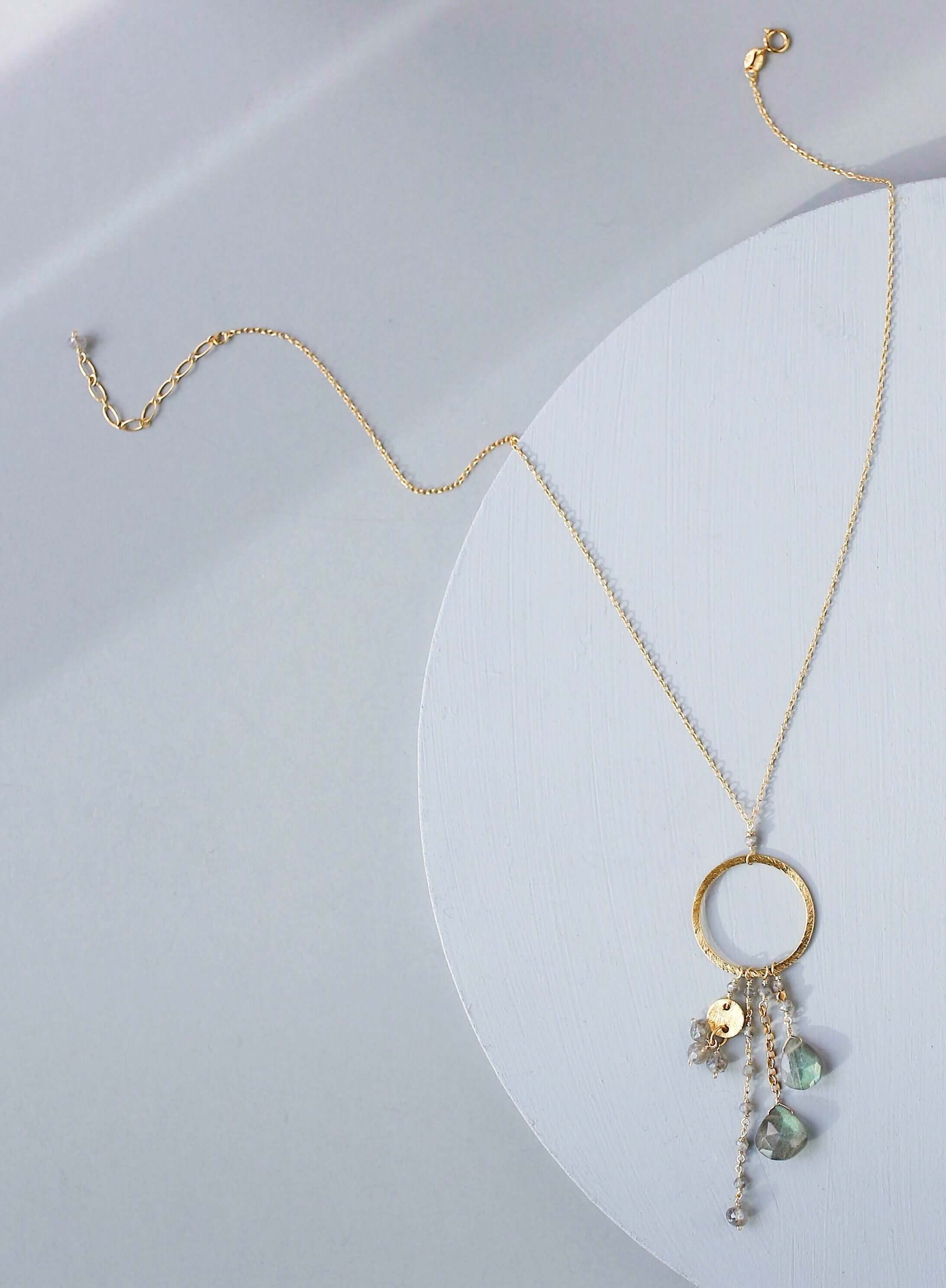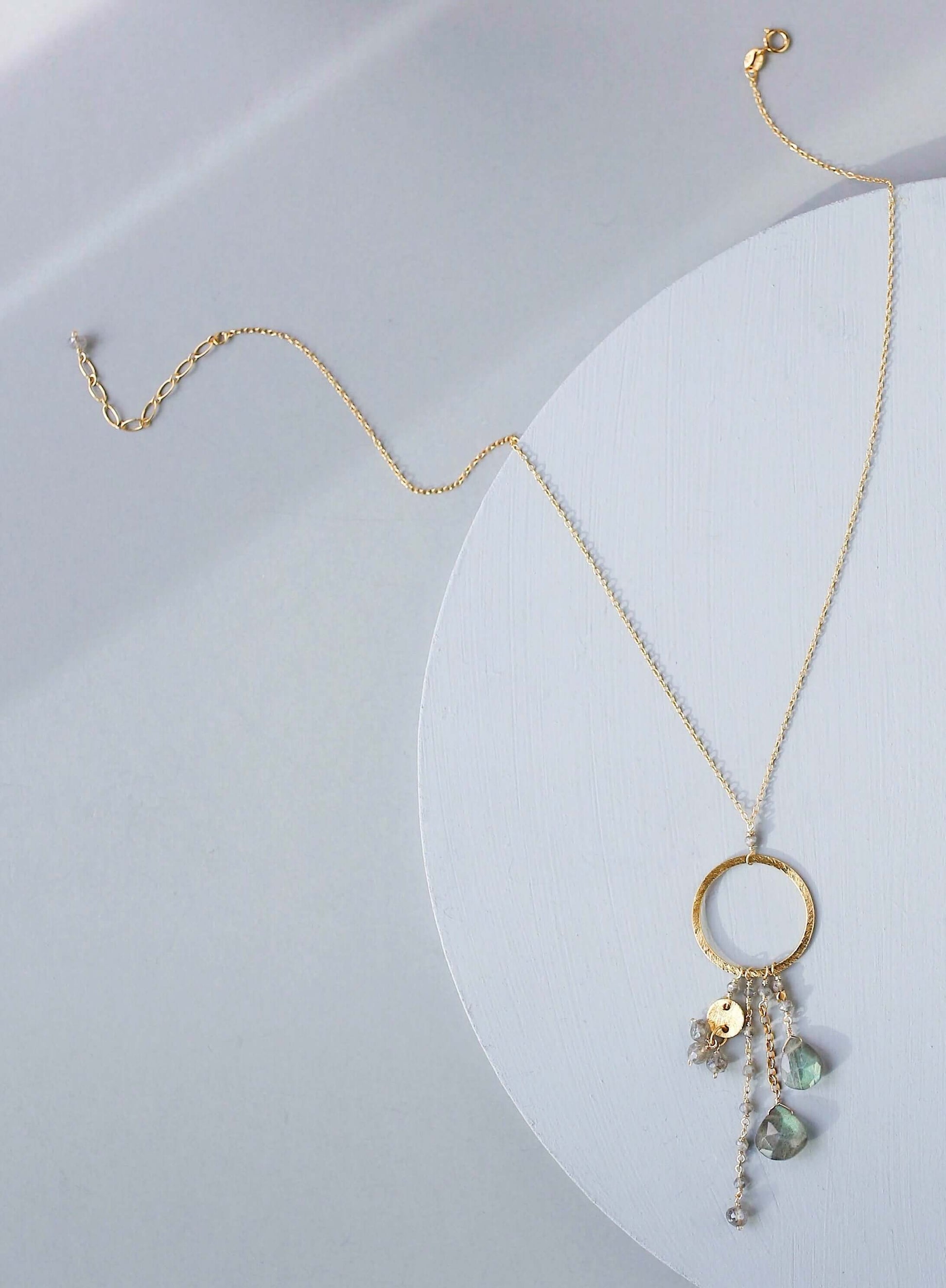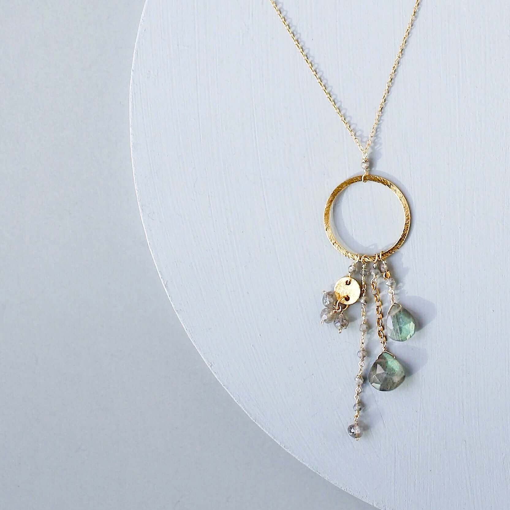 Lush labradorite gemstone pendant necklace with multiple strands of gemstone combinations dangling from a 14k gold plated hoop.