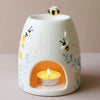 Crafted from ceramic, painted, and glazed, this burner features charming embossed bees nestled among delicate flowers. It is beautifully finished with a ceramic bee perched at the top, adding an extra touch of sweetness.