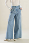 A washed denim pant featuring front closure, side pocket with button detail, and wide leg.