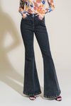 A washed denim pant featuring front closure, pockets and stud embellished side and flare leg