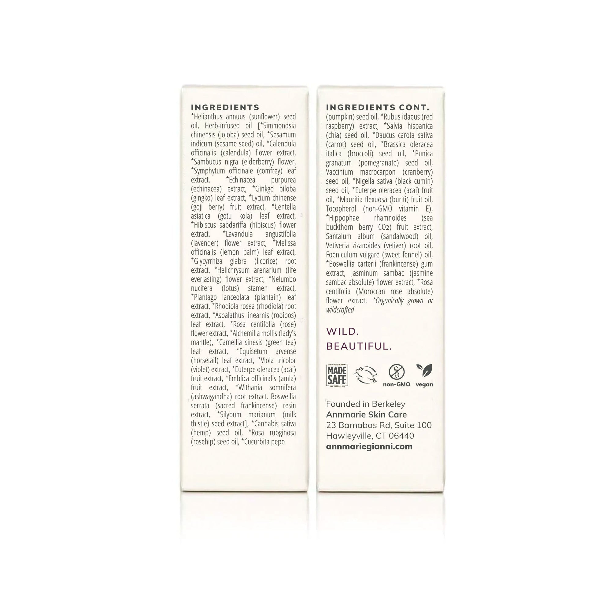 *Helianthus annuus (sunflower) seed oil, Herb-infused oil [*Simmondsia chinensis (jojoba) seed oil, *Sesamum indicum (sesame seed) oil, *Calendula officinalis (calendula) flower extract, *Sambucus nigra (elderberry) flower, *Symphytum officinale (comfrey) leaf extract, *Echinacea purpurea (echinacea) extract, *Ginkgo biloba (gingko) leaf extract, *Lycium chinense (goji berry) fruit extract, *Centella asiatica (gotu kola) leaf extract, *Hibiscus sabdariffa (hibiscus) flower extract, *Lavandula angustifolia (lavender) flower extract, *Melissa officinalis (lemon balm) leaf extract, *Glycyrrhiza glabra (licorice) root extract, *Helichrysum arenarium (life everlasting) flower extract, *Nelumbo nucifera (lotus) stamen extract, *Plantago lanceolata (plantain) leaf extract, *Rhodiola rosea (rhodiola) root extract, *Aspalathus linearnis (rooibos) leaf extract, *Rosa centifolia (rose) flower extract, *Alchemilla mollis (lady's mantle), *Camellia sinesis (green tea) leaf extract, *Equisetum arvense (horsetail) leaf extract, *Viola tricolor (violet) extract, *Euterpe oleracea (acai) fruit extract, *Emblica officinalis (amla) fruit extract, *Withania somnifera (ashwagandha) root extract, Boswellia serrata (sacred frankincense) resin extract, *Silybum marianum (milk thistle) seed extract], *Cannabis sativa (hemp) seed oil, *Rosa rubginosa (rosehip) seed oil, *Cucurbita pepo (pumpkin) seed oil, *Rubus idaeus (red raspberry) extract, *Salvia hispanica (chia) seed oil, *Daucus carota sativa (carrot) seed oil, *Brassica oleracea italica (broccoli) seed oil, *Punica granatum (pomegranate) seed oil, Vaccinium macrocarpon (cranberry) seed oil, *Nigella sativa (black cumin) seed oil, *Euterpe oleracea (acai) fruit oil, *Mauritia flexuosa (buriti) fruit oil, Tocopherol (non-GMO vitamin E), *Hippophae rhamnoides (sea buckthorn berry CO2) fruit extract, Santalum album (sandalwood) oil, Vetiveria zizanoides (vetiver) root oil, Foeniculum vulgare (sweet fennel) oil, *Boswellia carterii (frankincense) gum extract, Jasminum sambac (jasmine sambac absolute) flower extract, *Rosa centifolia (Moroccan rose absolute) flower extract. *Organically grown or wildcrafted