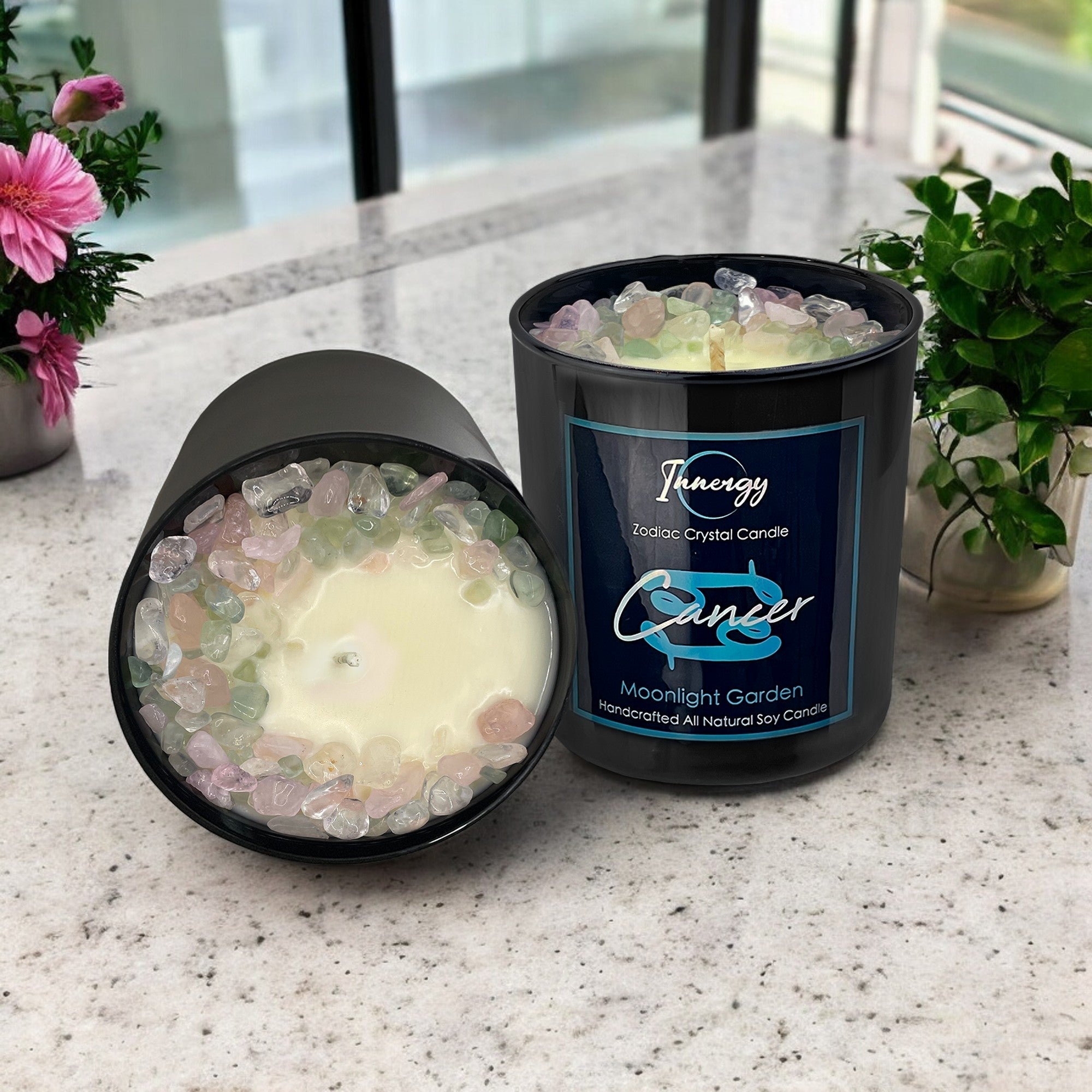 Introducing the Cancer Zodiac Crystal Soy Wax Candle, a creation that captures the essence of Cancer's nurturing and intuitive spirit. The luxury "Moonlight Garden" scent is a delicate yet profound blend, featuring rich floral notes cradled by the freshness of green leaves, the zest of citrus, and the subtle, soothing touch of neroli. This fragrance is a heartfelt homage to the deeply emotional, empathetic, and caring nature of those born under the Cancer sign.