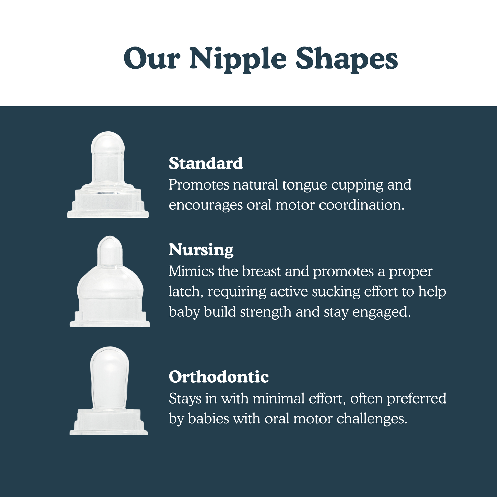 Our interchangeable nipples are crafted from 100% medical-grade silicone—hypoallergenic, non-toxic, PFAS-tested, and latex-free. Designed to offer ultimate comfort while supporting safe oral development, they’re available in three shapes to match your baby’s preferences.