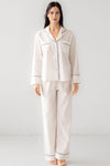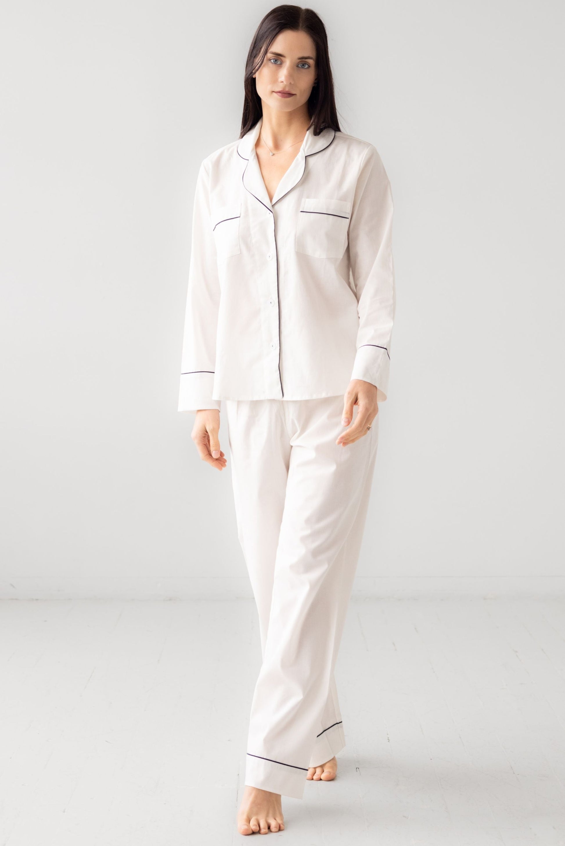 Timeless and refined, this crisp, lightweight 100% cotton pajama set blends effortless comfort with impeccable craftsmanship. The button-down shirt features two modesty pockets on the chest and subtle contrast piping for a polished finish, while the slightly high-waisted pants have an elastic waistband for a relaxed, flattering fit. Soft, breathable cotton makes it perfect for lounging, dreaming, and everyday ease.