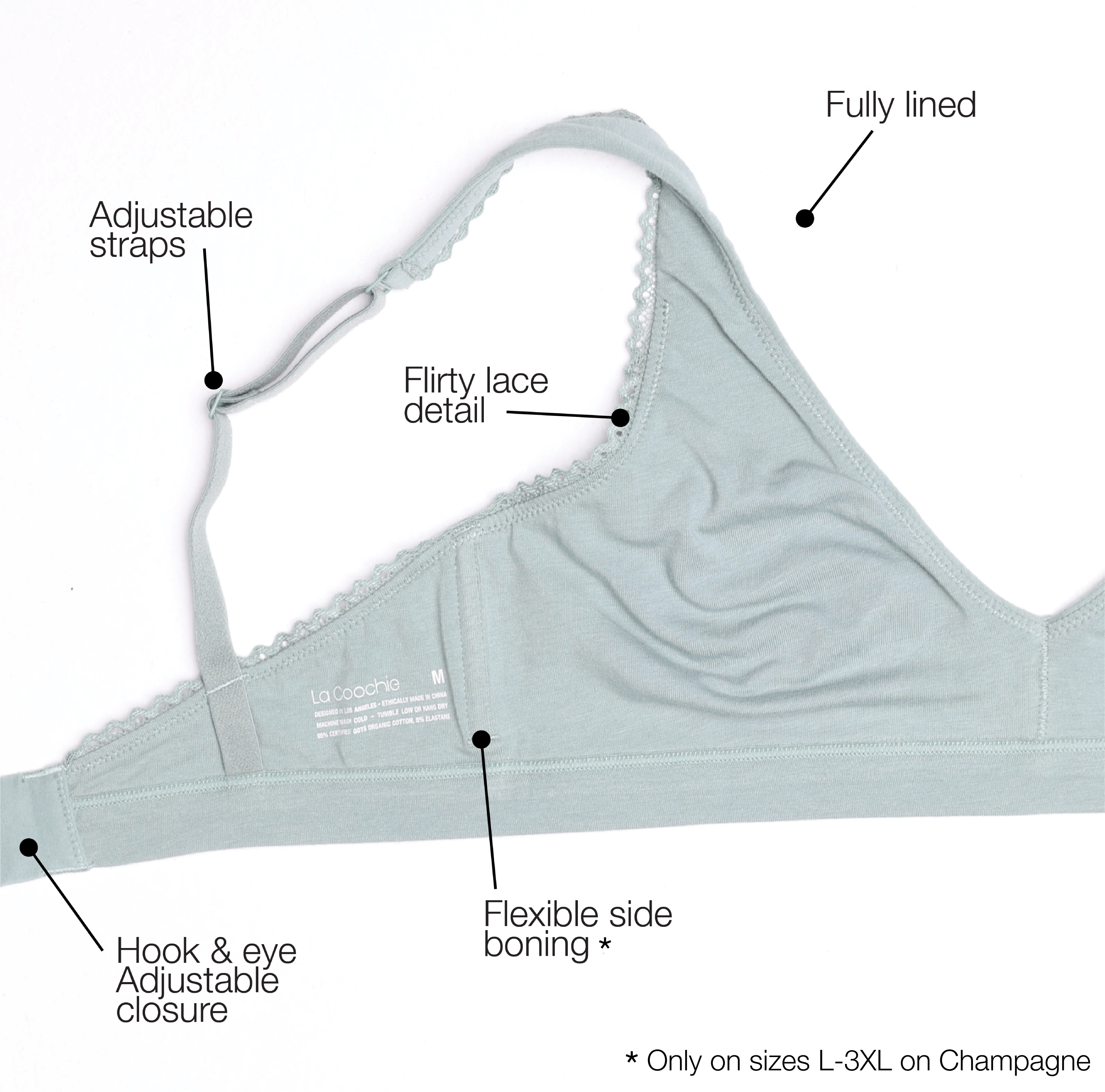 The scoop bralette is wireless and oh-so comfy, making it the perfect everyday bra. It features adjustable straps and a wider hook-and-eye closure for a customizable fit. Designed with unpadded, fully lined cups and supportive, flexible side boning. Made with soft GOTS-certified organic cotton and detailed with our subtly feminine lace trim.