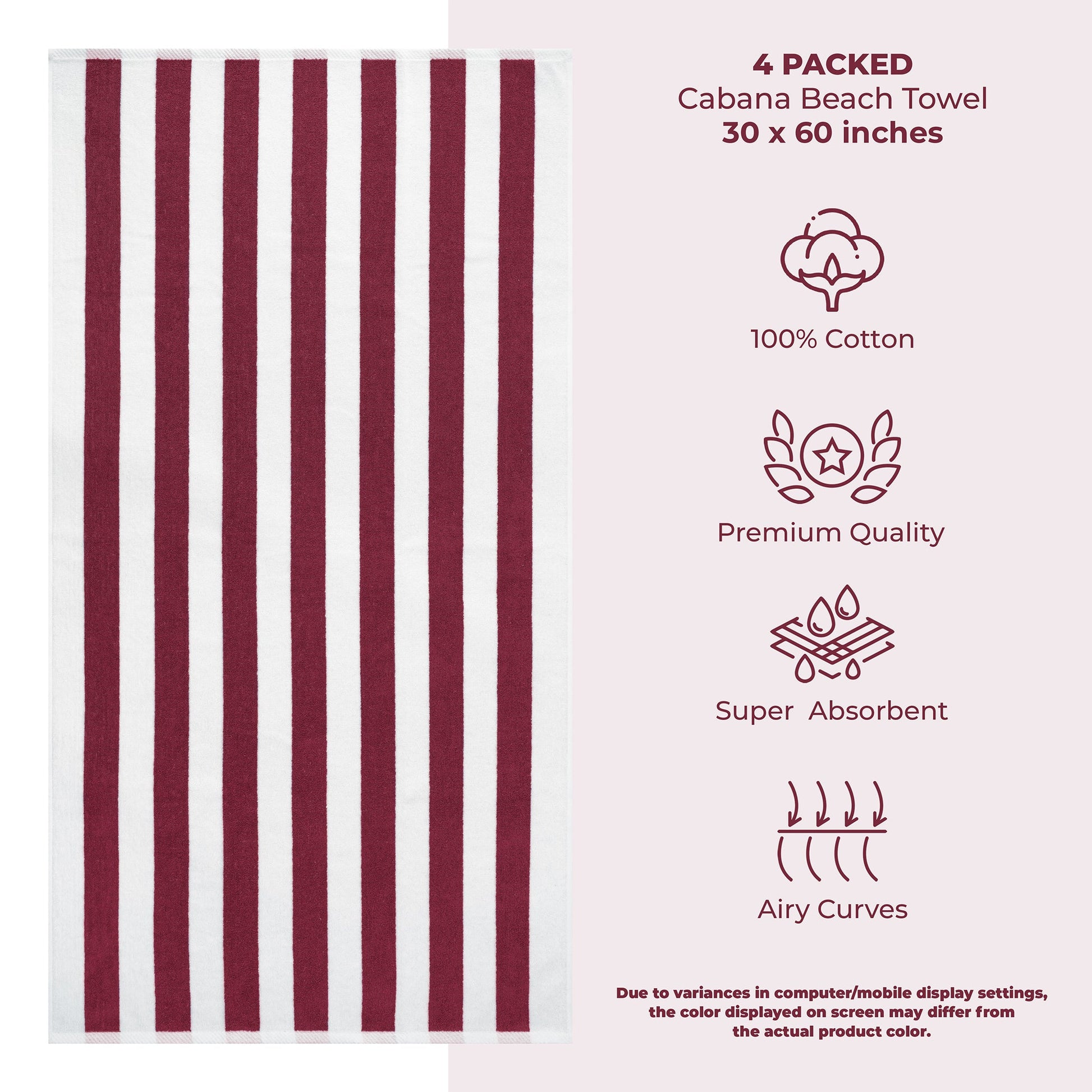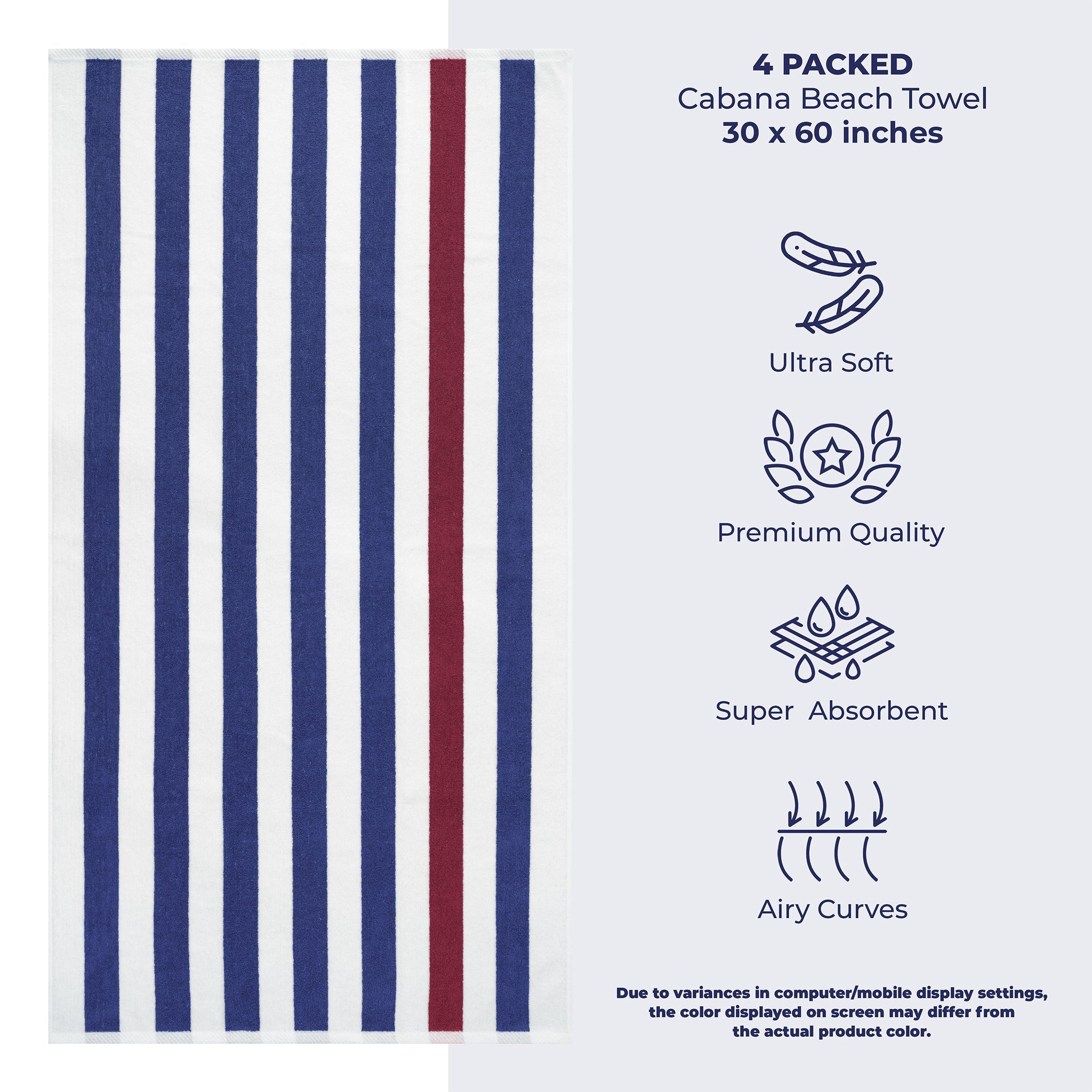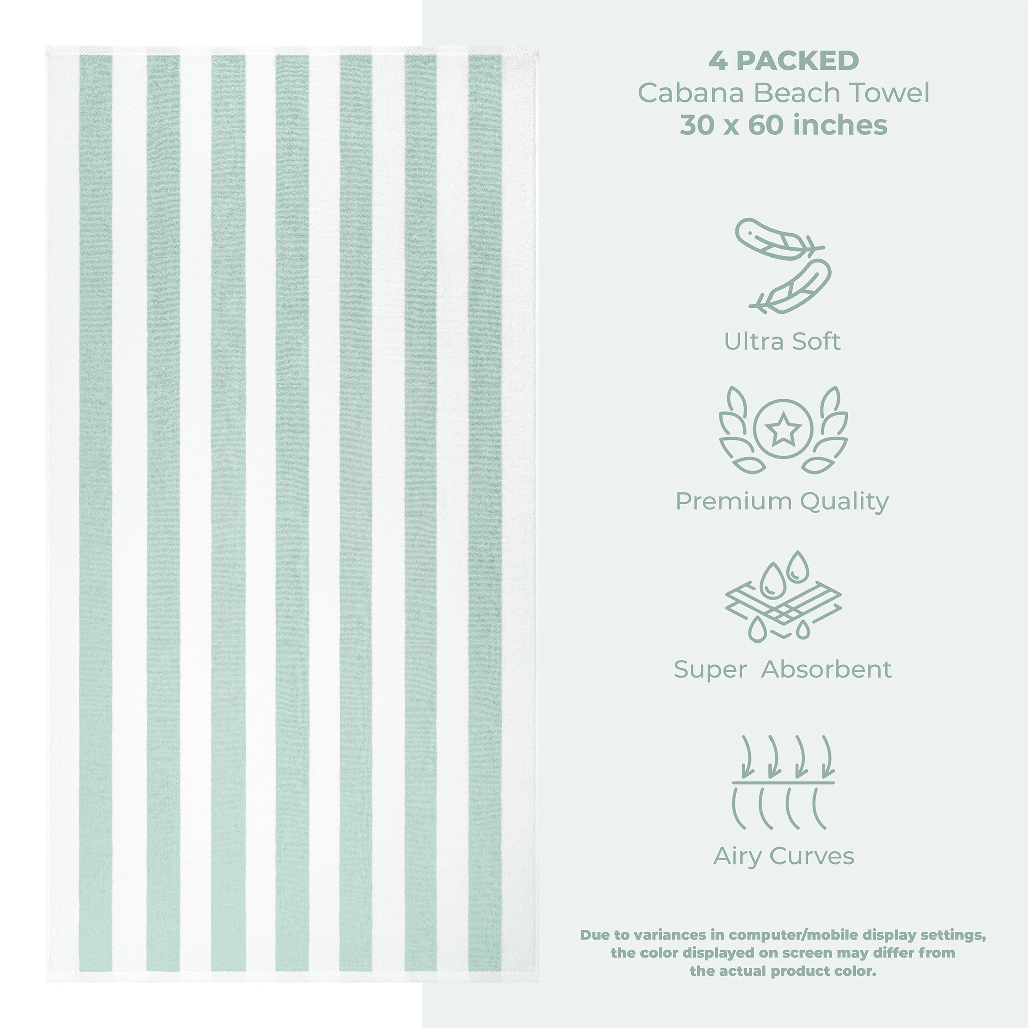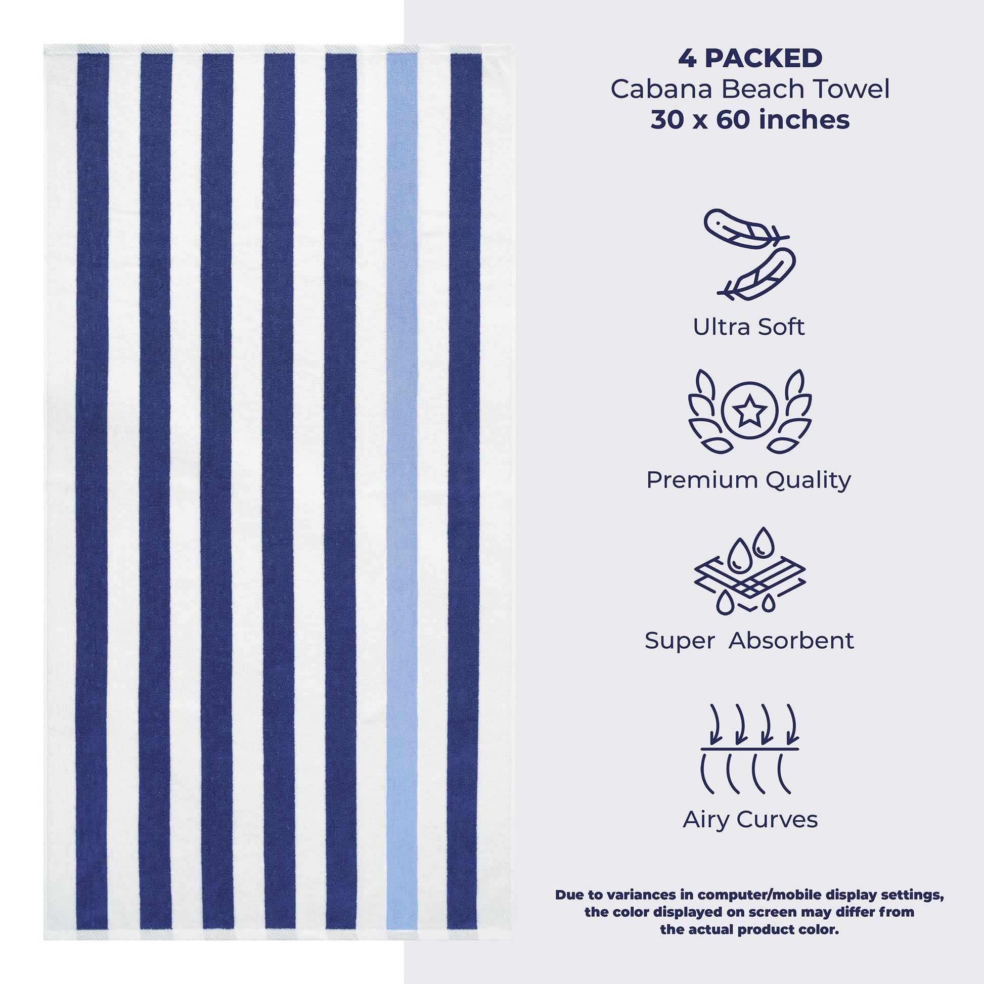 4 Pack Cabana Striped Oversized Beach Towel 30x60 Inch, Premium Cotton, Soft Absorbent, Sand Free, Swim Towels