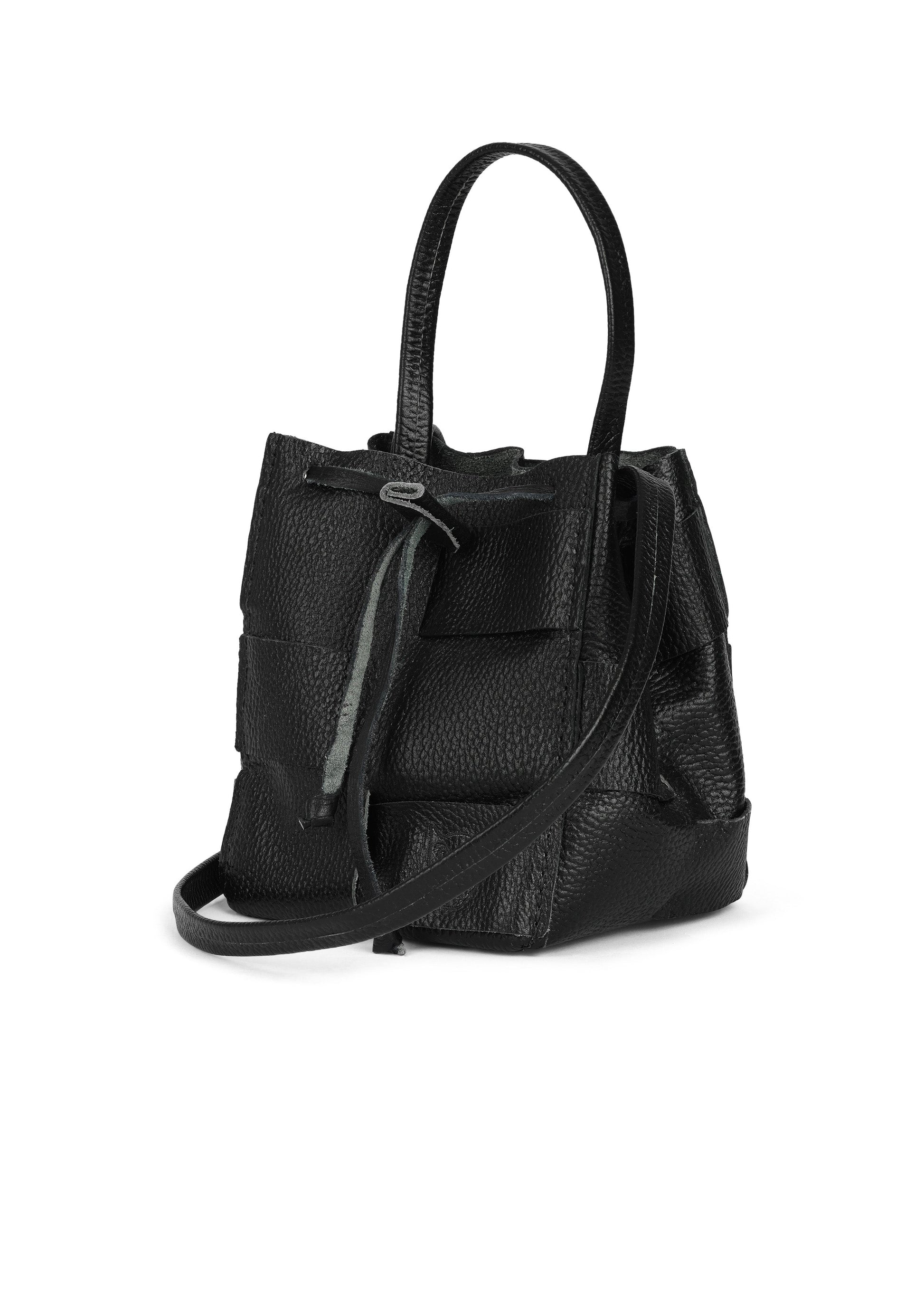 Crossbody bucket bag, hand woven with soft pebbled leather. Hand woven with drawstring closure. Part of our 'Deconstructed Line', this piece has no hardware, highlighting the value of it's handmade, environmentally mindful nature.