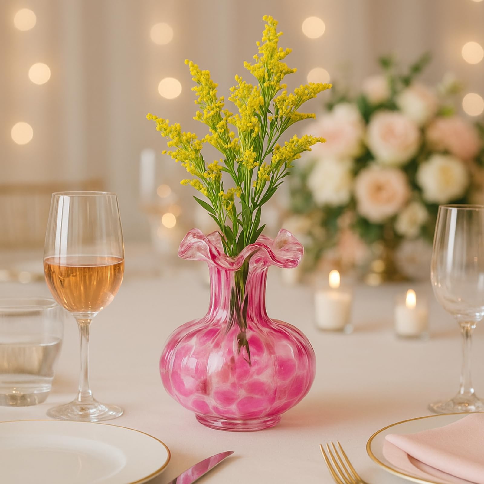Bring elegance to your space with this pink glass vase, a sakura-inspired bud flower holder featuring a ruffled rim and soft, curved silhouette. Its translucent finish and cherry blossom style add a gentle glow, perfect for spring centerpiece or romantic tabletop decor. Measuring 6.5 inches tall and 4.33 inches wide, this small yet versatile vase fits effortlessly on mantels, shelves, or coffee tables. Ideal for both fresh and faux floral arrangements, it offers a beautiful way to display roses, peonies, or dried blooms. The clear artisan design blends vintage and modern aesthetics, making it a graceful home accent and a thoughtful gift for weddings, brunches, or any special occasion.