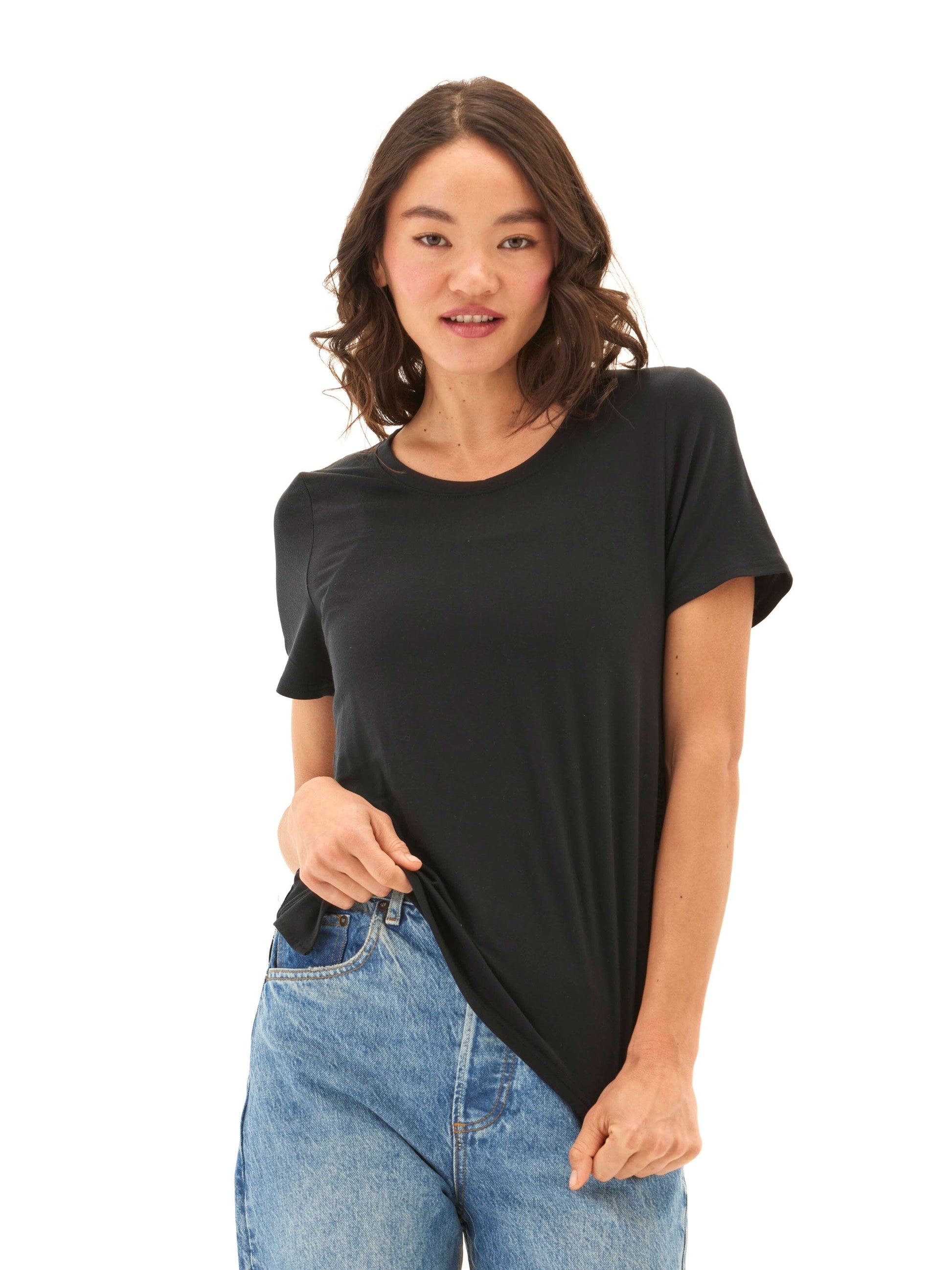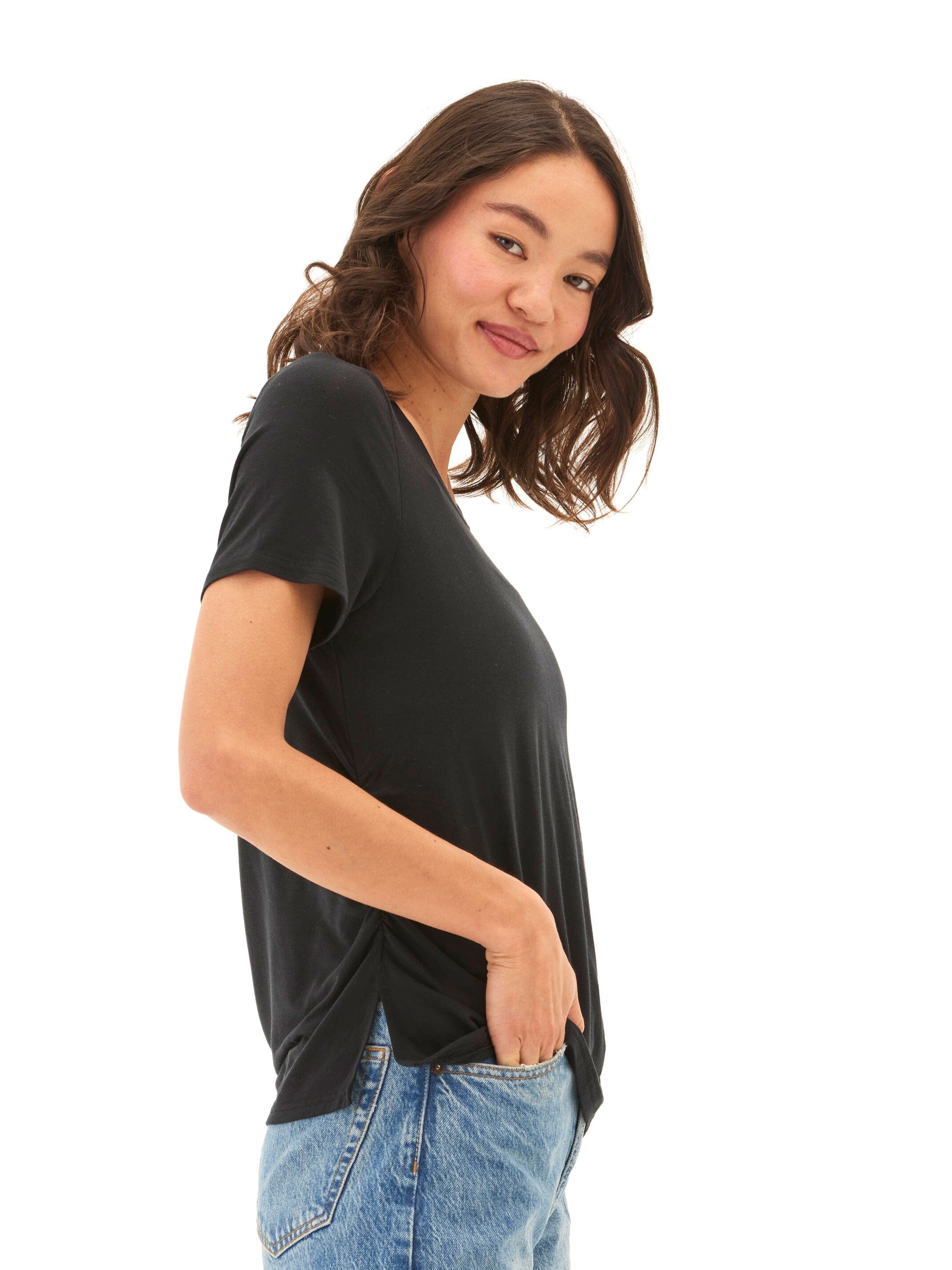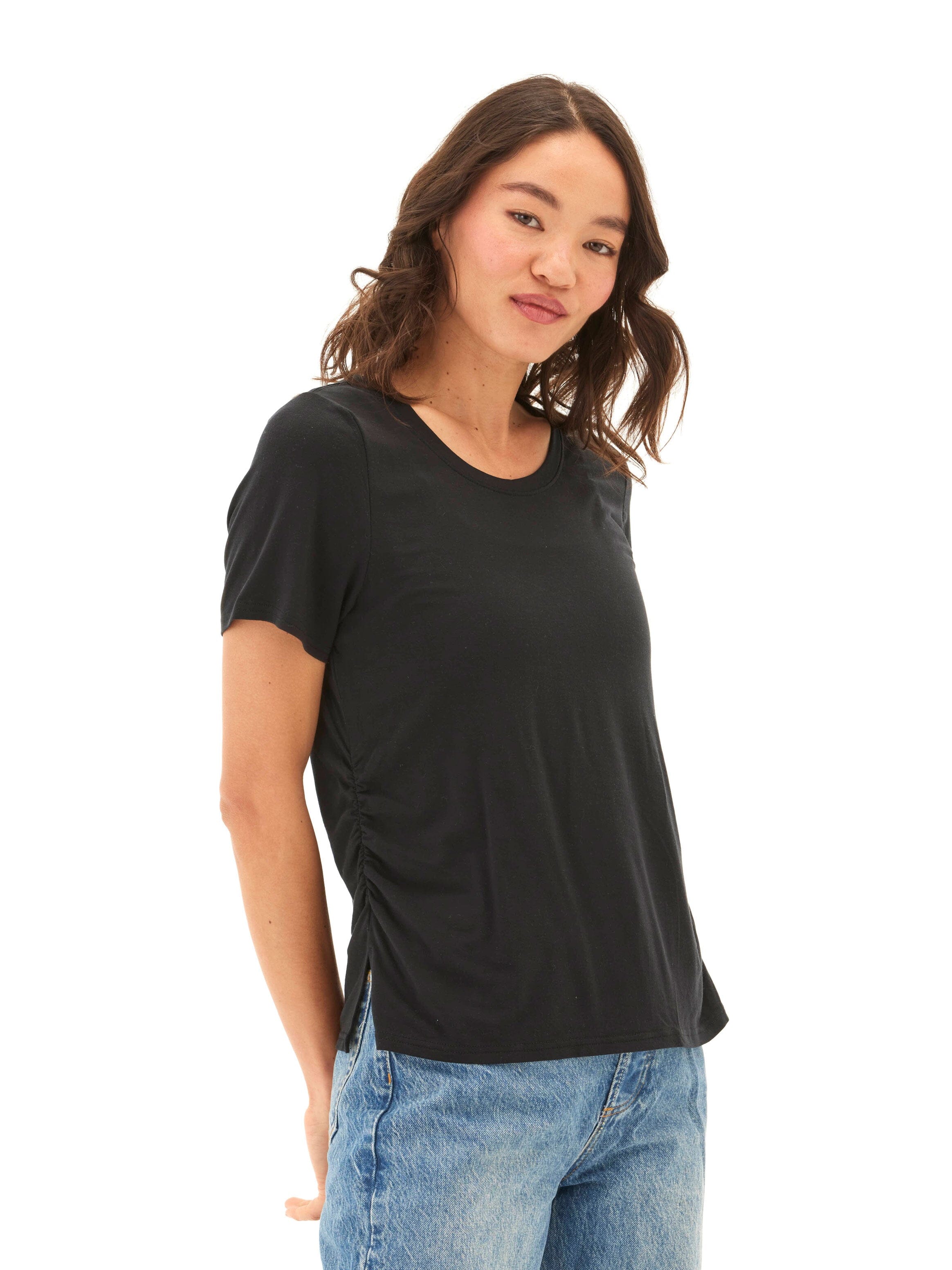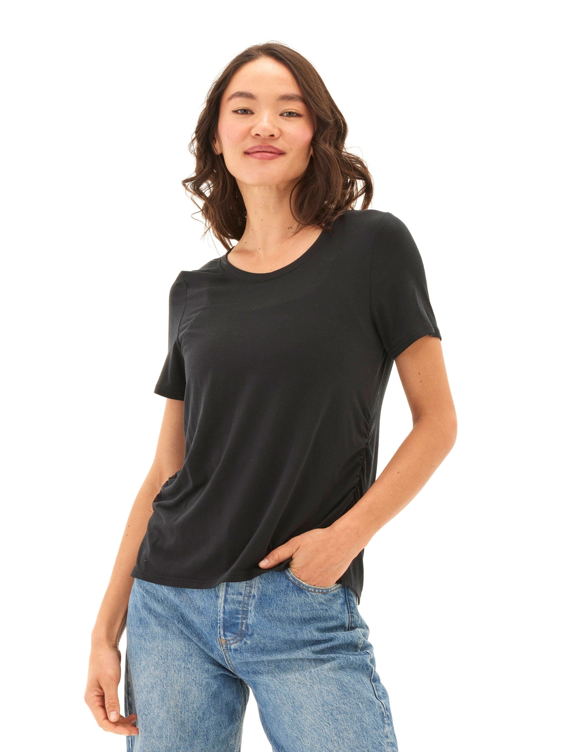 Made from our ultra-soft and breathable TENCEL™ jersey, this tee features subtle side ruching that creates a body-skimming shape without clinging. With a classic crew neckline and an easy drape, it’s a versatile staple you’ll reach for day after day—elevated enough to dress up, effortless enough to keep casual.